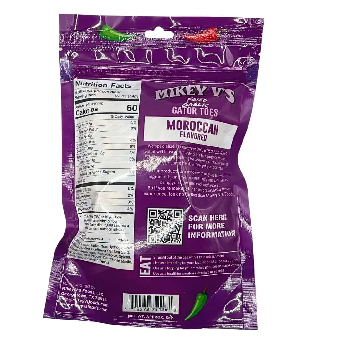 Perfect for adding a touch of bold flavor to any dish or simply snacking on its own, our Moroccan Spice Gator Toes are a must-have for any foodie.