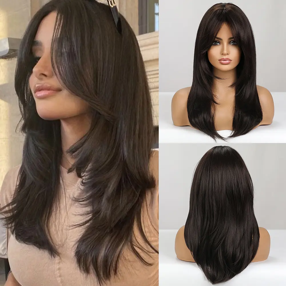 [Elegant Hair] Highlight Brown Layered Wig Straight Wear and Go Synthetic Wig High Quality Glueless Wigs for Women Heat Resistant Fiber Daily Use Women's Day