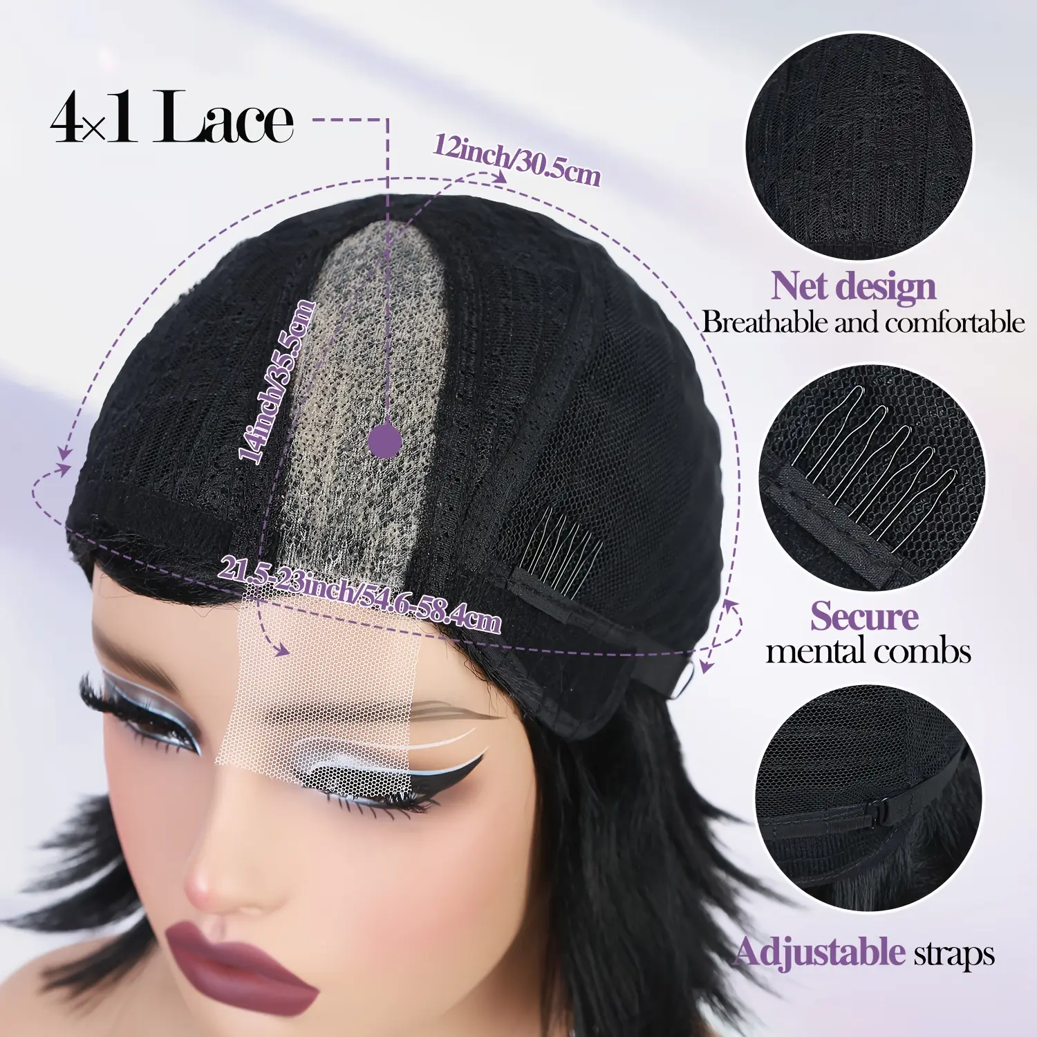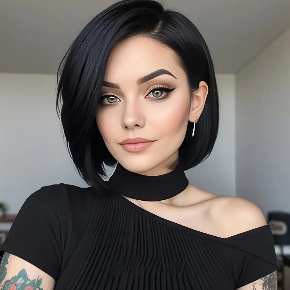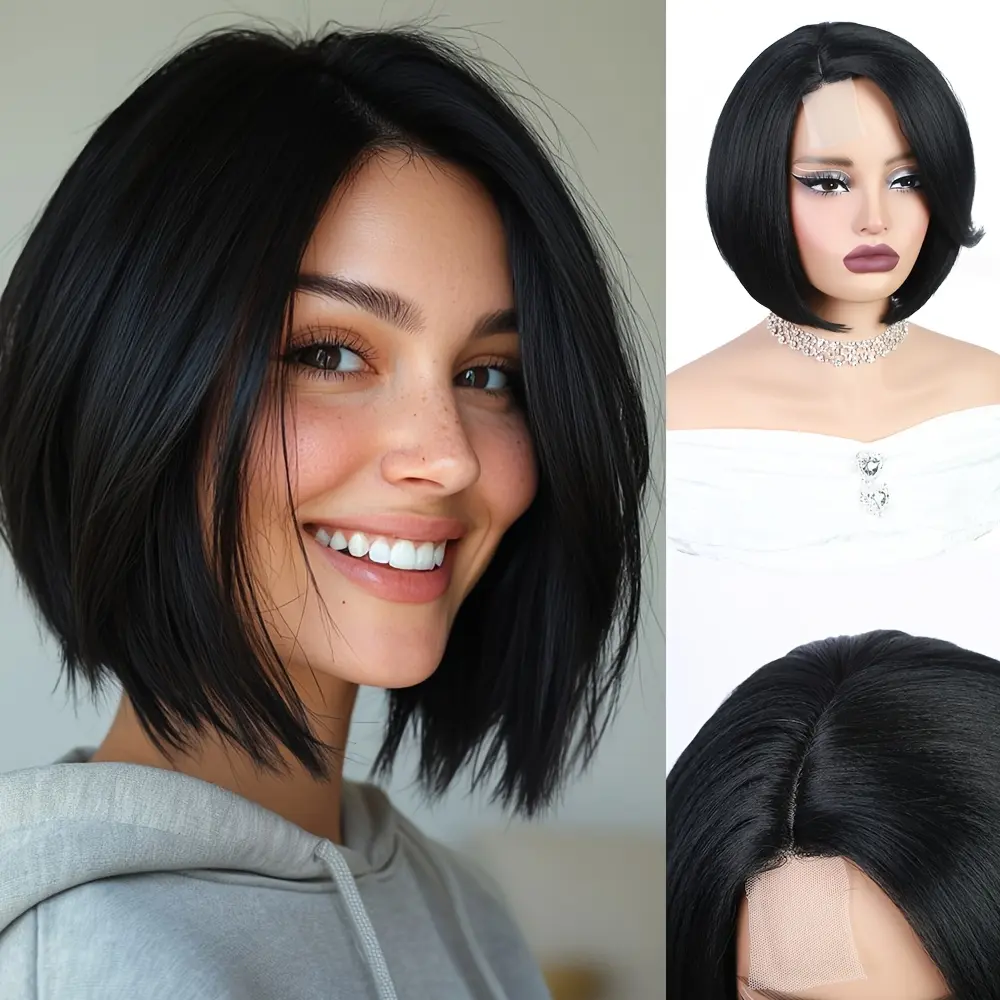 Synthetic Short Bob Wig with a 4X1 Lace Side Part, Designed for Women. This Straight Black Wig Is Heat Resistant And Suitable for Everyday Wear, Parties, Or Cosplay