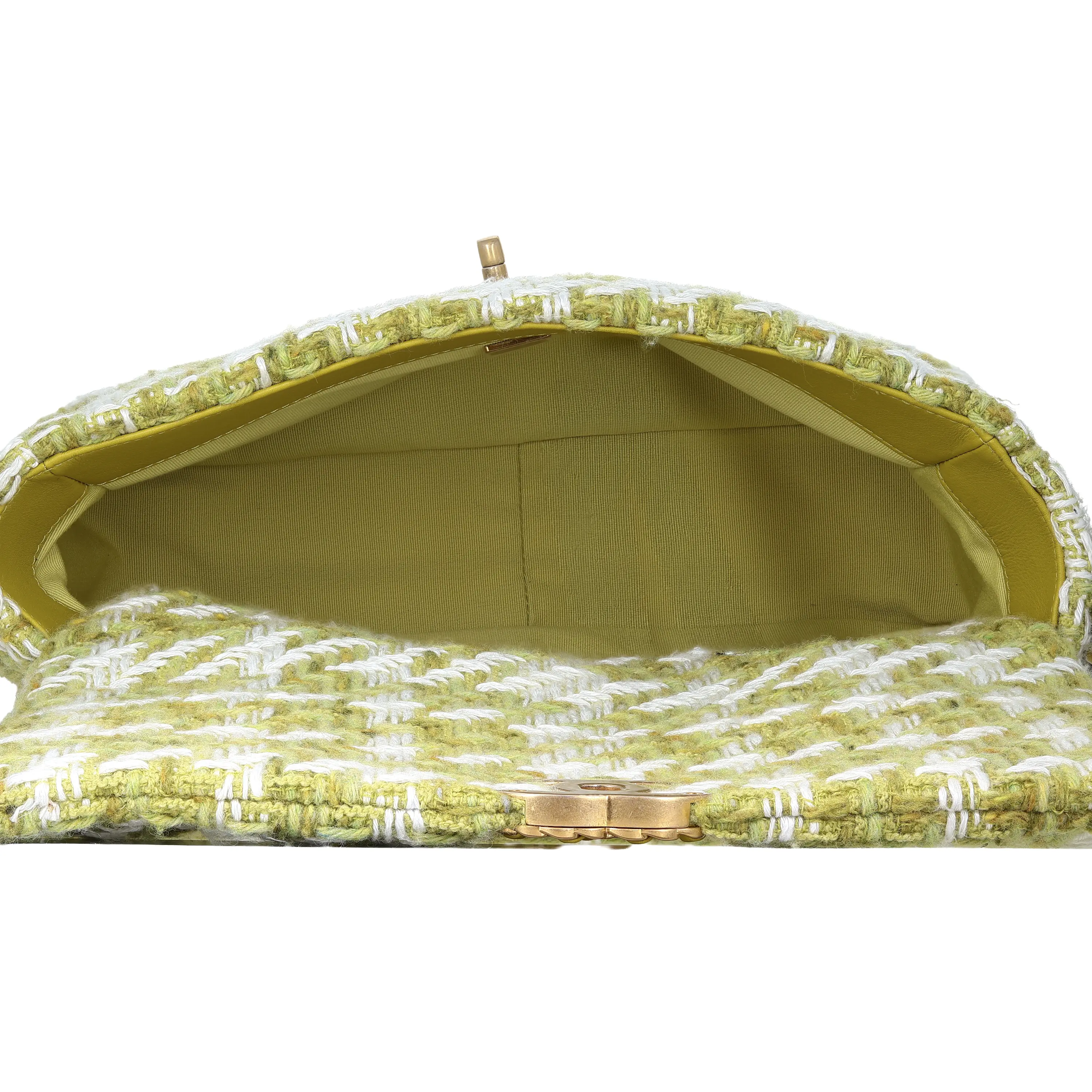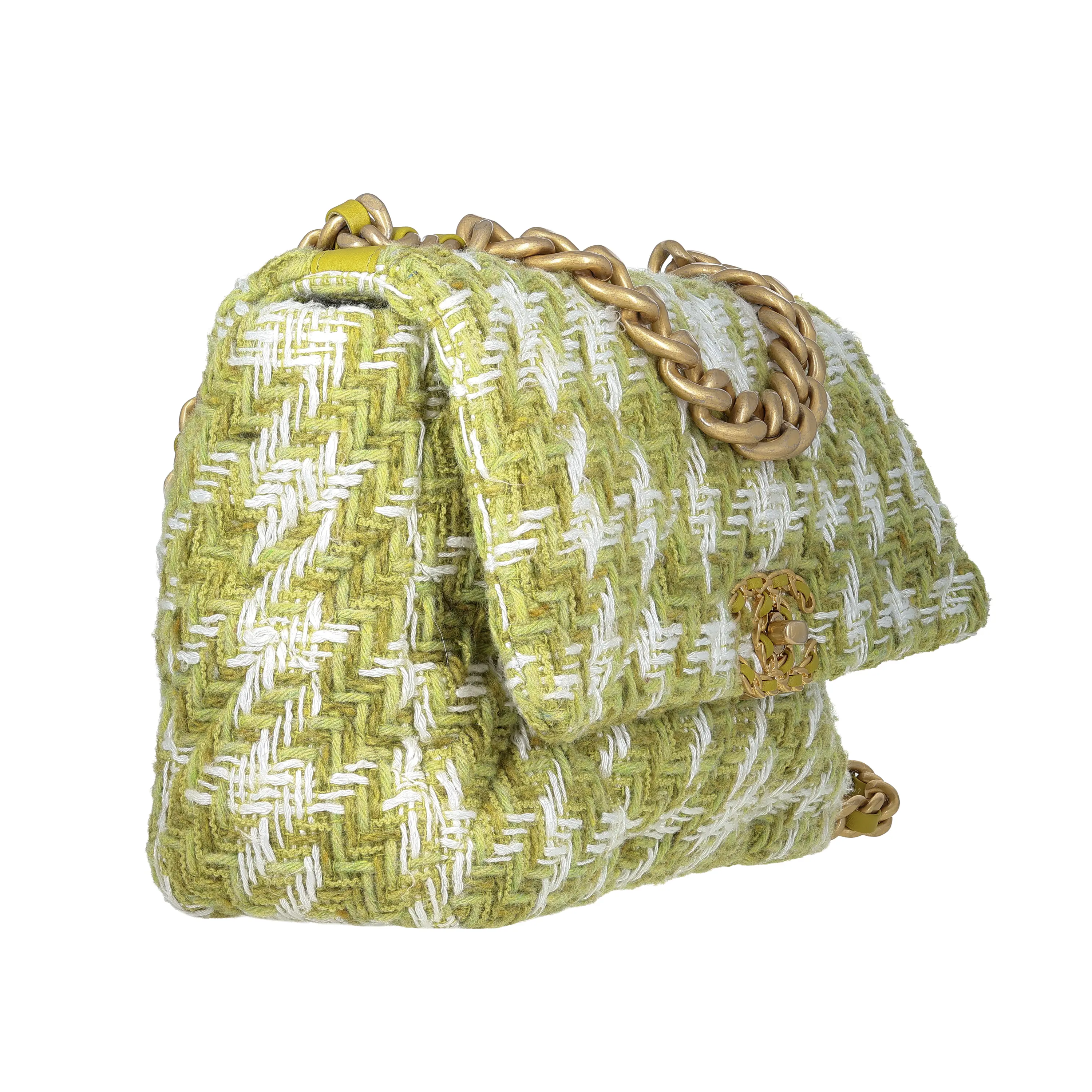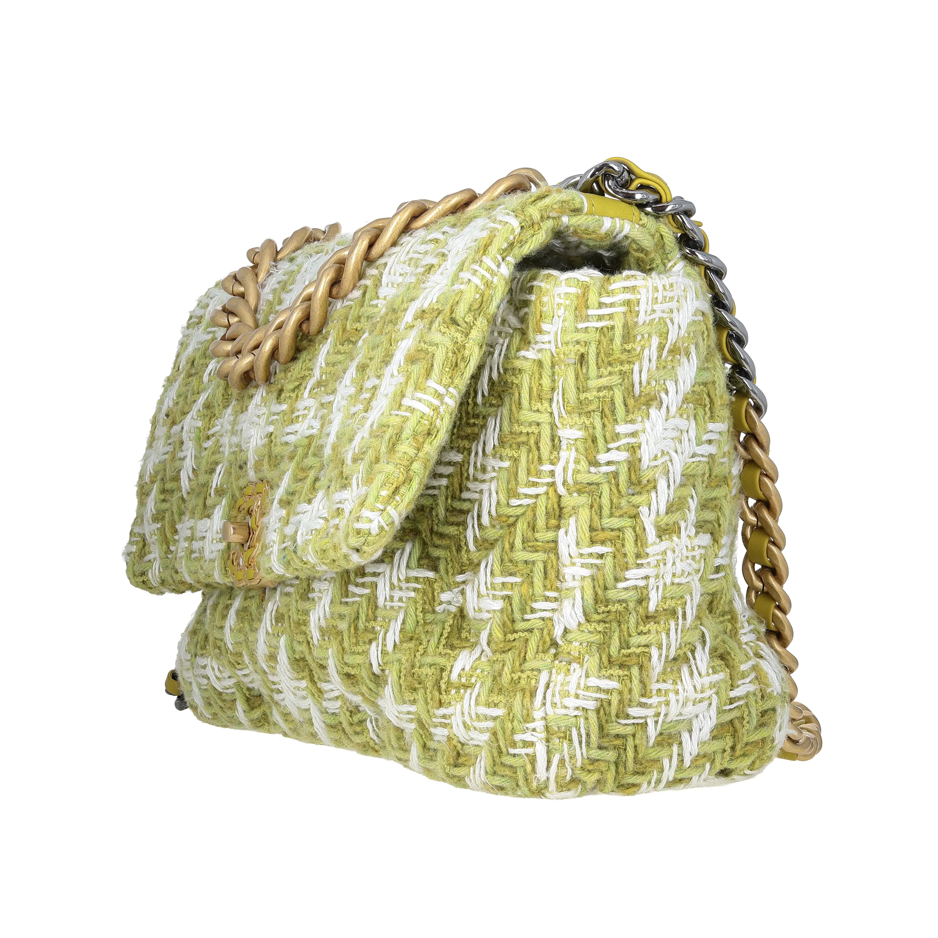 This is a pre-owned Chanel 19 Flap Handbag. It is green woven tweed with multitone hardware. It is a size large. It measures 11"x4"x8". Drop: 4"-14.5". It is in excellent condition. It includes bag only.