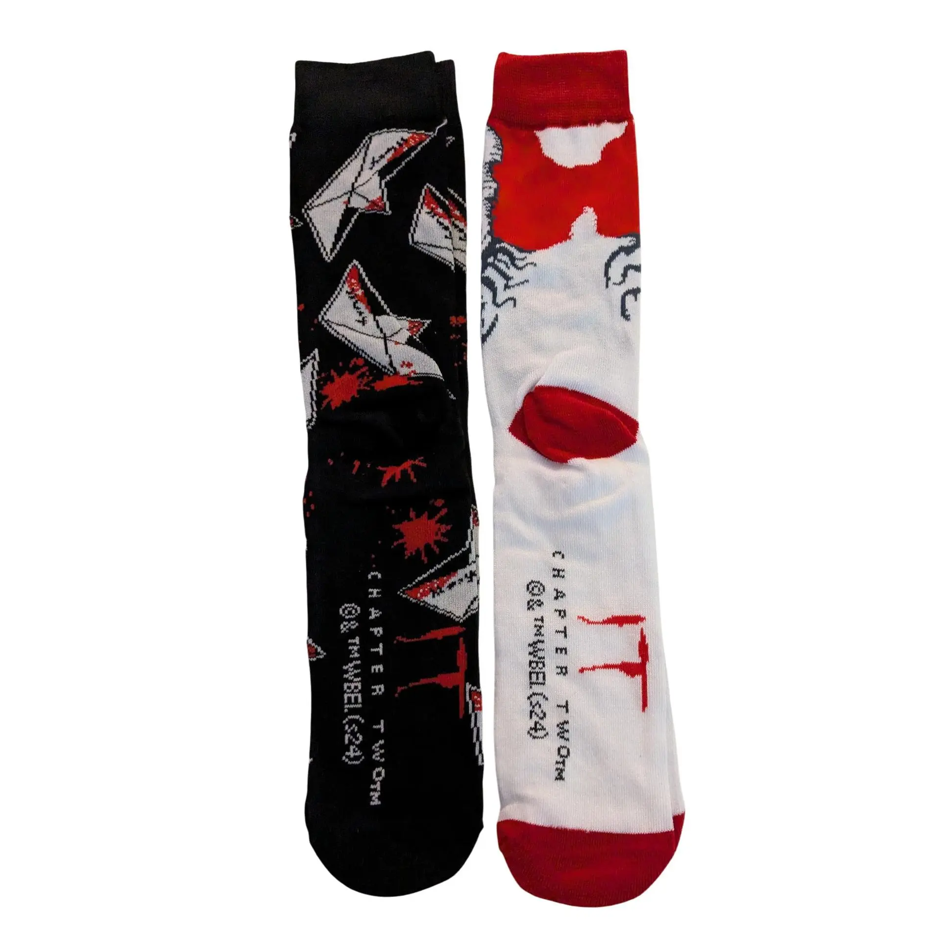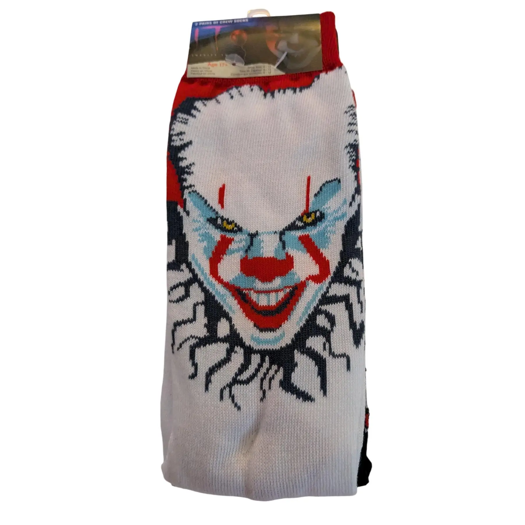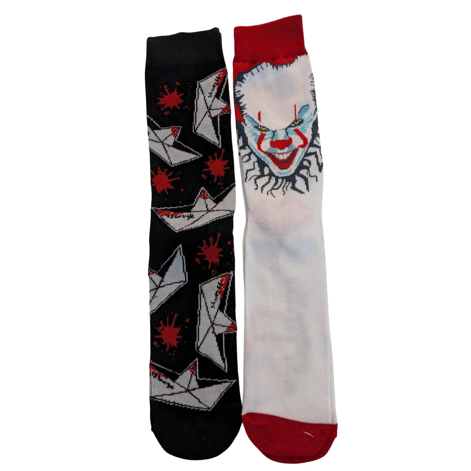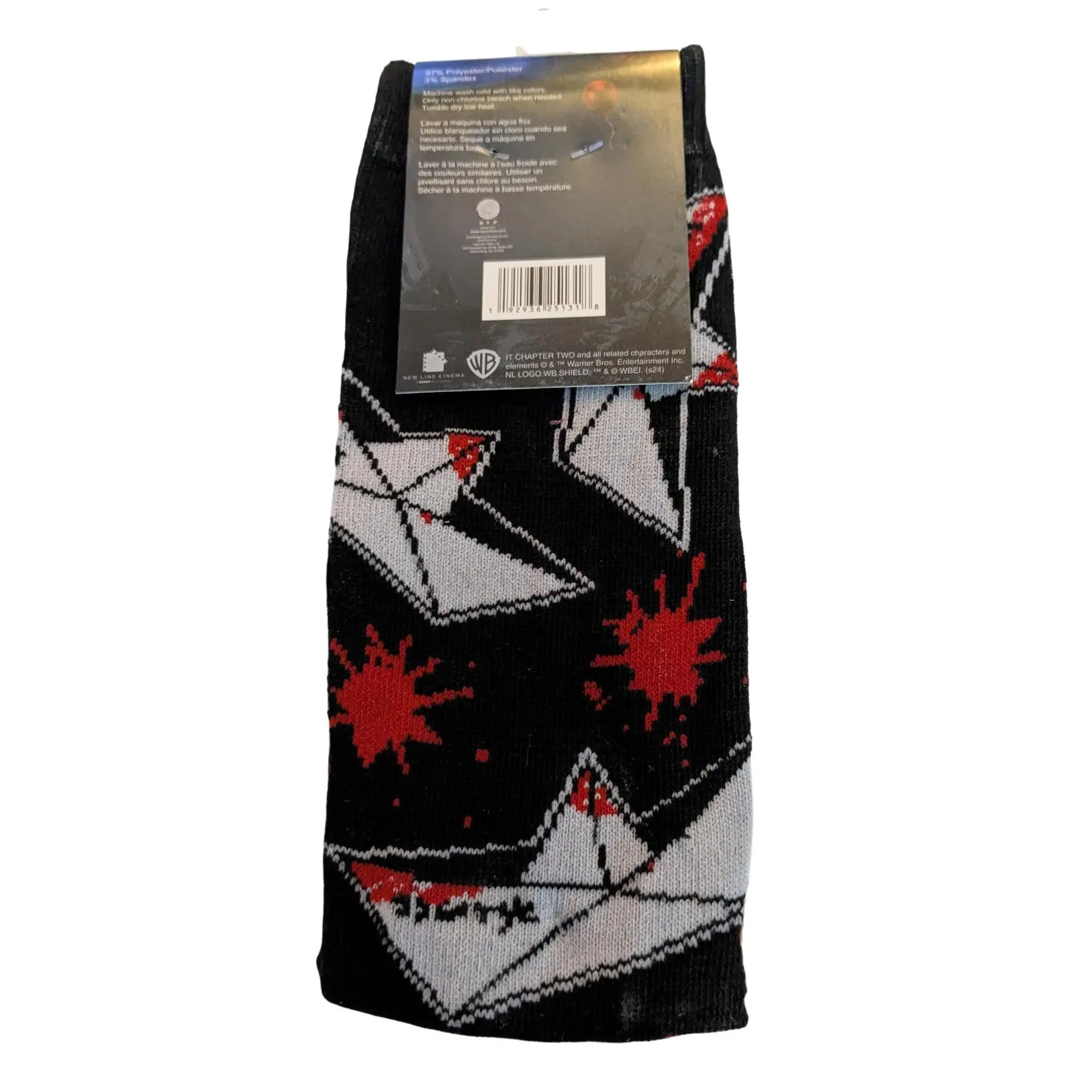 These are officially licensed crew Warner Bros. socks. Fits men's shoe size 6-12 (sock size 10-13) or women's 7.5-14. You'll get one pair with Pennywise the killer clown and one pair with Georgie's blood-stained boat( you'll float too! ). Made of 97% polyester and 3% spandex: Photos show the front and back of the socks.