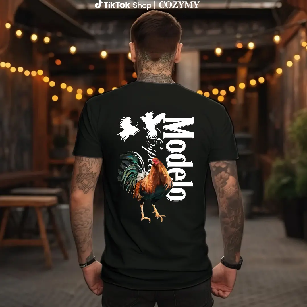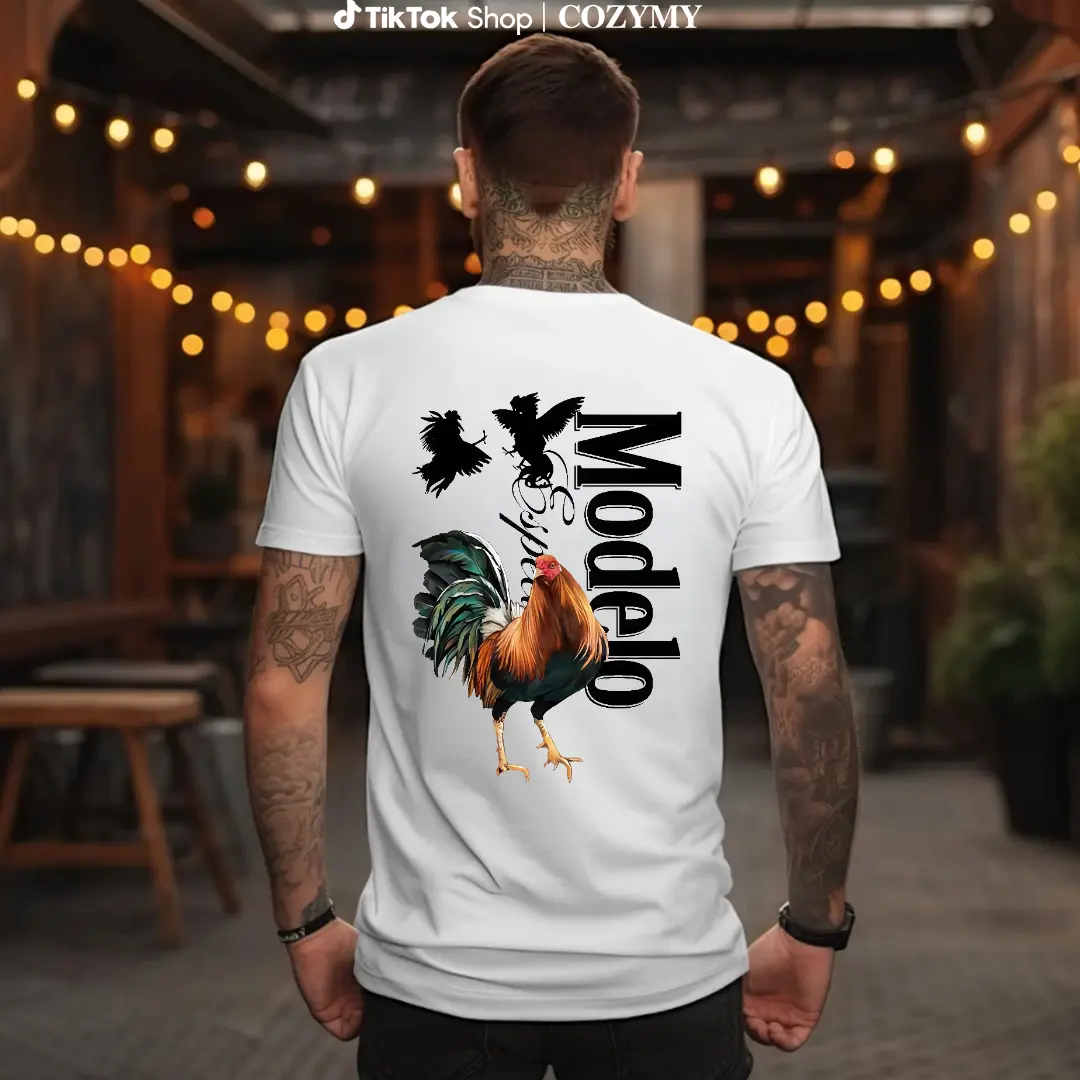 Modelo Rooster T-Shirt - Bold Rooster Graphic With Dynamic Fighting Cocks , Perfect For Beer Lovers And Fiesta Enthusiasts , Casual Daily Wear , Relaxed Fit , Unisex Style , Unique Modelo Design Crewneck Menswear Classic