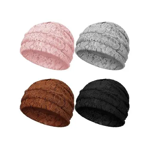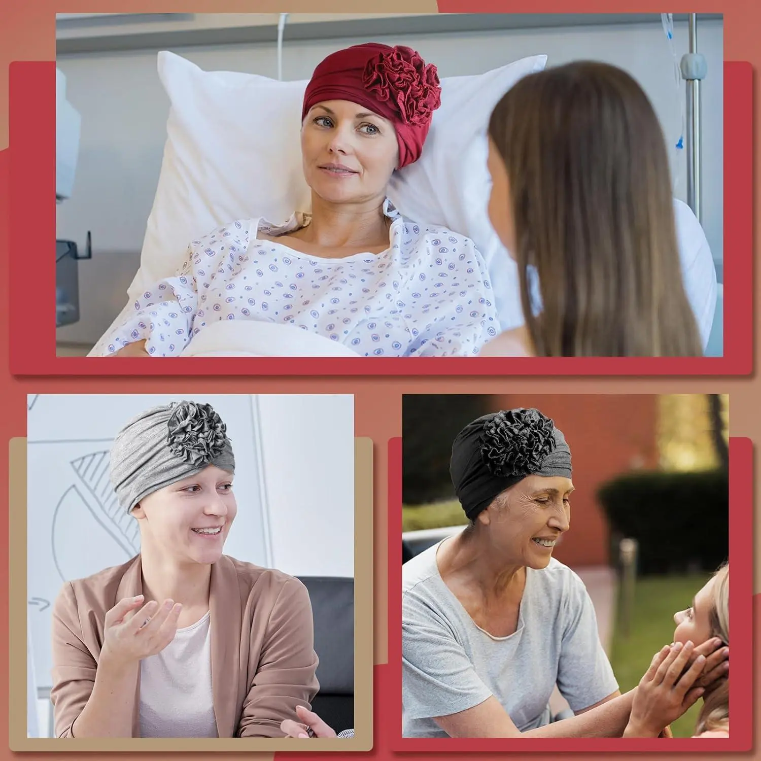 Women's Soft Slouchy Chemo Turban Headwear - 4 Pcs Set with Elastic Sleep Cap and Flower Design Comfortable Head Cover for Cancer Patients Sleep Wear