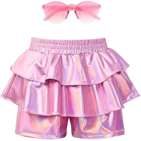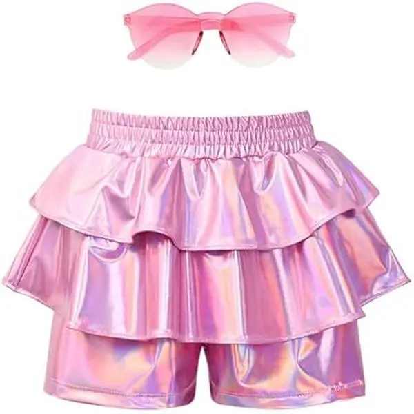 Girls' Pleated Metallic Shorts - Shiny Sparkle Ruffle Scooter Skater Dance Elastic Waist Rave Pants with Sunglasses for 6-13 Years Old, Perfect for Party, Performance, Casual Wear, Fashionable and Comfortable Kids' Clothing