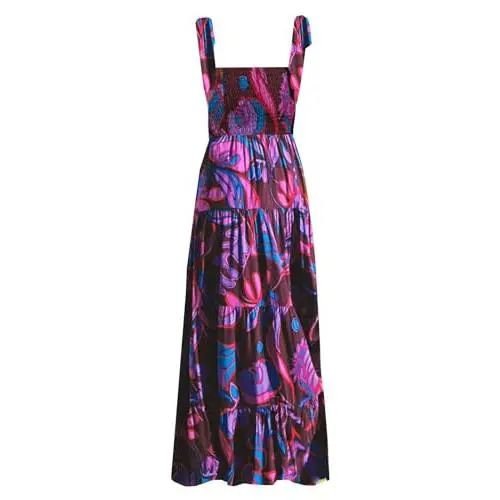 Women's Elegant Summer Boho Midi Dress with Square Neck Ruffle Tiered Flowy Smocked Design - Lightweight Breathable Sundress Perfect for Beach Vacation Party Casual Daily Wear Comfortable Fashion Style Ladies Clothing