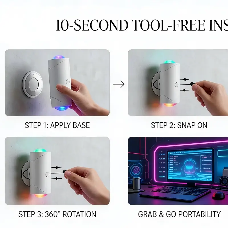 MOBILE MAGNETIC MOUNT & SIMPLE INSTALLSet up in moments with the included adhesive iron plates—no complicated wiring needed! The magnetic base allows you to effortlessly remove the light for charging or use as a handy emergency flashlight during blackouts.Pro Tip: For uneven walls or busy areas where it may be jostled, we suggest using a small screw through the metal plate for a sturdier grip.