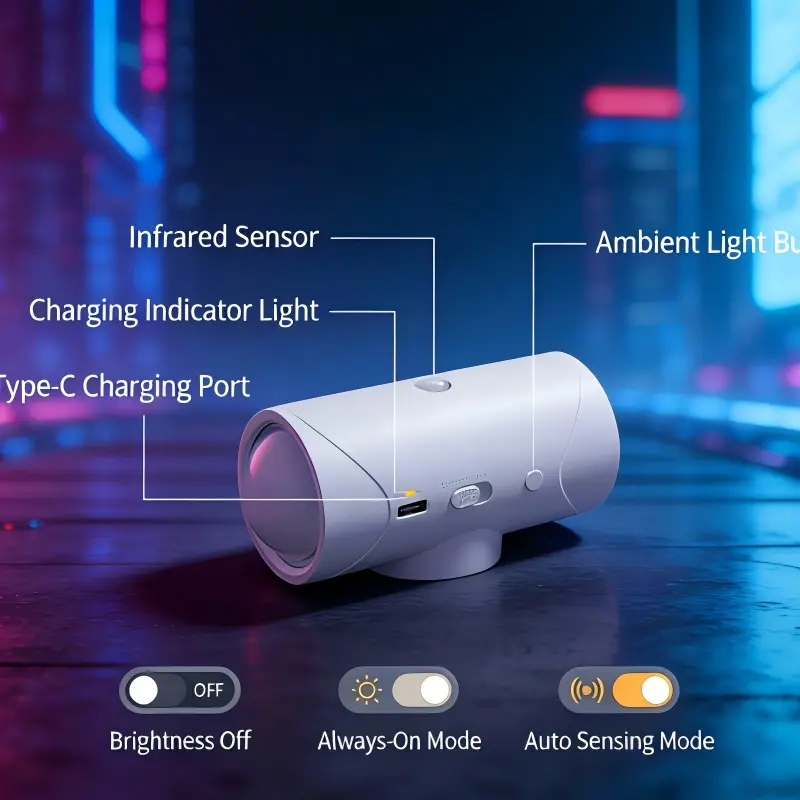 USB-C RECHARGEABLE (SAVE ON BATTERIES)No more wasting money on AAA batteries! This cordless indoor night light is equipped with a built-in battery and speedy USB-C charging (cable included). Enjoy long-lasting use for weeks in “AUTO” motion-sensing mode.Note: “Always-ON” mode is for temporary ambiance and will need recharging after several hours of continuous use.