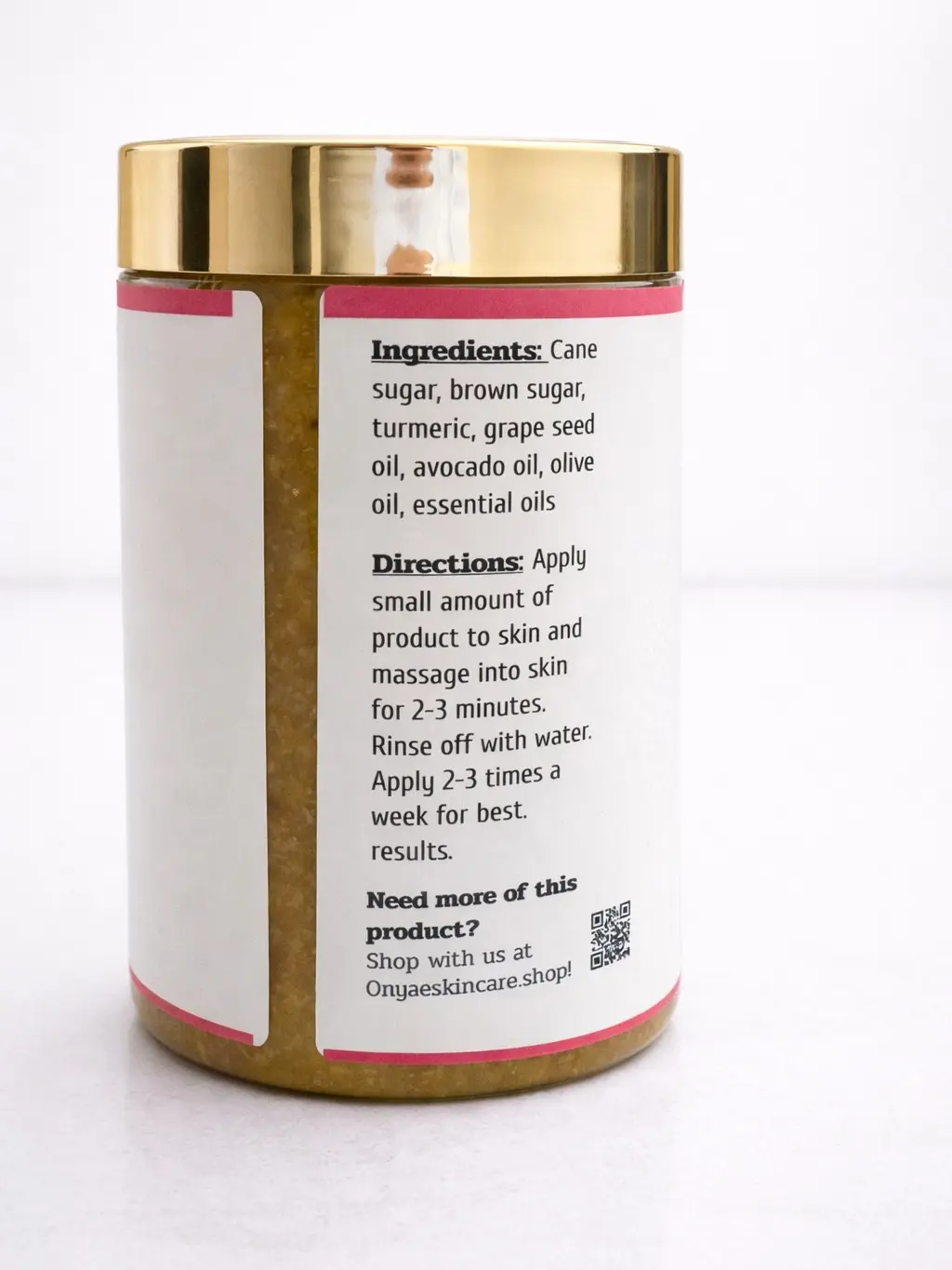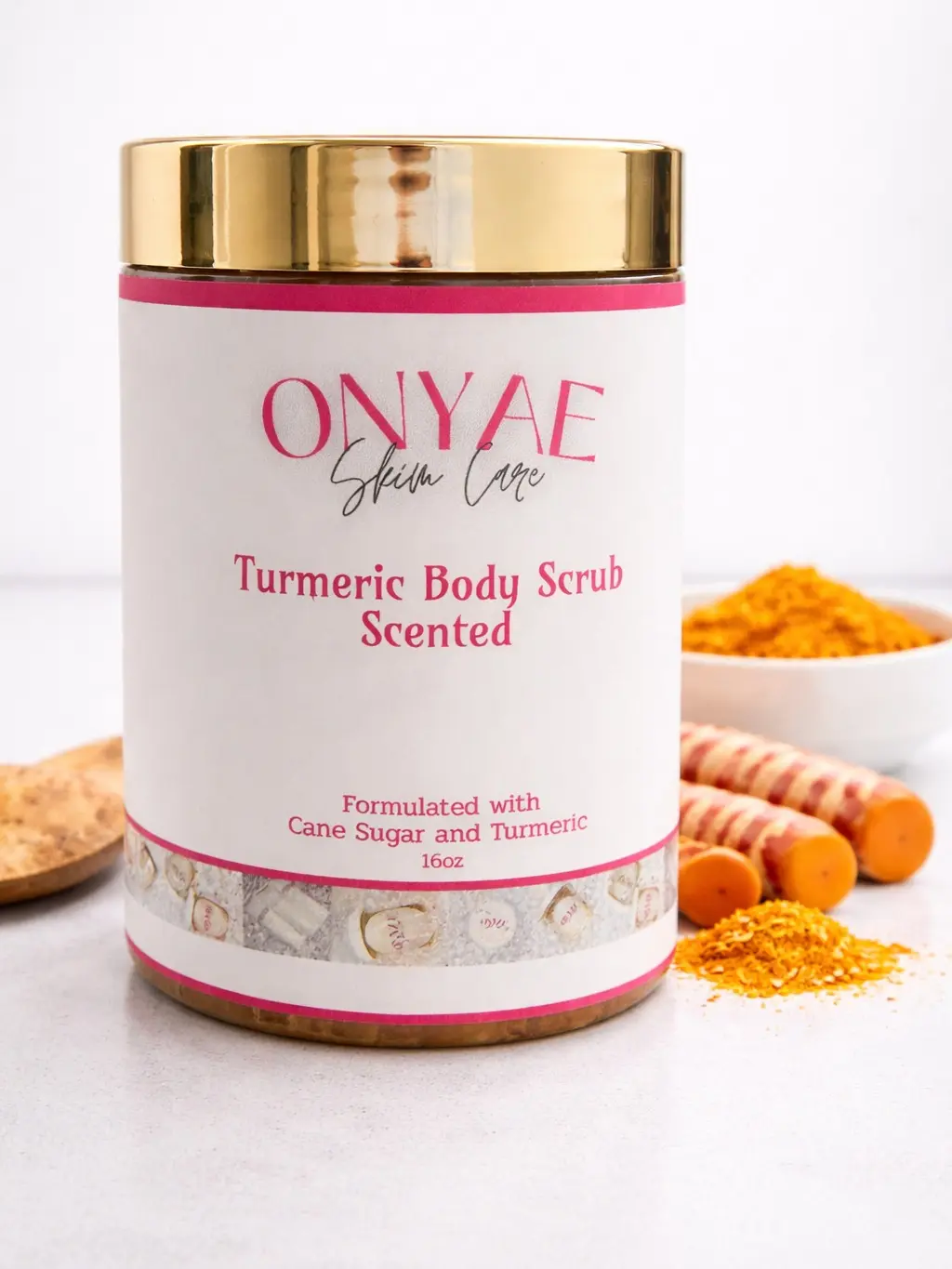 Indulge in the luxurious ONYAE Turmeric Scrub, crafted with the finest cane sugar and turmeric to exfoliate and rejuvenate your skin. Infused with a delightful scent, this scrub will leave your skin feeling soft, smooth, and radiant. Onyae Turmeric Scrub is great for hyper pigmentation, discoloration, dry, and uneven skin. Turmeric can provide a natural glow to your skin due to the anit-inflammatory and antioxidant properties it provides. The face, underarms, and inner thighs are popular problem areas that the Onyae Turmeric Scrub can be used for.