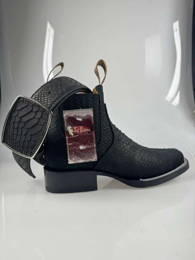 • Color: Black • Material: -textured leather finish (exotic style) • Brand: La Sierra • Toe Shape: Square Toe • Sole: Leather sole with premium finish • Comfortable and durable construction • Includes matching belt with metal buckle