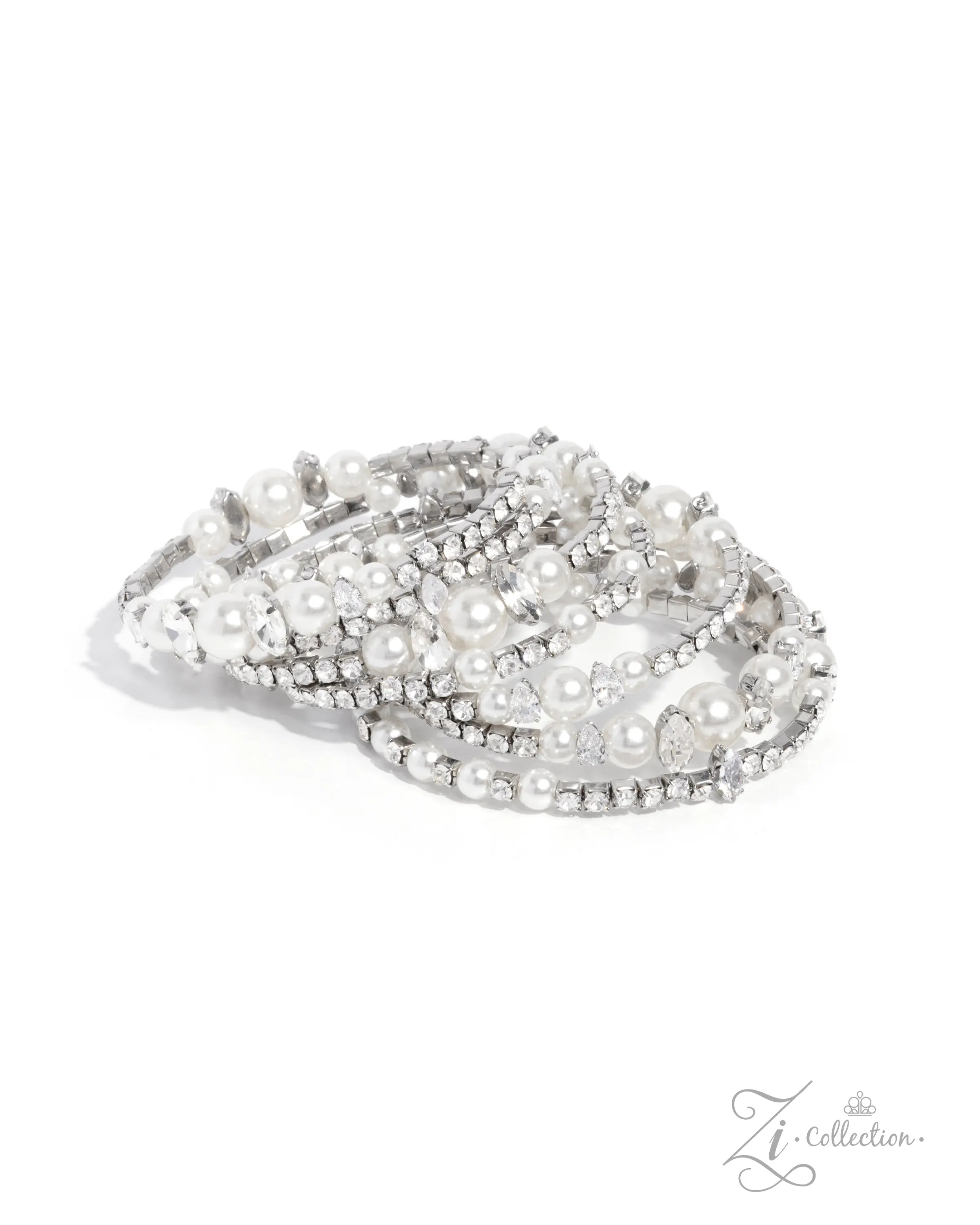 Featuring various dazzling dimensions, a collection of glossy white pearls, elevated-pronged white teardrop and marquise-cut gems, and sparkling white gems in squared silver fittings is threaded along an invisible wire that coils around the wrist. Each flick of the wrist captures a different detail, showcasing the infinity wrap’s irresistible shimmer and range of refinement. Sold as one individual bracelet.