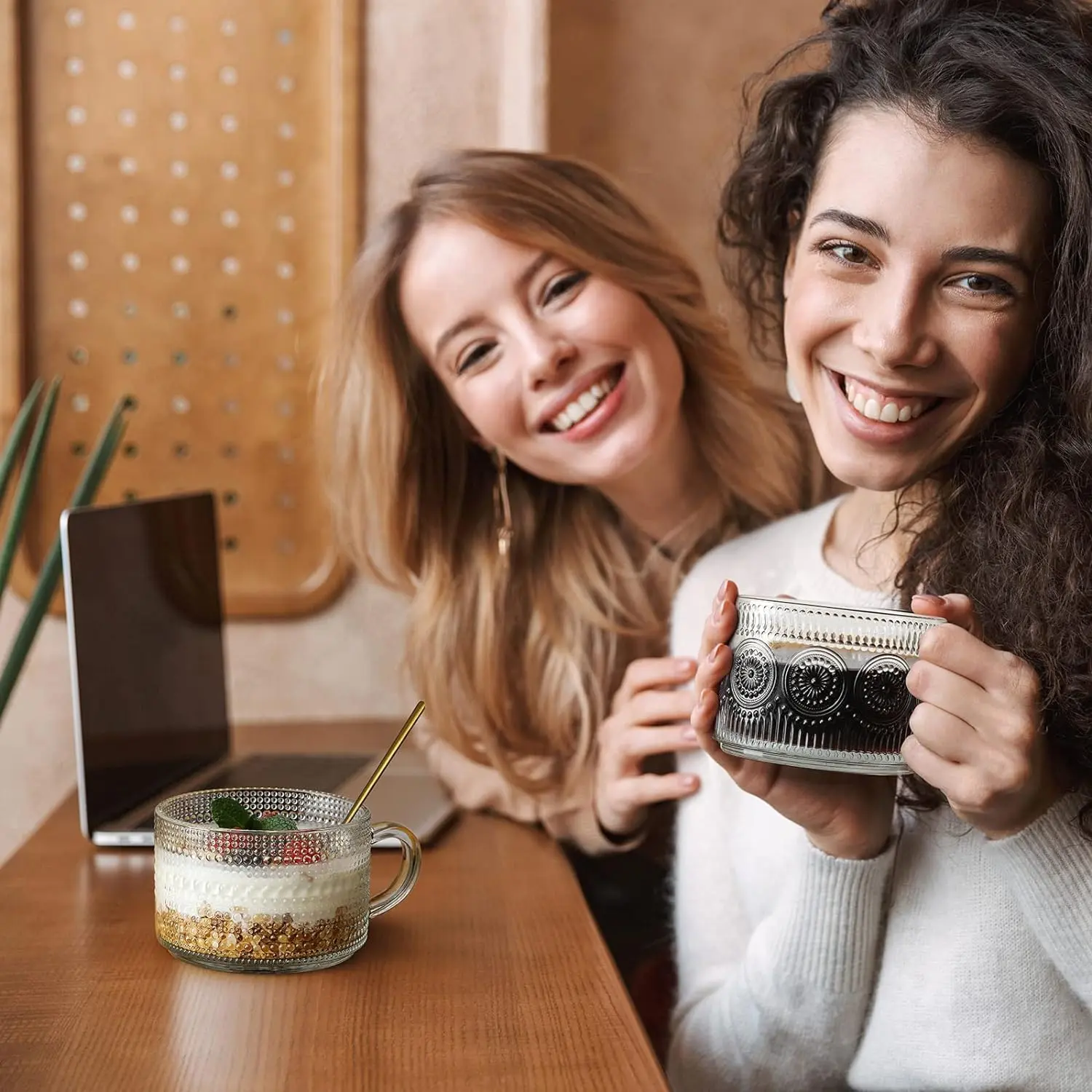 Classic mug shape in crystal glass with a round curved handle. Sunflower mugs have mandala-like borders. Raindrop mugs feature retro-style patterns. Pair with metal spoons and bamboo lids for an elegant look.