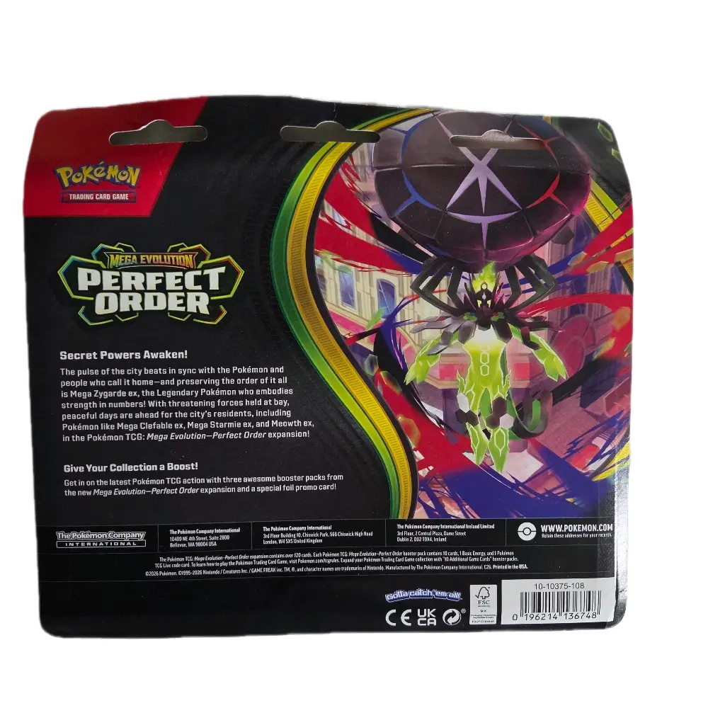 ·Card Text:Secret Powers Awaken!The pulse of the city beats in sync with the Pokémon and people who call it home—and preserving the order of it all is Mega Zygarde ex, the Legendary Pokémon who embodies strength in numbers! With threatening forces held at bay, peaceful days are ahead for the city's residents, including Pokémon like Mega Clefable ex, Mega Starmie ex, and Meowth ex, in the Pokémon TCG: Mega Evolution—Perfect Order expansion! Each blister comes with 3 booster packs and a promotional card.