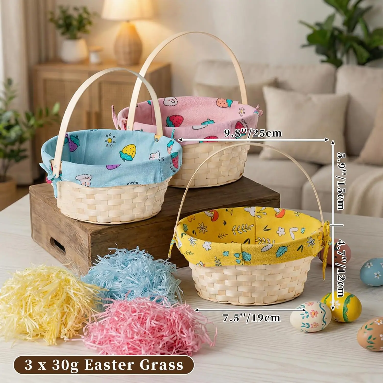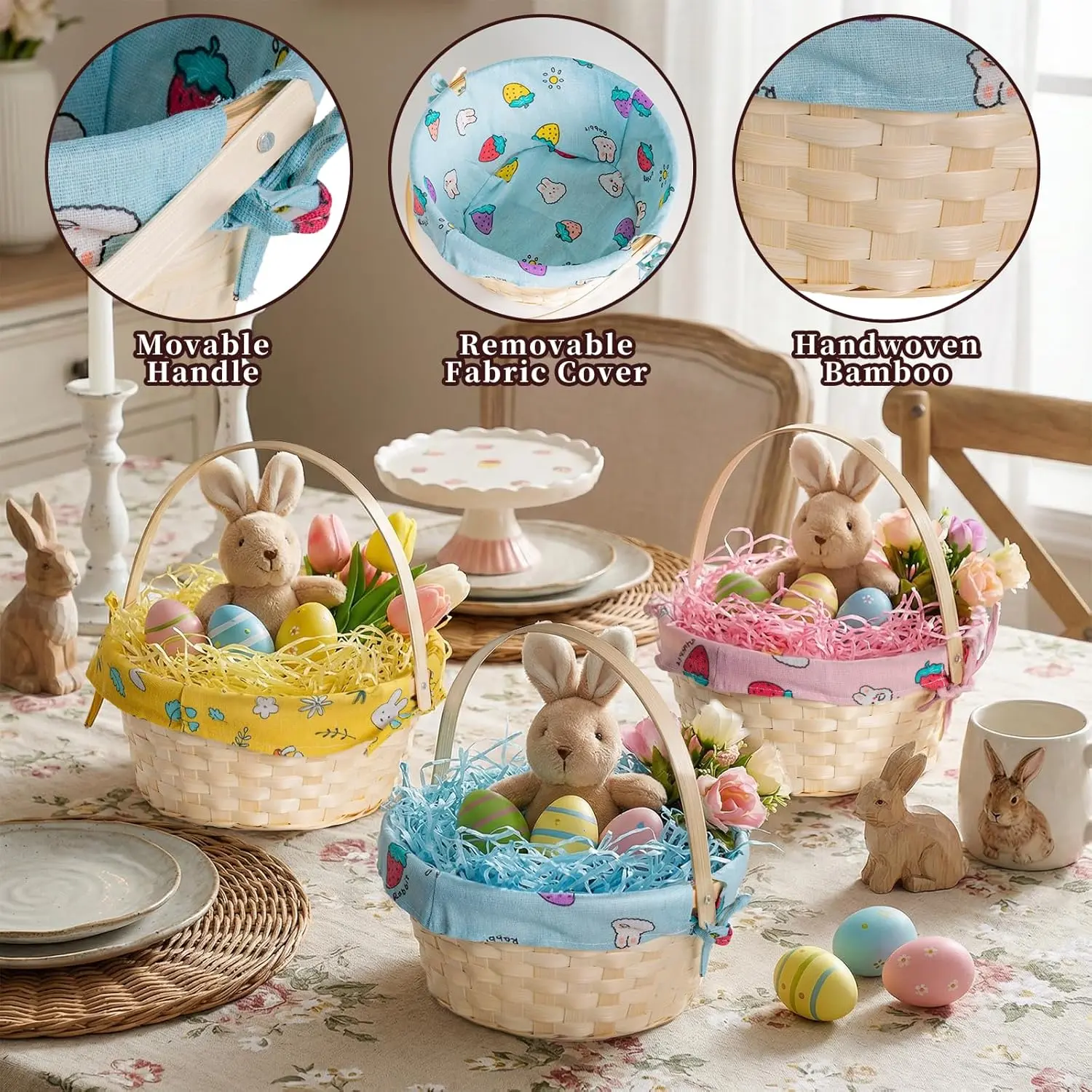 This set includes 3PCS of natural bamboo baskets, perfect for Easter egg hunts, picnics, and seasonal decorations. Each basket comes with a removable bunny fabric liner and raffia grass. Available in yellow, pink, and blue, these baskets add a festive touch to your celebrations. Ideal for holding candy and other treats.