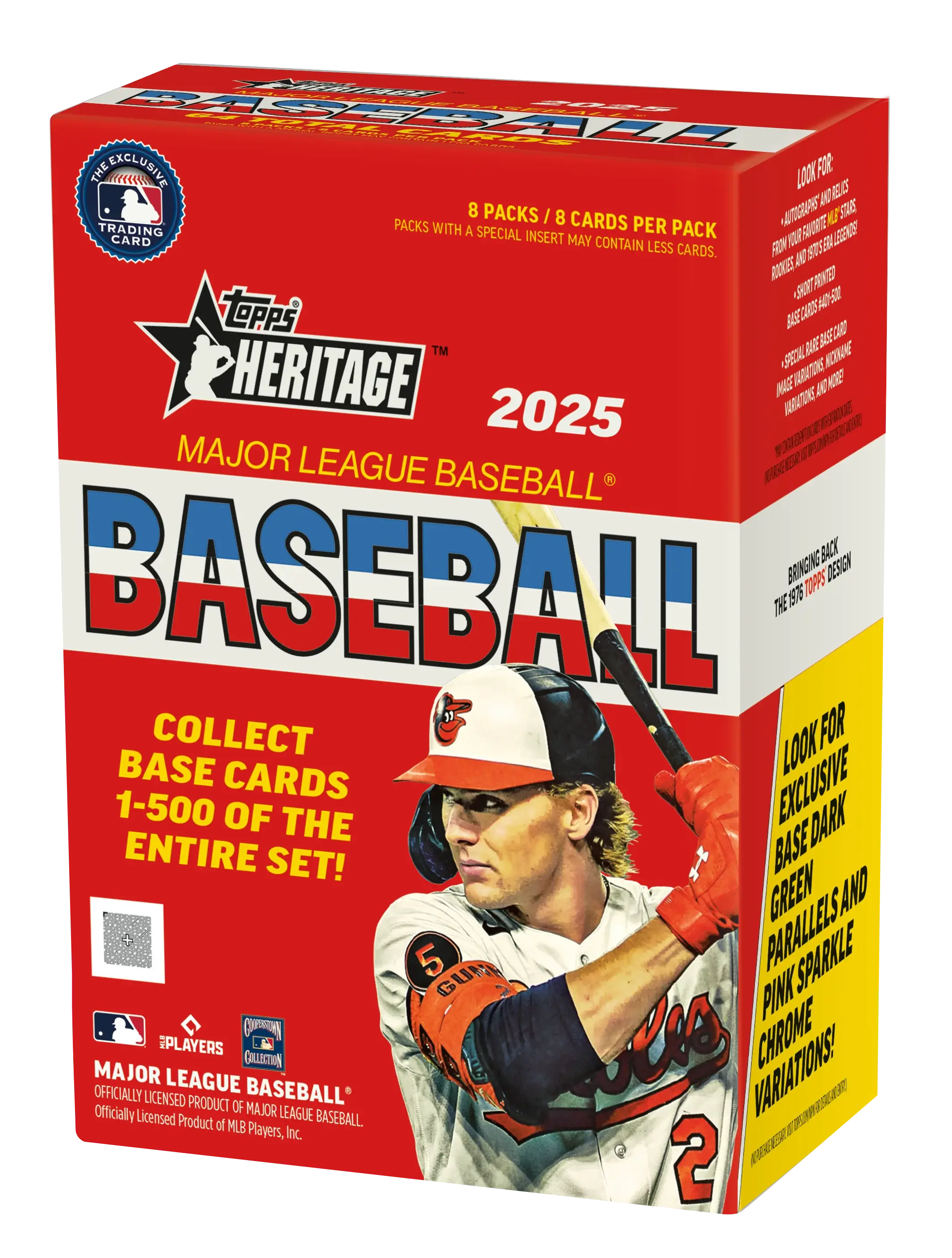 2025 Topps Heritage Baseball Value Box delivers classic Topps nostalgia with a tribute to the 1976 Heritage design and the American Bicentennial theme, packed with an exciting mix of base cards, parallels, inserts and more from a 500-card set celebrating baseball history.