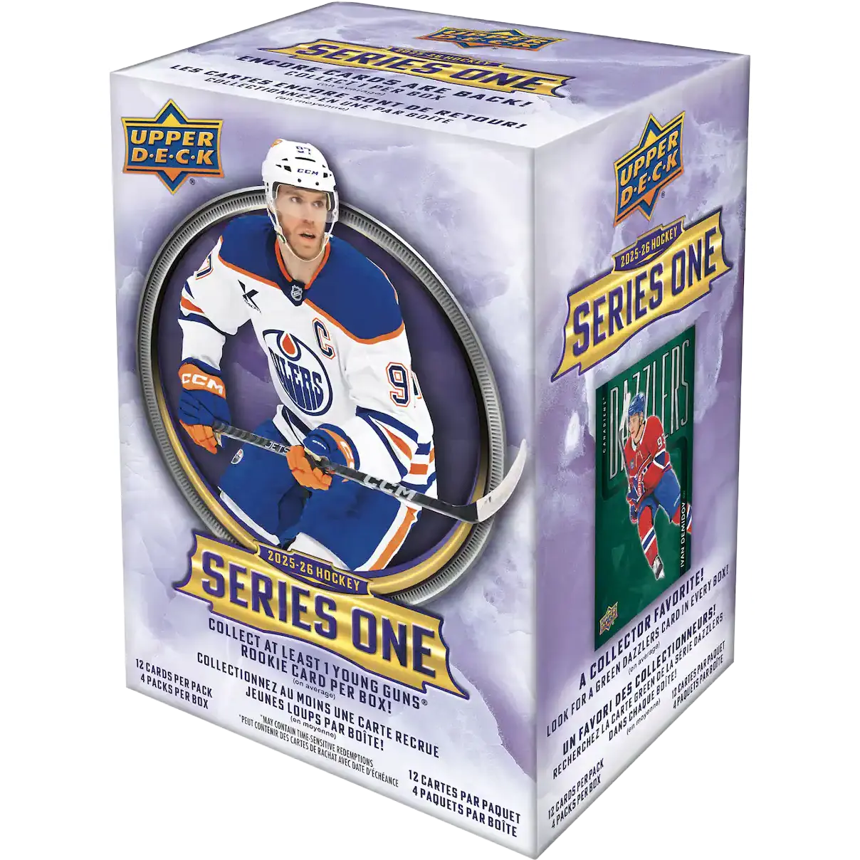 Upper Deck presents the 2025-26 Series One Hockey trading card collection! Each Blaster Box contains 4 packs with 12 cards per pack — collect from the first 250 cards of the 2025-26 Upper Deck Base Set (veterans, checklist and Young Guns® rookies) and find at least one Young Guns® card per box on average! Look for Green Dazzlers and OPC Glossy cards, plus popular returning inserts like UD Canvas, Portraits, Encore and more, and keep an eye out for Outburst Silver parallels and other rare parallels! Content may vary — collect them all!