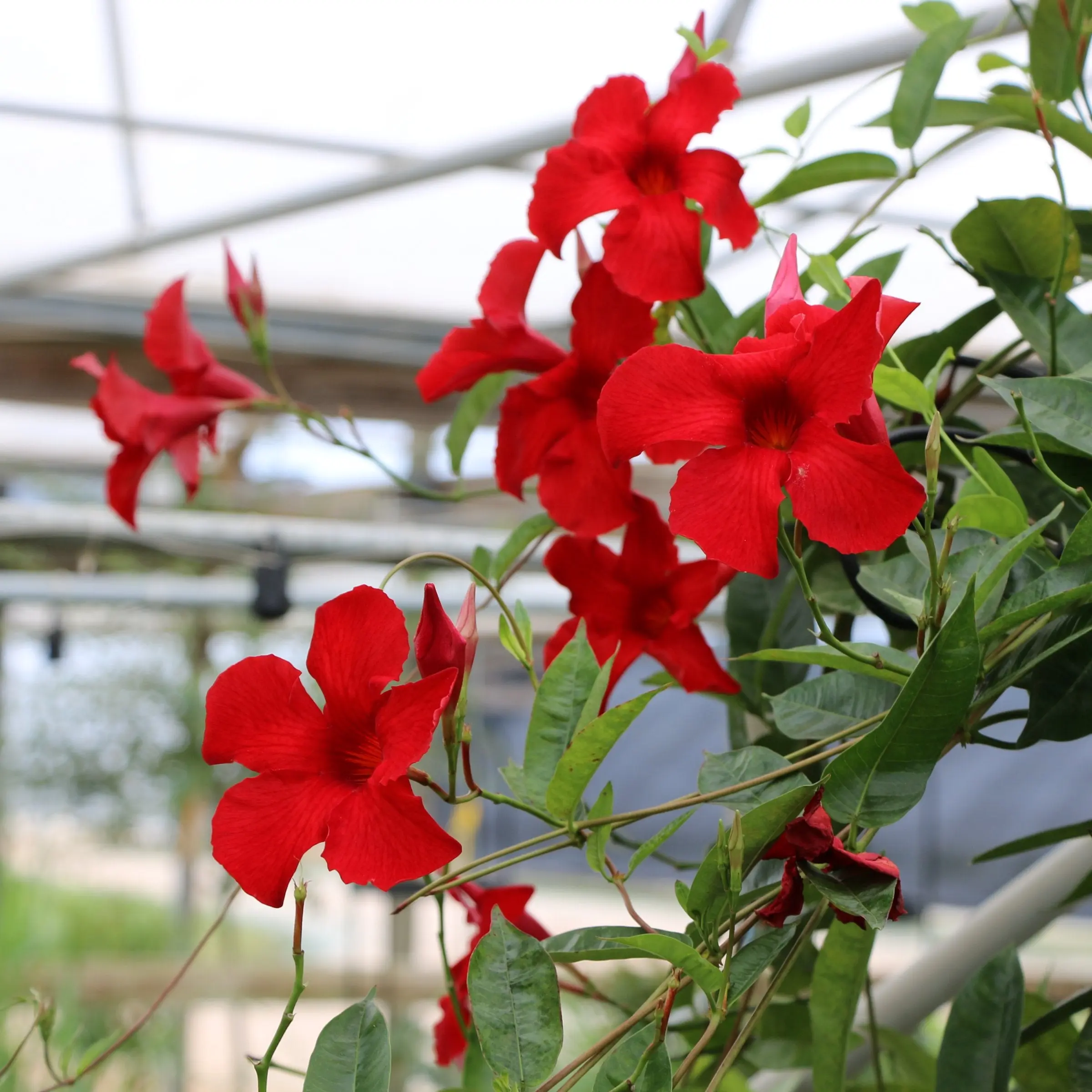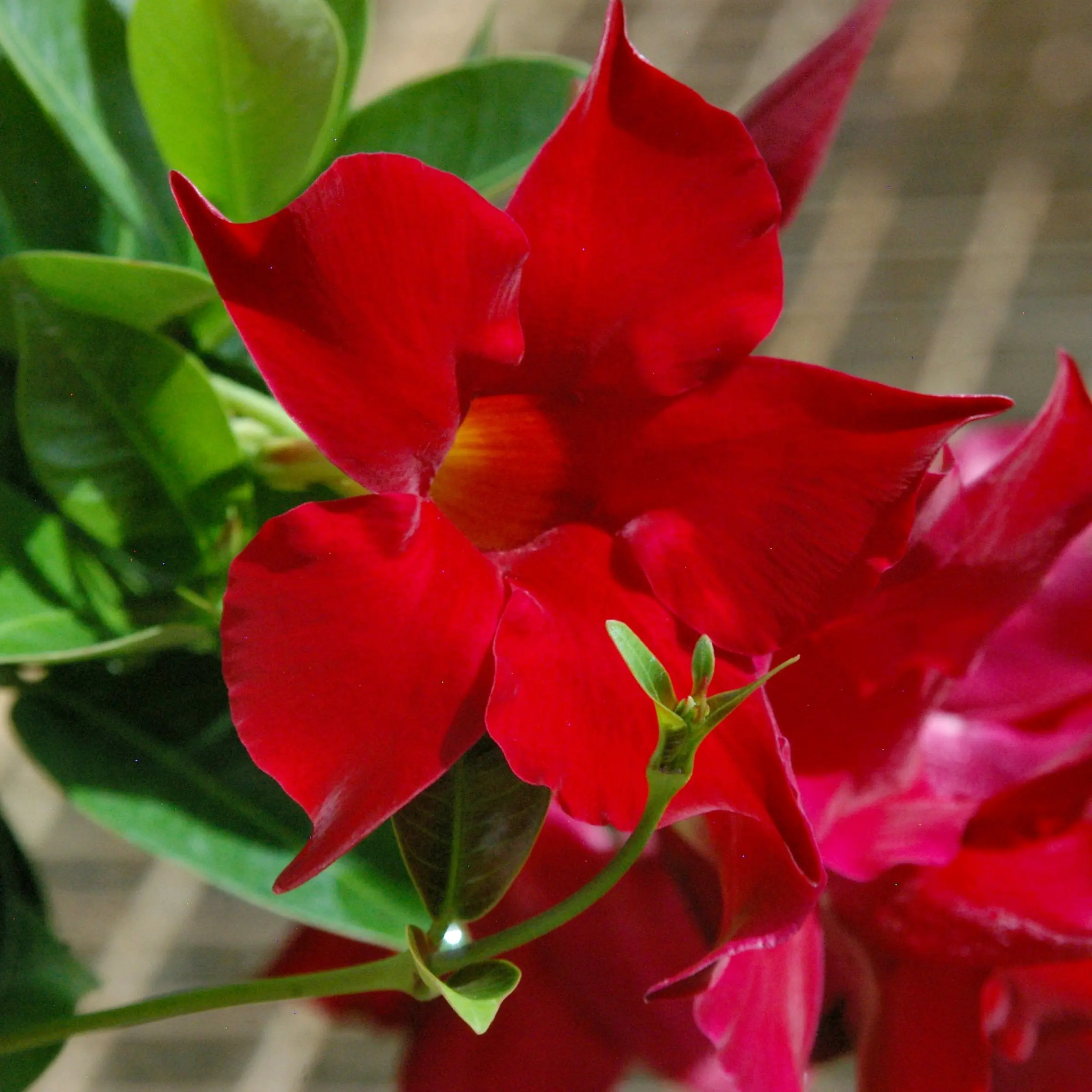 Bring a burst of patriotic color to your garden, porch, or patio with deep red Mandevilla! Featuring one vibrant red Mandevilla. These easy-care, vining plants love the sun and reward you with loads of beautiful blooms all season long. Whether climbing up a trellis or spilling out of a hanging basket, they're sure to brighten any outdoor space with their bold, cheerful colors. Includes 1 Deep Red Mandevilla plants in 4" grow pots.