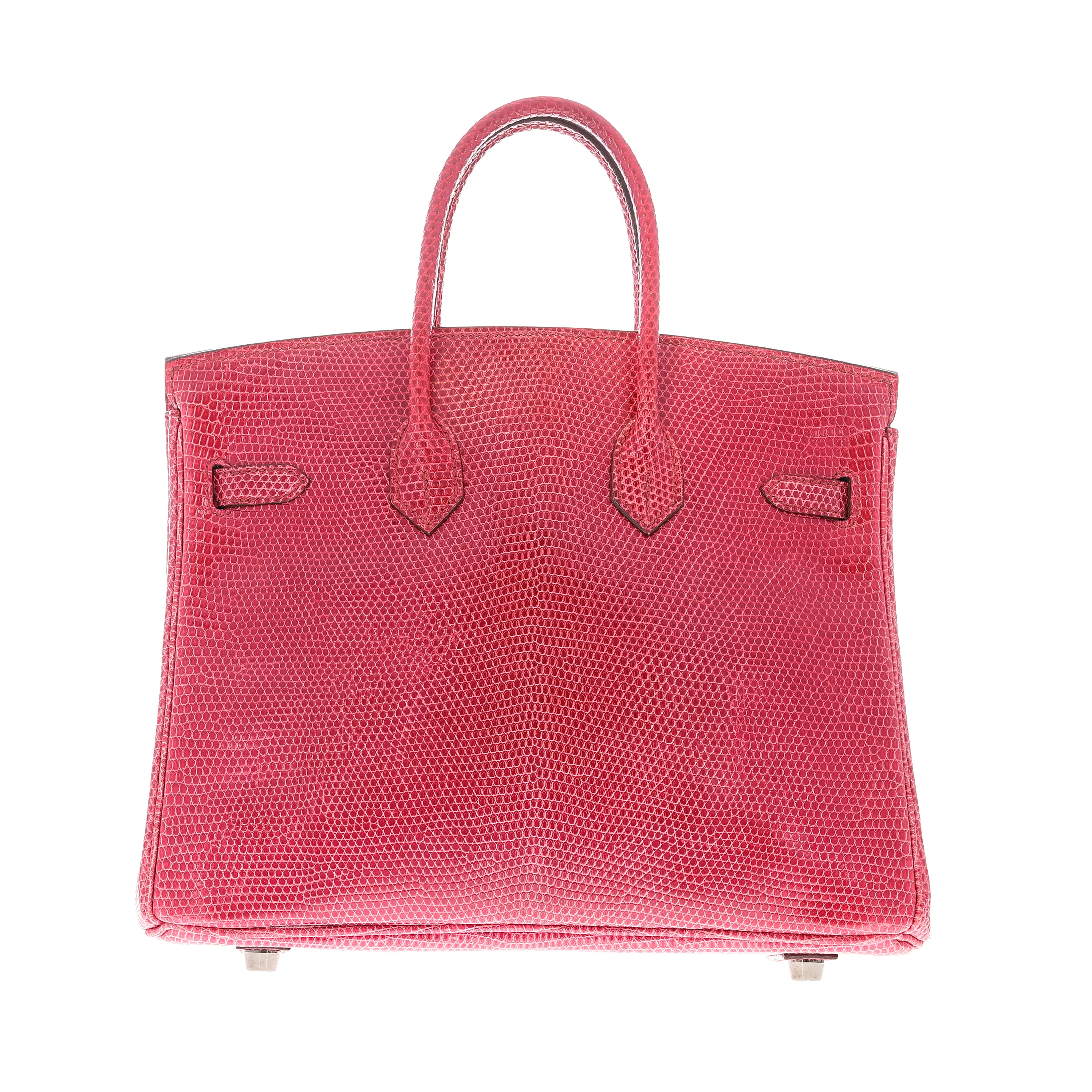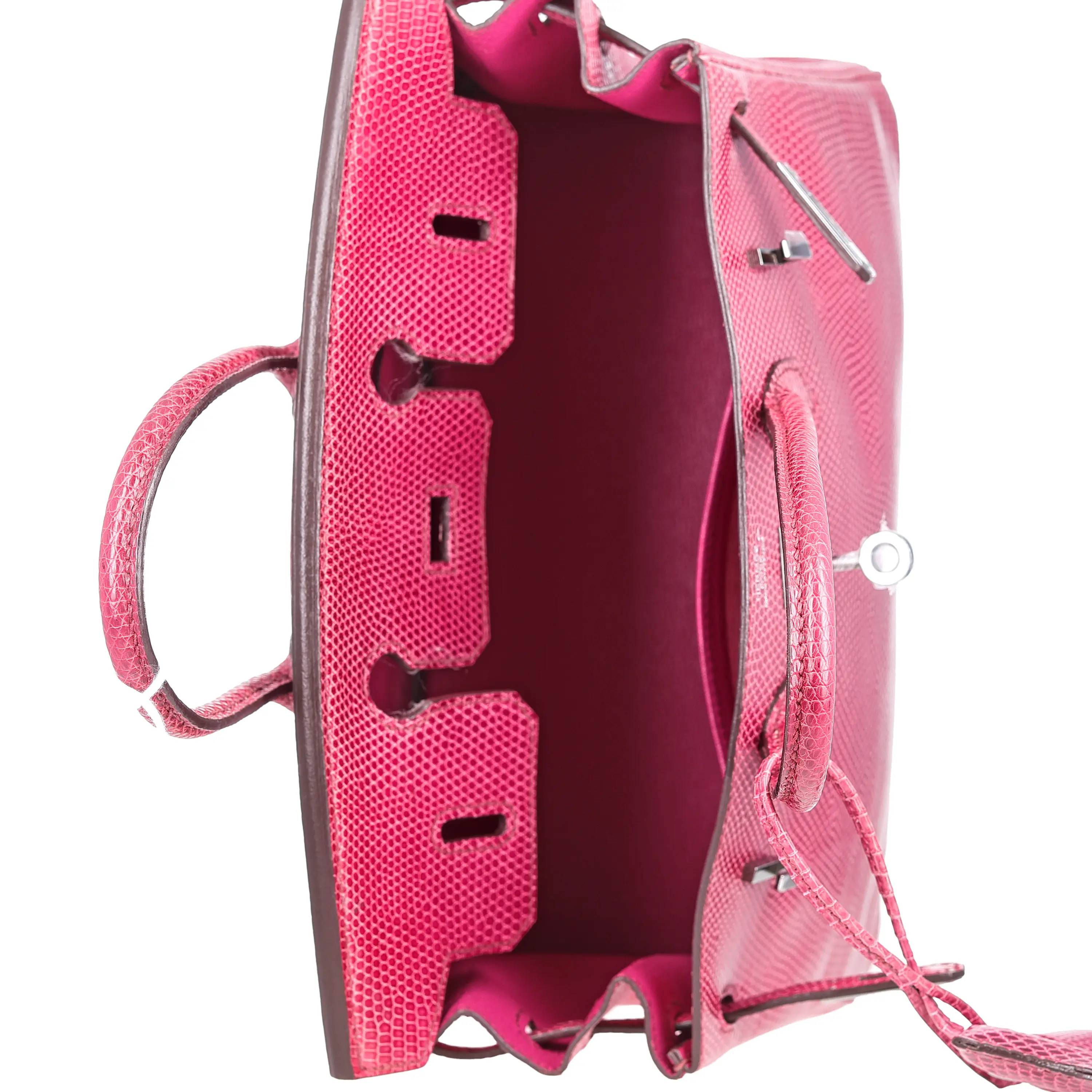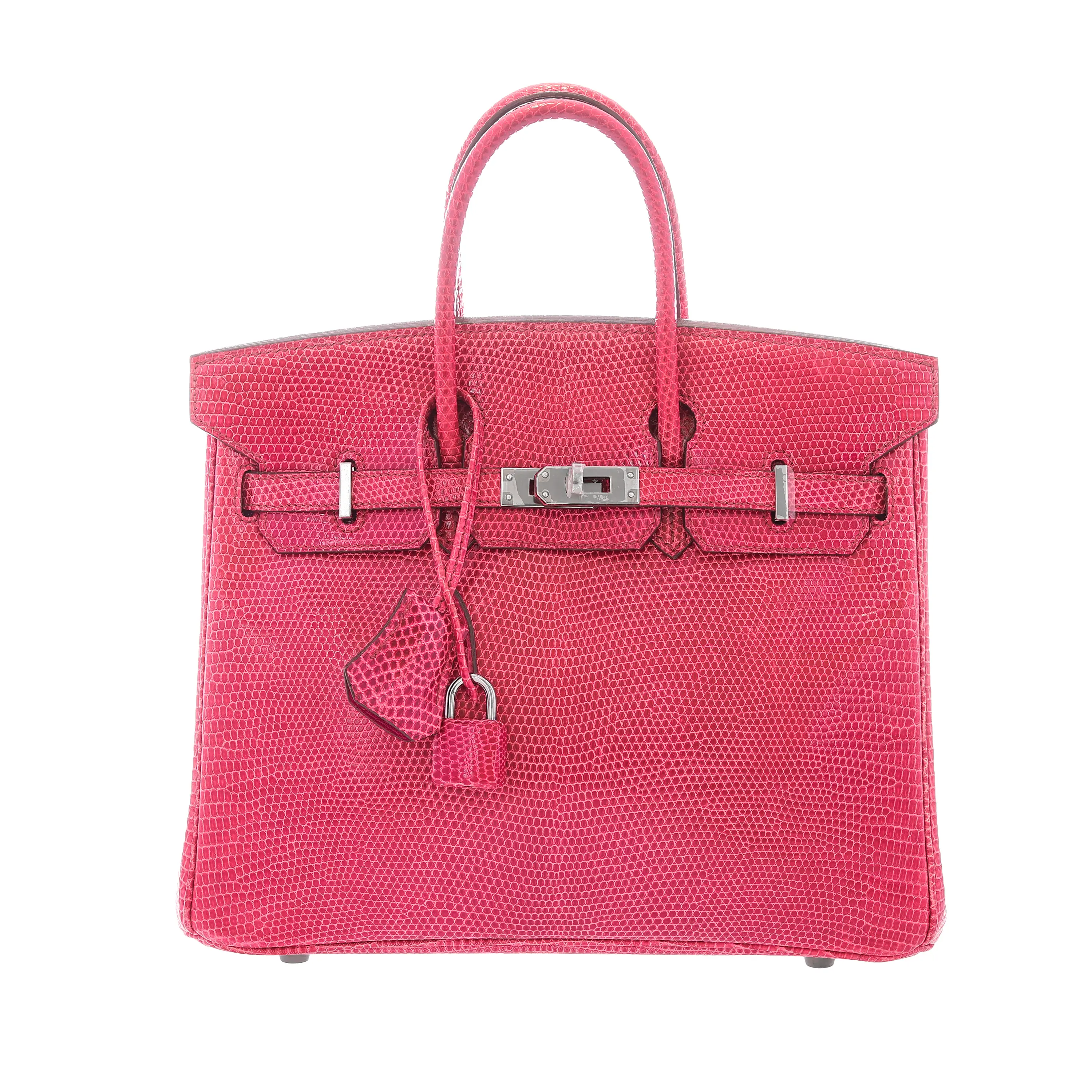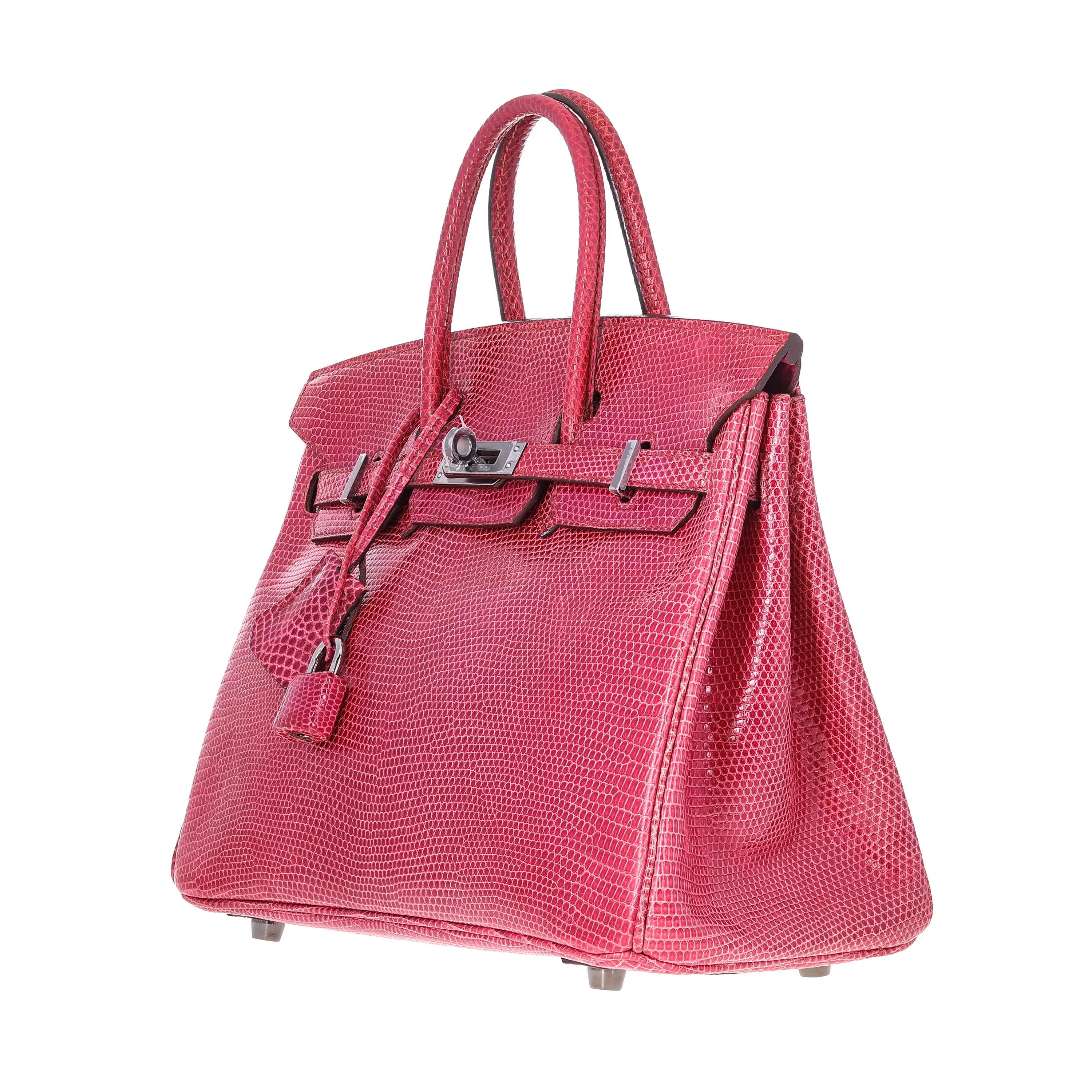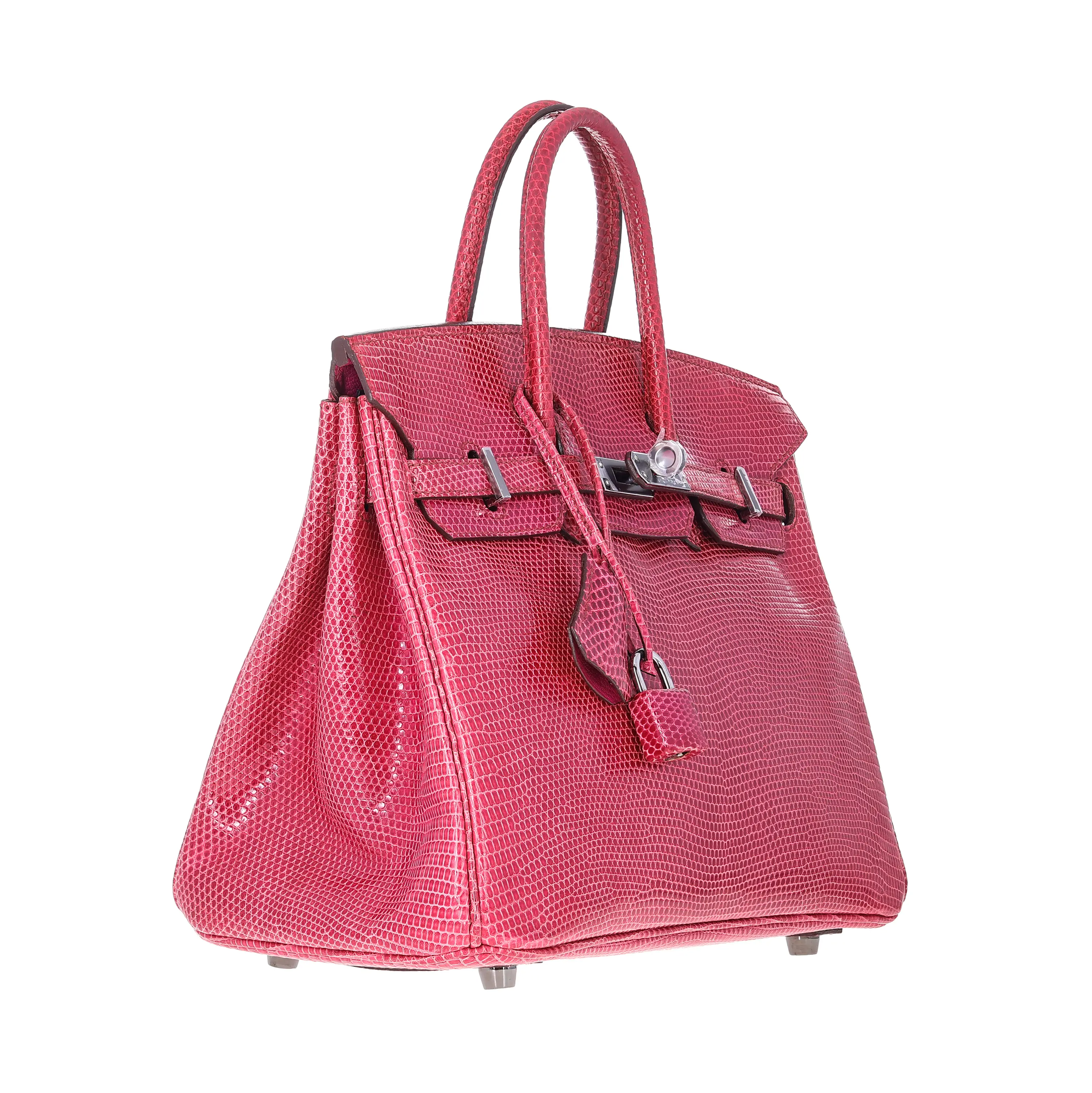 This is a pre-owned Hermès Birkin Handbag. It is Fuchsia Shiny Lizard with palladium hardware. It is a size 25. It measures 10"x5"x8". Drop: 4". It is in like new condition. It includes bag only.