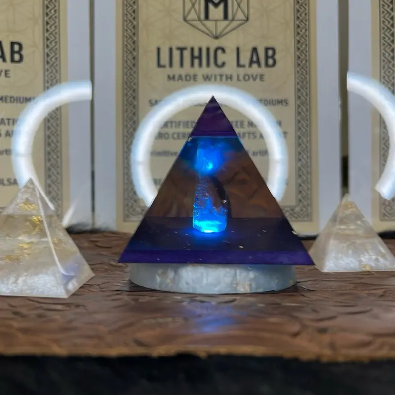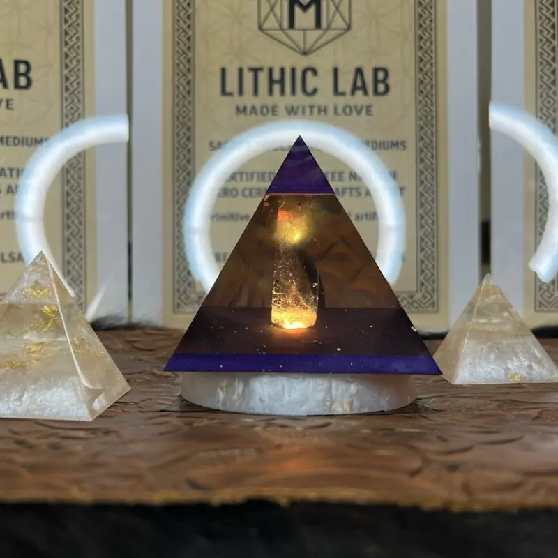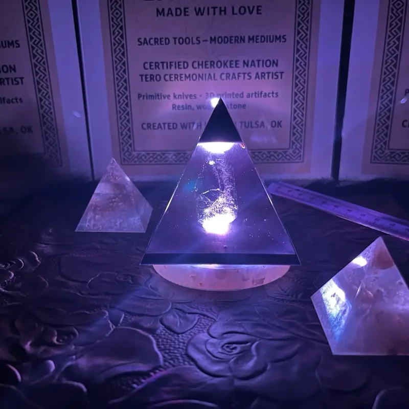 Large Lighted Orgonite Pyramid 4" & Mini Crystal Set – Handmade EMF Protection Kit, Meditation Altar Decor Knives
