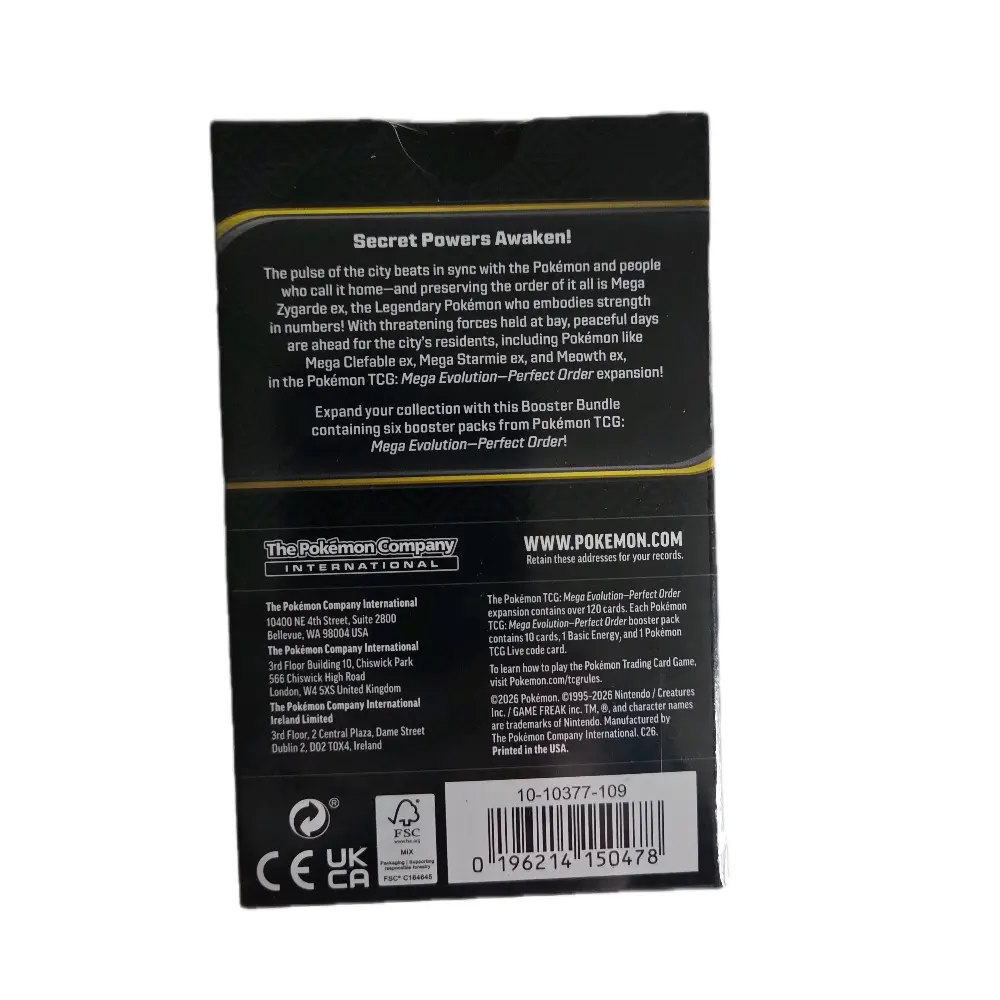 ·Card Text:Secret Powers Awaken!The pulse of the city beats in sync with the Pokémon and people who call it home—and preserving the order of it all is Mega Zygarde ex, the Legendary Pokémon who embodies strength in numbers! With threatening forces held at bay, peaceful days are ahead for the city's residents, including Pokémon like Mega Clefable ex, Mega Starmie ex, and Meowth ex, in the Pokémon TCG: Mega Evolution—Perfect Order expansion! Expand your collection with this Booster Bundle containing six booster packs!