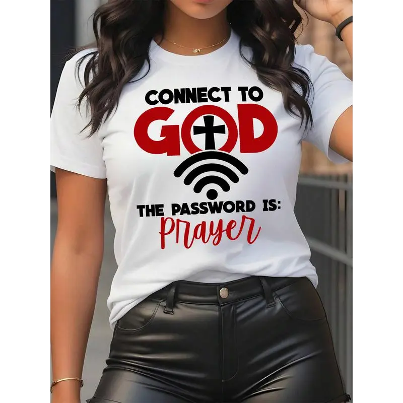 Women's Letter & Cross Print Round Neck Tee, Casual Short Sleeve Crew Neck T-shirt for Summer, Fashion Women's Top for Daily Wear, T Shirts for Women