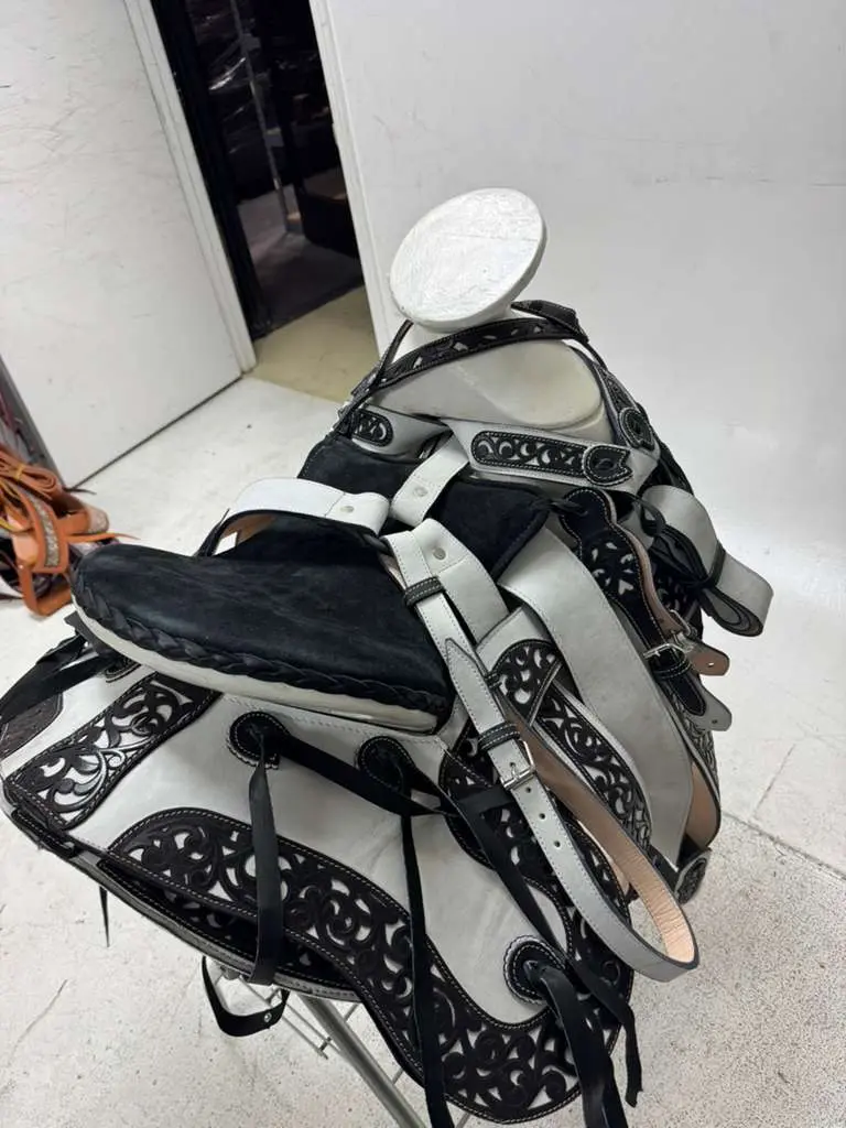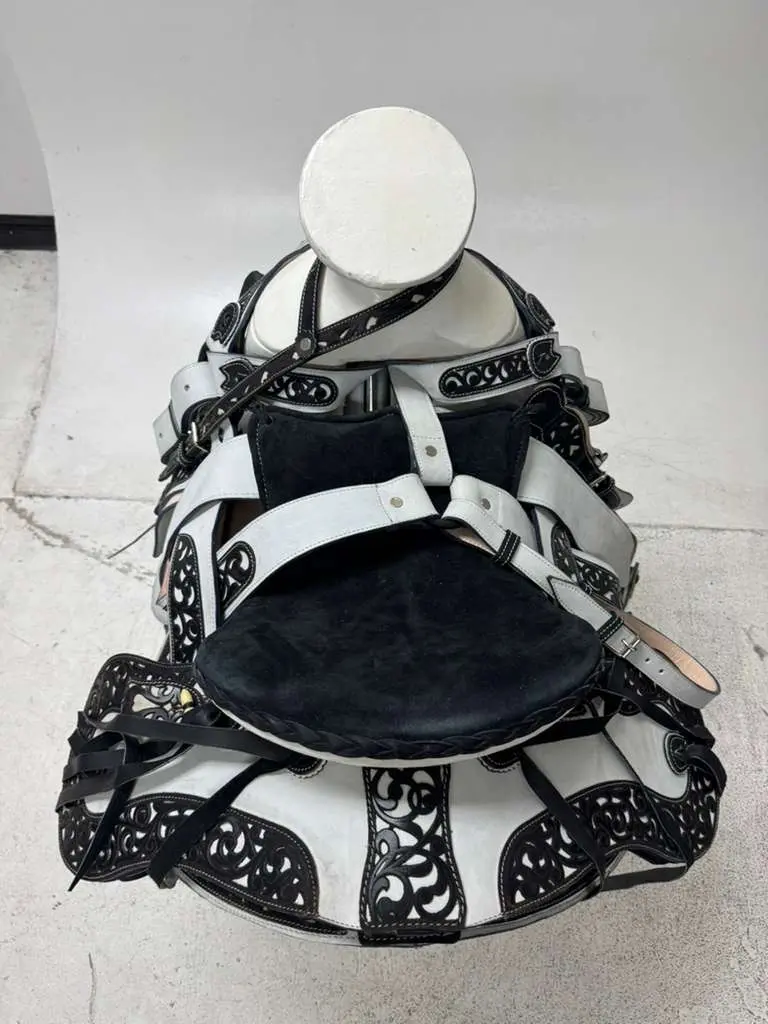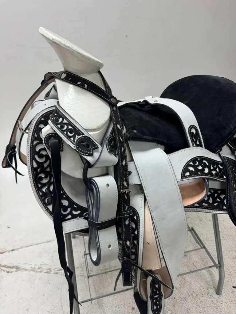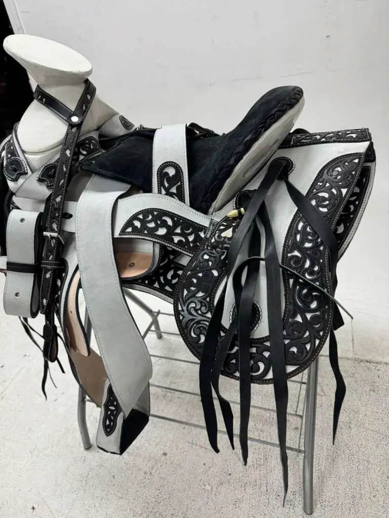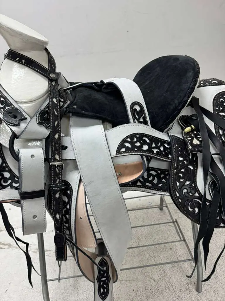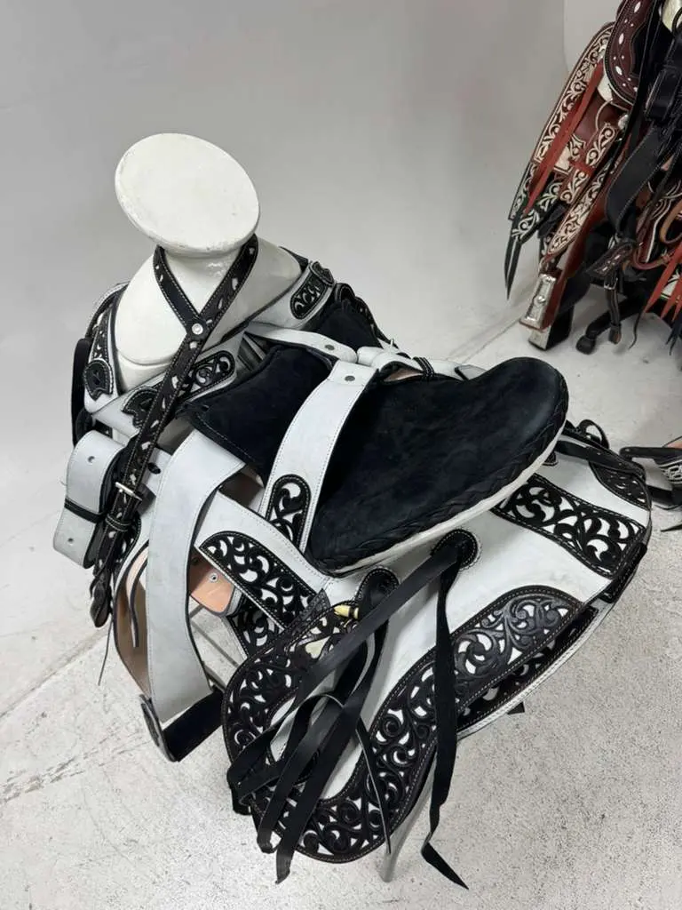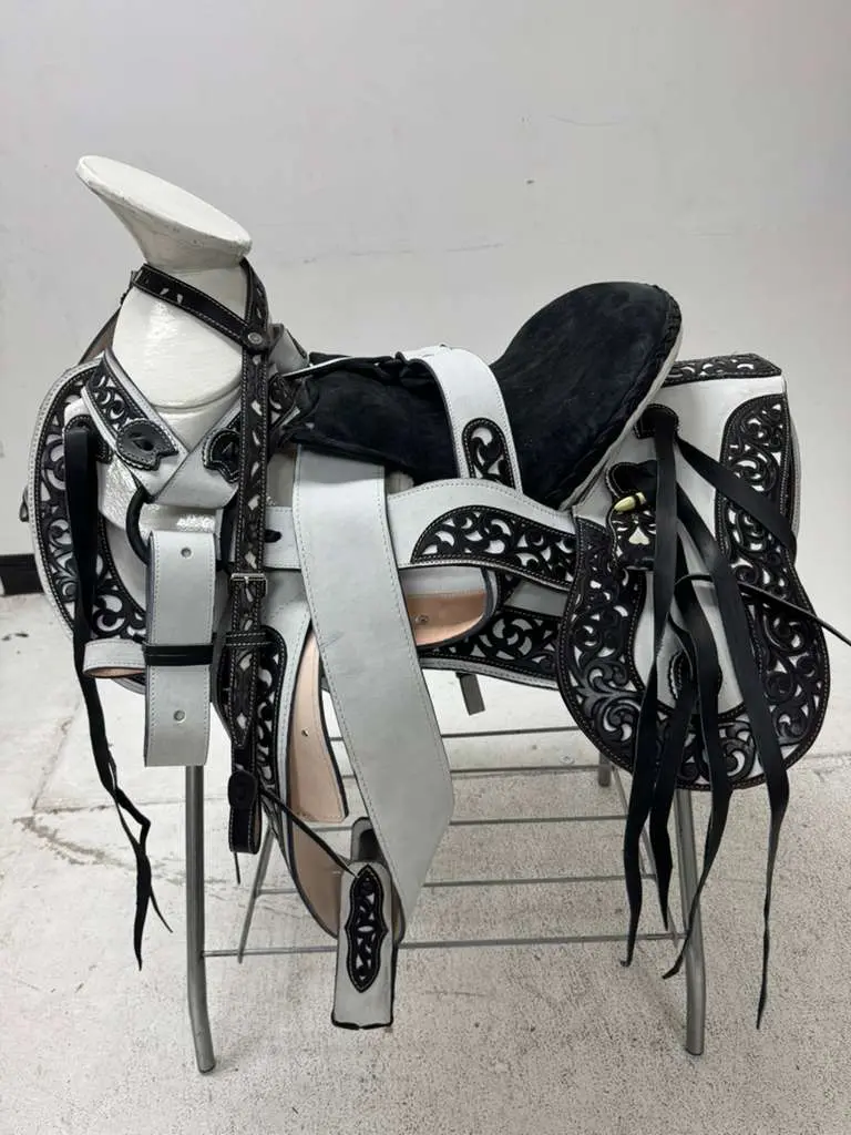Elegante silla charra en cuero blanco con detalles cincelados en negro que crean un contraste único y de alto nivel.
