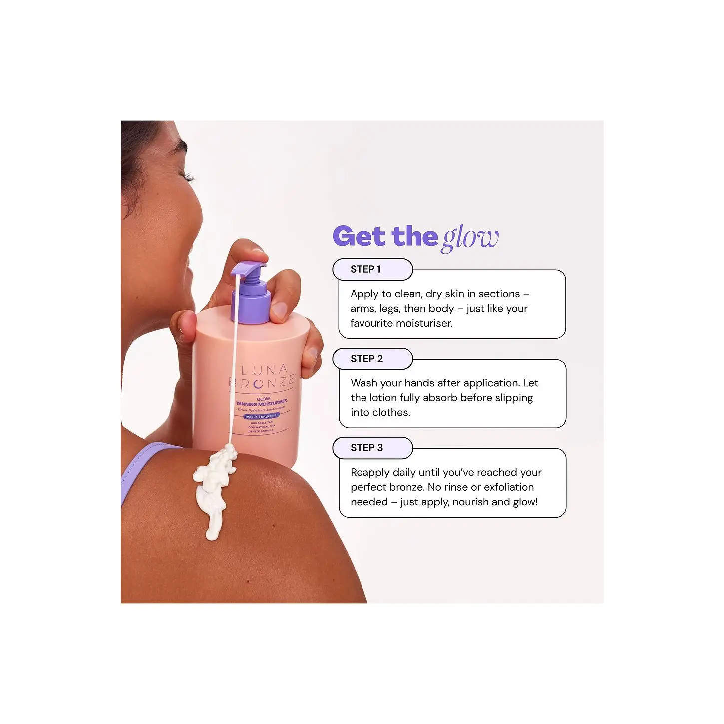 ·Step 1: Apply to clean, dry skin in sections- arms, legs, then body- just like your favourite moisturiser.