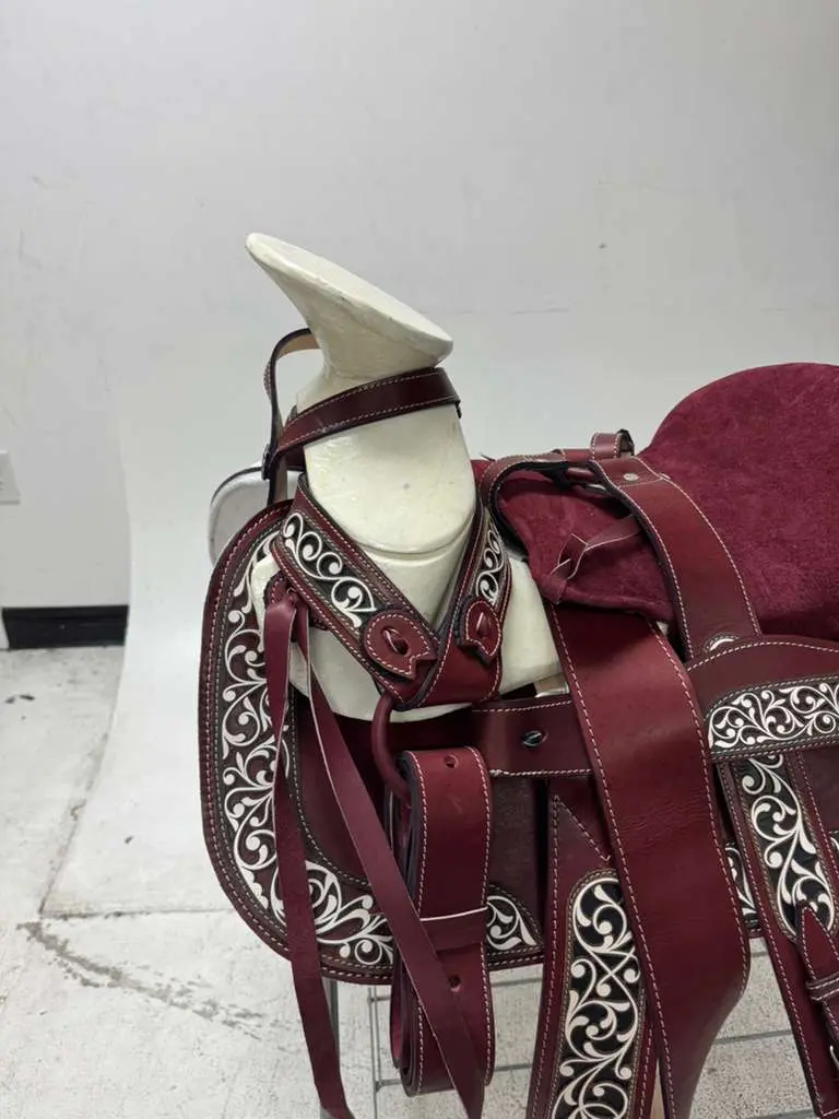 Elegante silla charra en tono vino con detalles cincelados tipo floral en contraste claro, ofreciendo un estilo clásico y sofisticado.