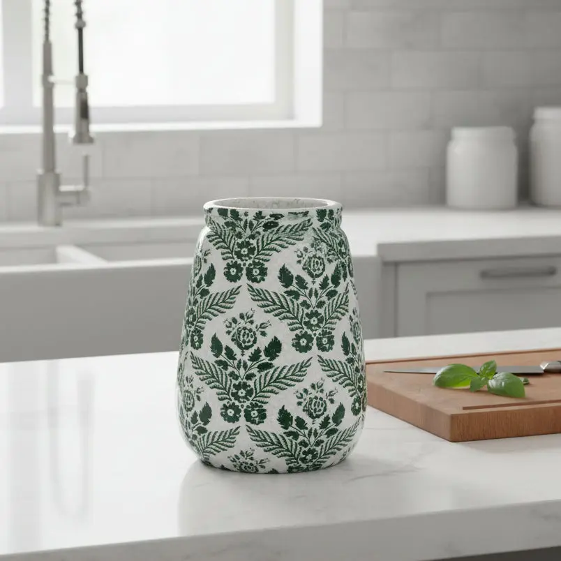 This unique terra-cotta planter/vase features a round shape with a wide opening and a flower pattern, giving it a natural and lovely look. The crackle glaze creates a glossy surface, while the green and white color scheme adds a cozy and elegant touch.