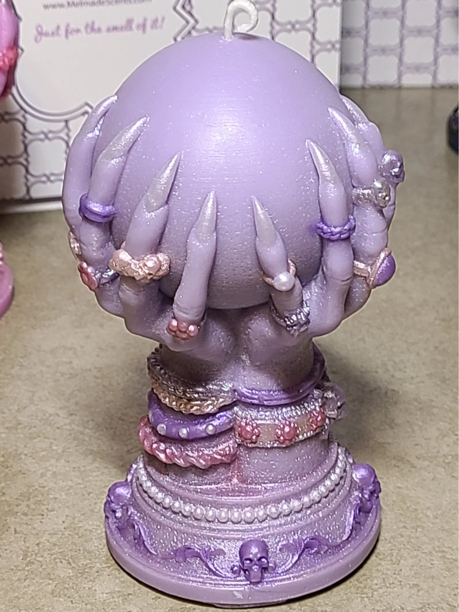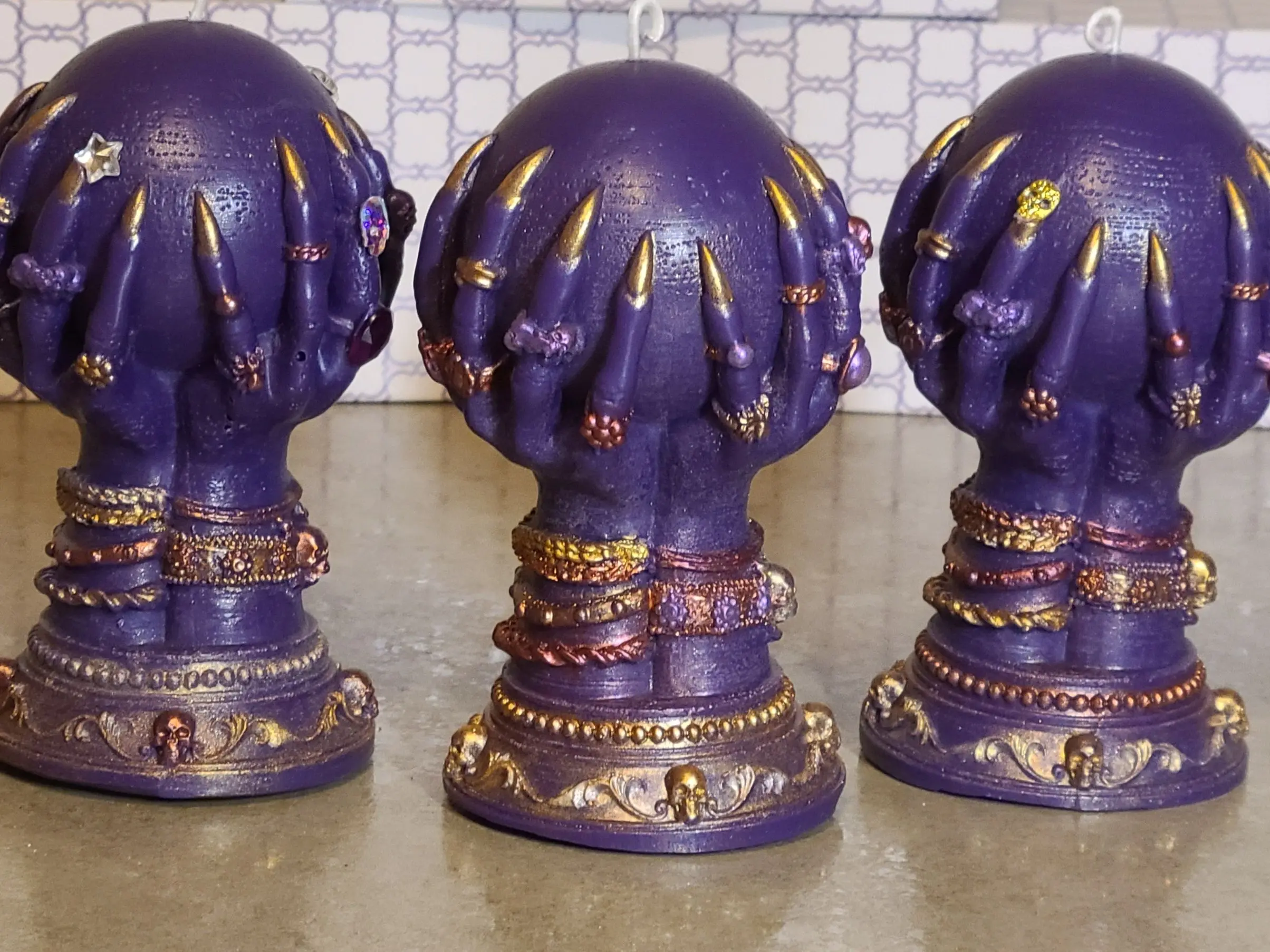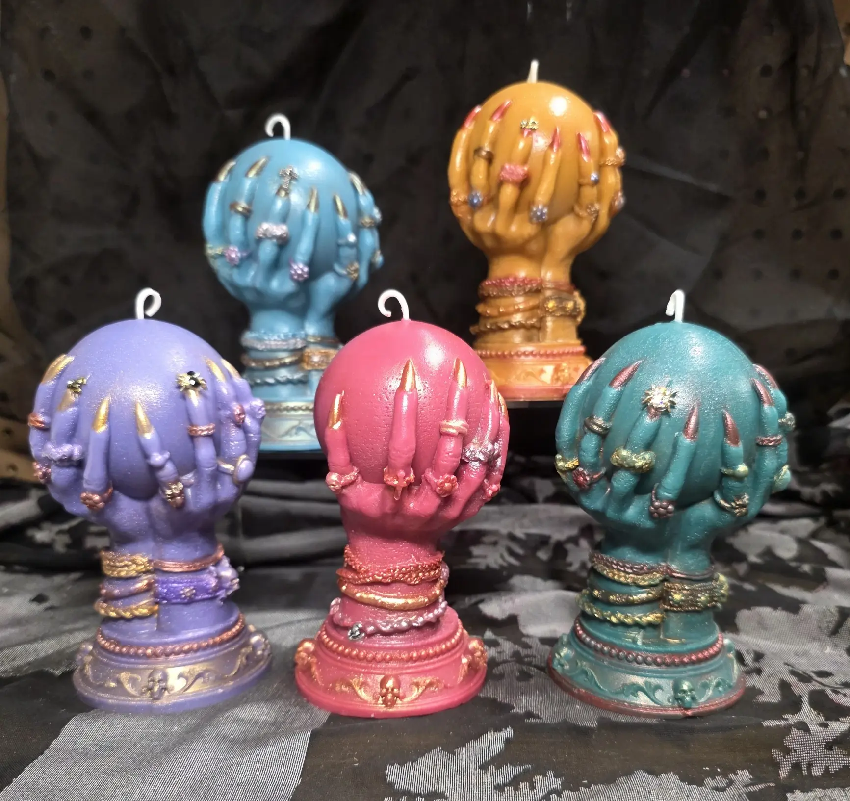 These striking candles are in the shape of a crystal ball being cradled in long-nailed hands covered in jewelry.