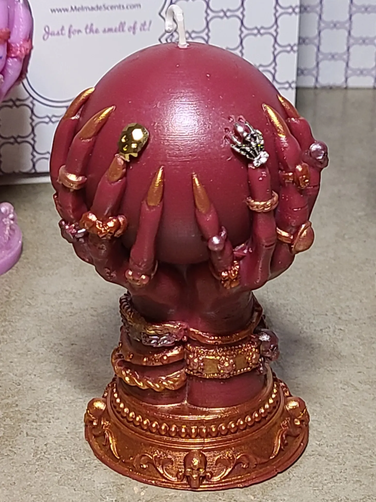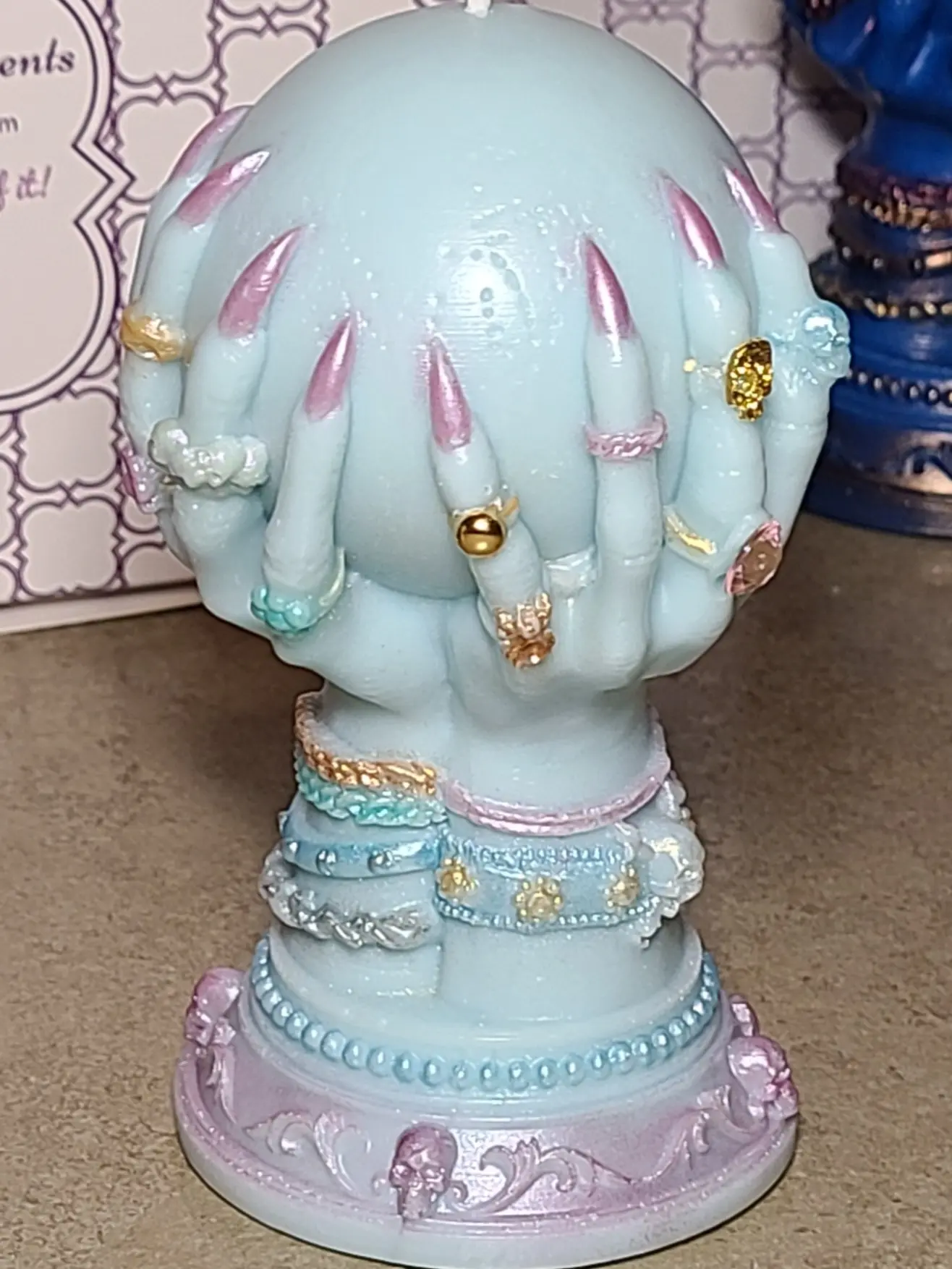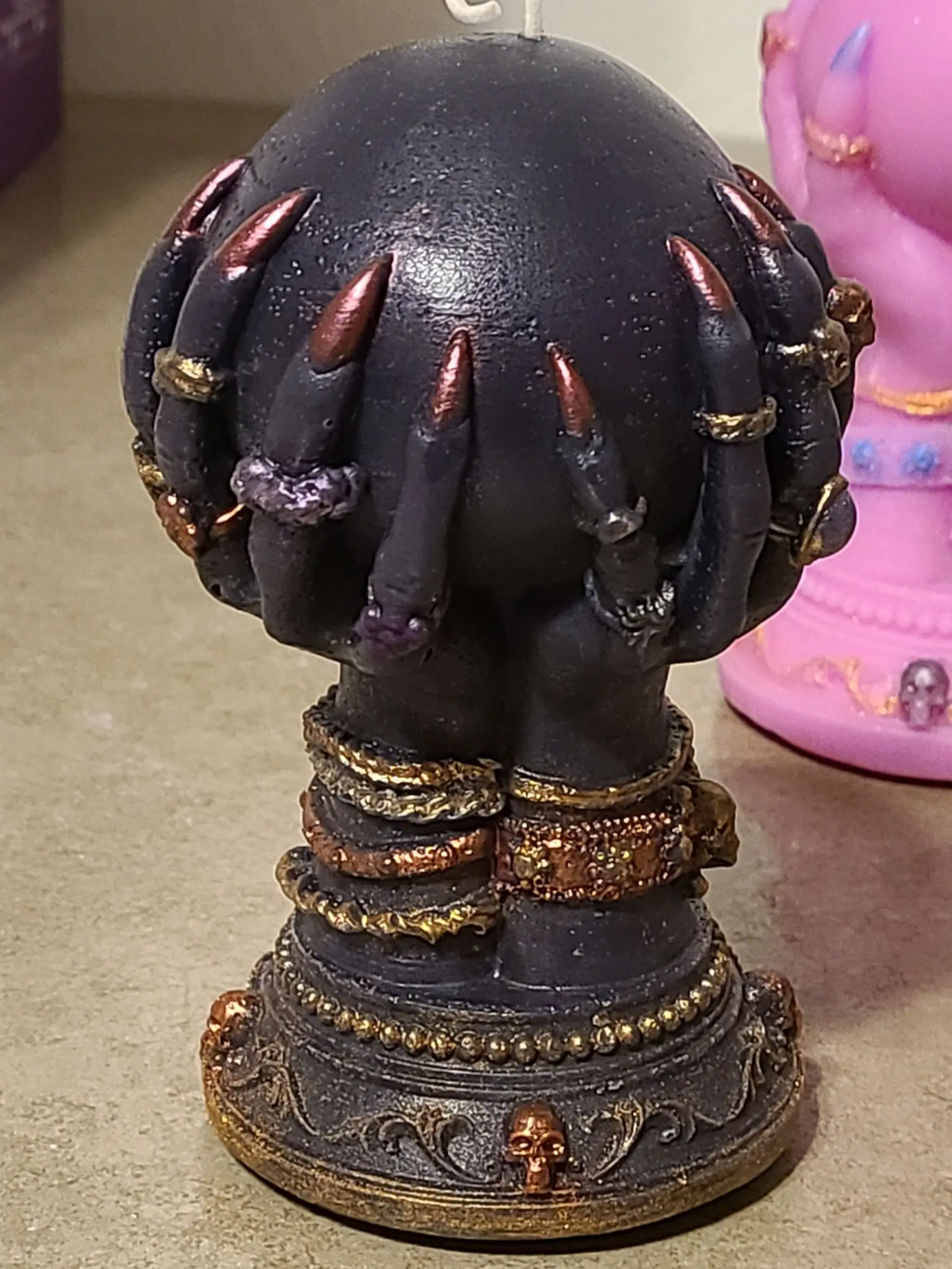 These striking candles are in the shape of a crystal ball being cradled in long-nailed hands covered in jewelry.