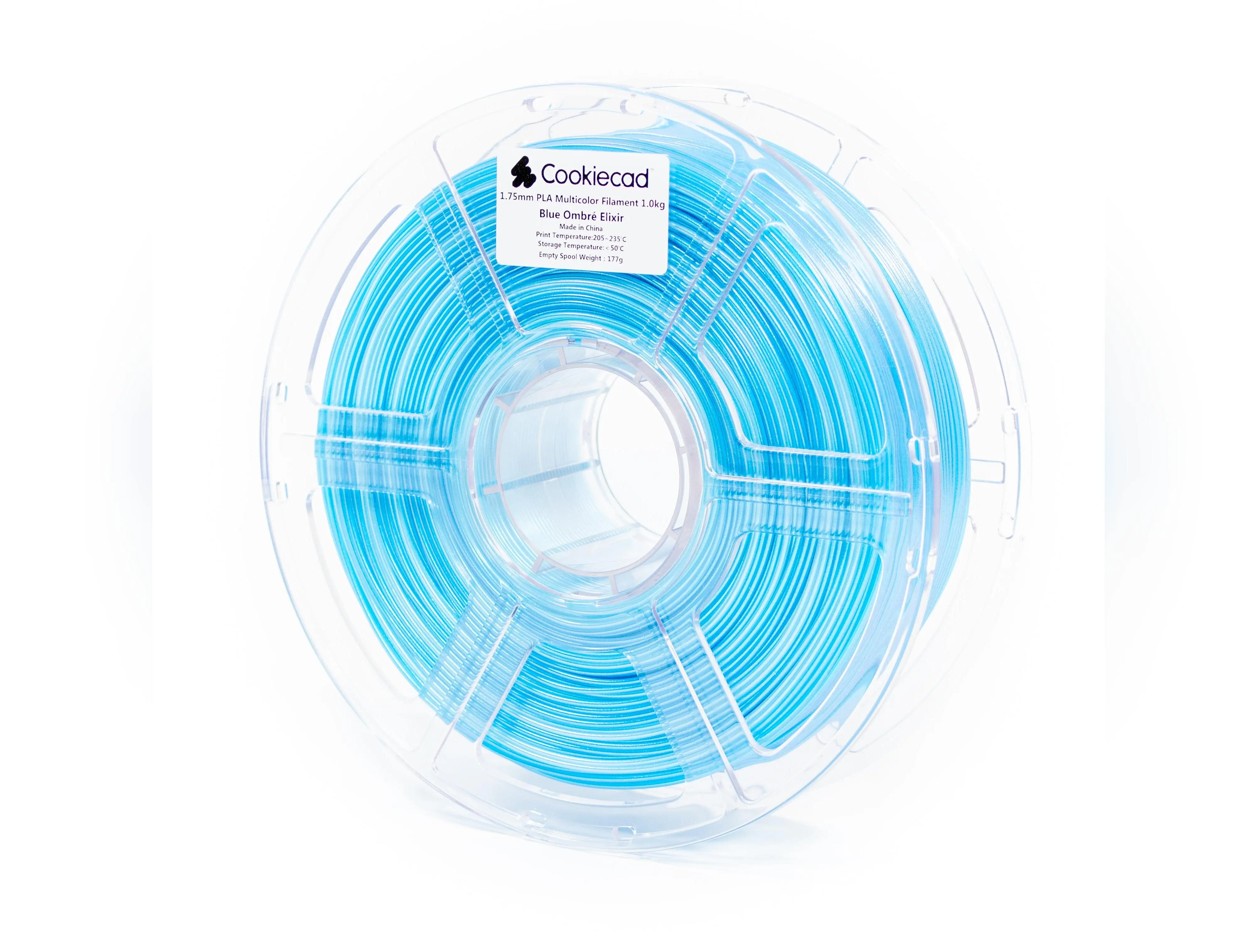 This is Blue Ombré Elixir- it has two different shades of blue on one spool plus our added shimmer! The color will change slowly over time, so small objects will only contain one color. You print multiple items at a time, large items or increase infill to get more of the color change into a single print. If you can't choose just one blue, get this spool! It is a glossy filament and prints with a beautiful shine.
