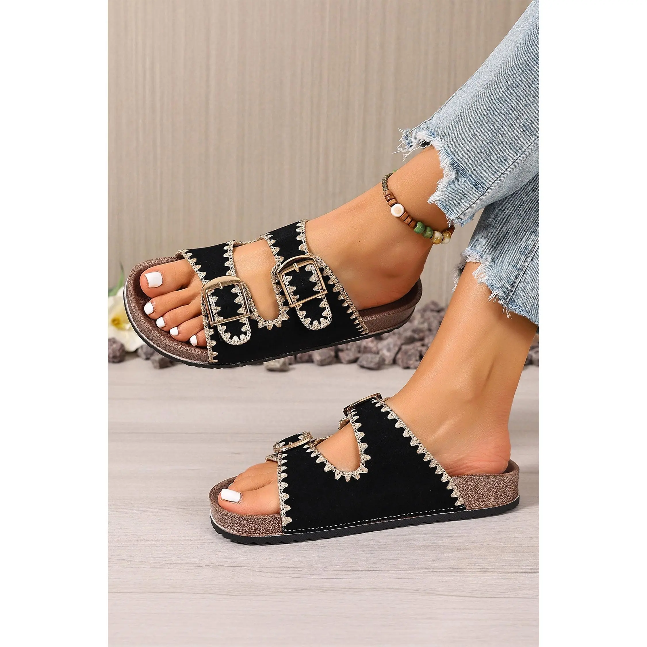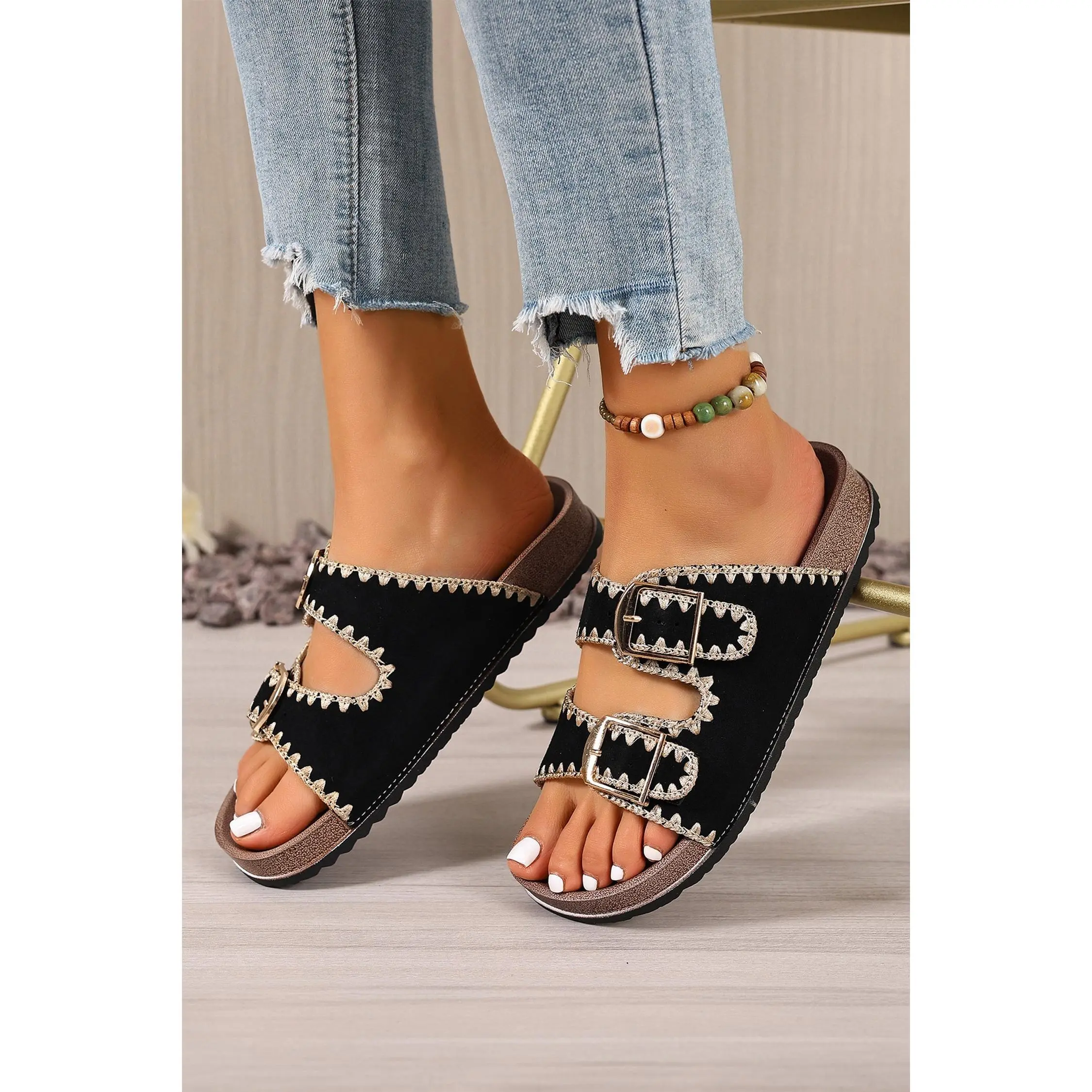 Reach for Kehlani Buckle Faux Suede Slippers whenever you want comfort, confidence, and simple styling. Warmer temps mean it's time to break out with these slippers. Retro inspired faux suede construction with embroidered details. Ope toe design with wide adjustable straps and metal buckles. Casual slide-on design makes them perfect for effortless styling.