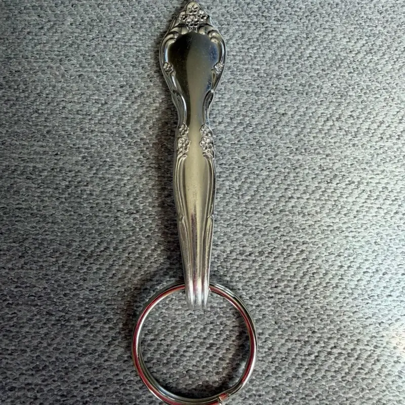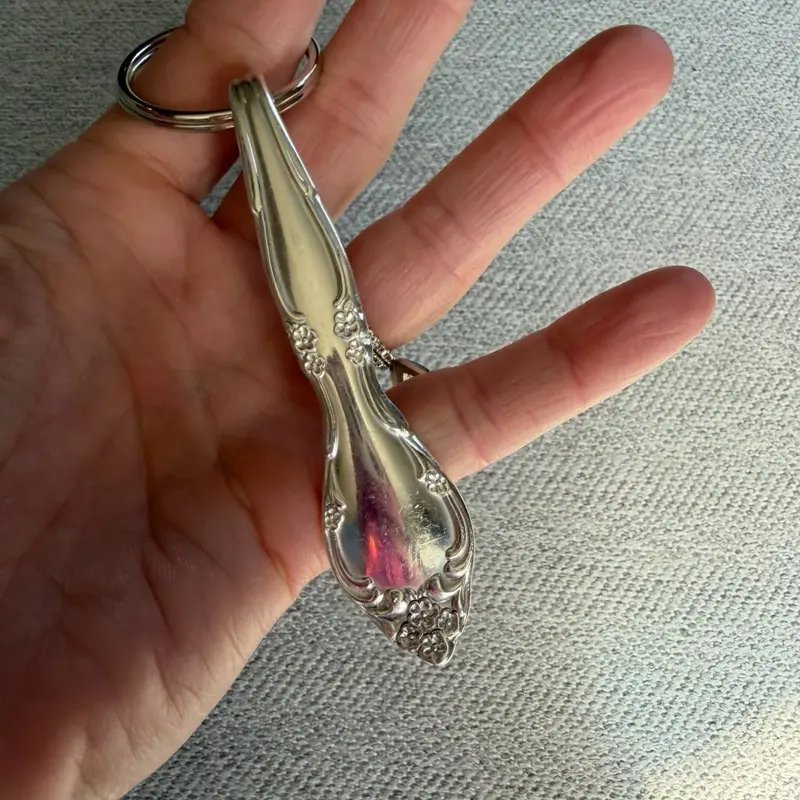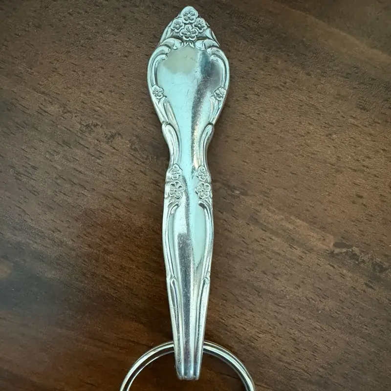 Handmade keychain made by me from vintage silver plated spoon! All my jewelry is made from flatware found at estate sales, since this is a vintage spoon there are imperfections in the metal.