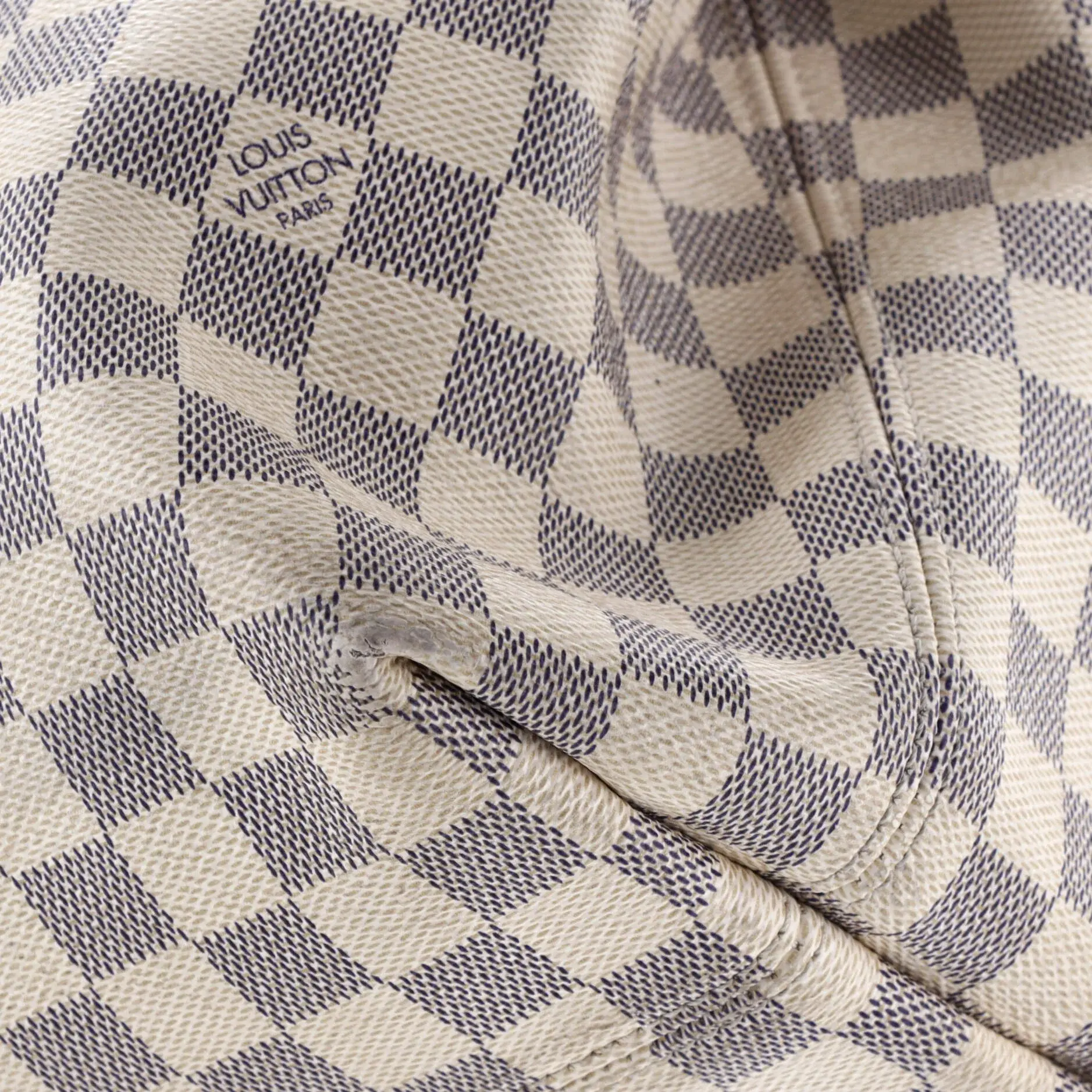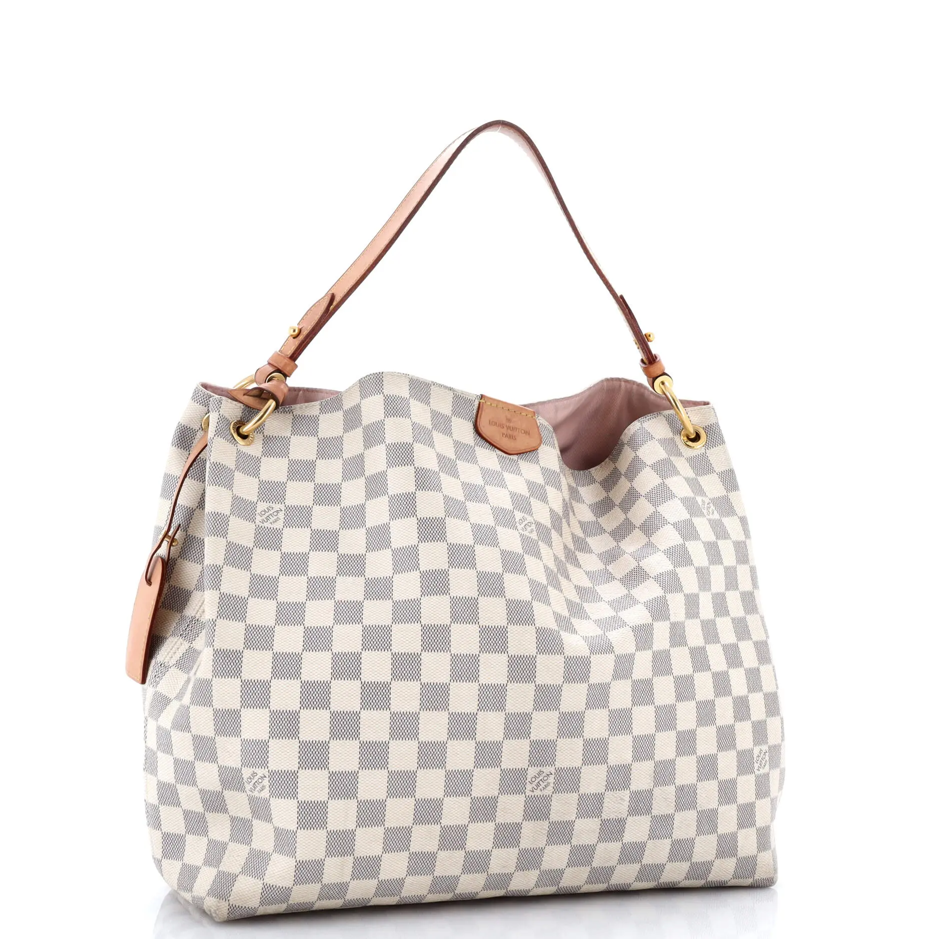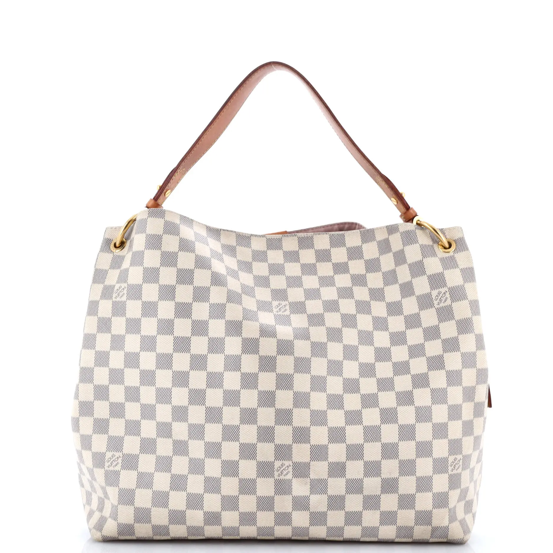 These are professional pictures of the actual item offered by Rebag. Estimated Retail Price: $2,160 Condition: Fair. Exterior: heavy corner wear, heavy discoloration throughout, scuffs, creases | Handles/Straps: scuffs, creases, cracking, discoloration | Interior: perfume odor, scuffs, discoloration | Hardware: scratches, tarnished Accessories: Luggage Tag Measurements: Handle Drop 5", Height 13", Width 15", Depth 5", Strap Drop 16-18" Designer: Louis Vuitton Model: Graceful Handbag Damier MM Exterior Material: Canvas Coated Exterior Color: White Interior Material: Fabric Interior Color: Pink Hardware Color: Gold Brand Code: TX3260 Item Number: 408118/1