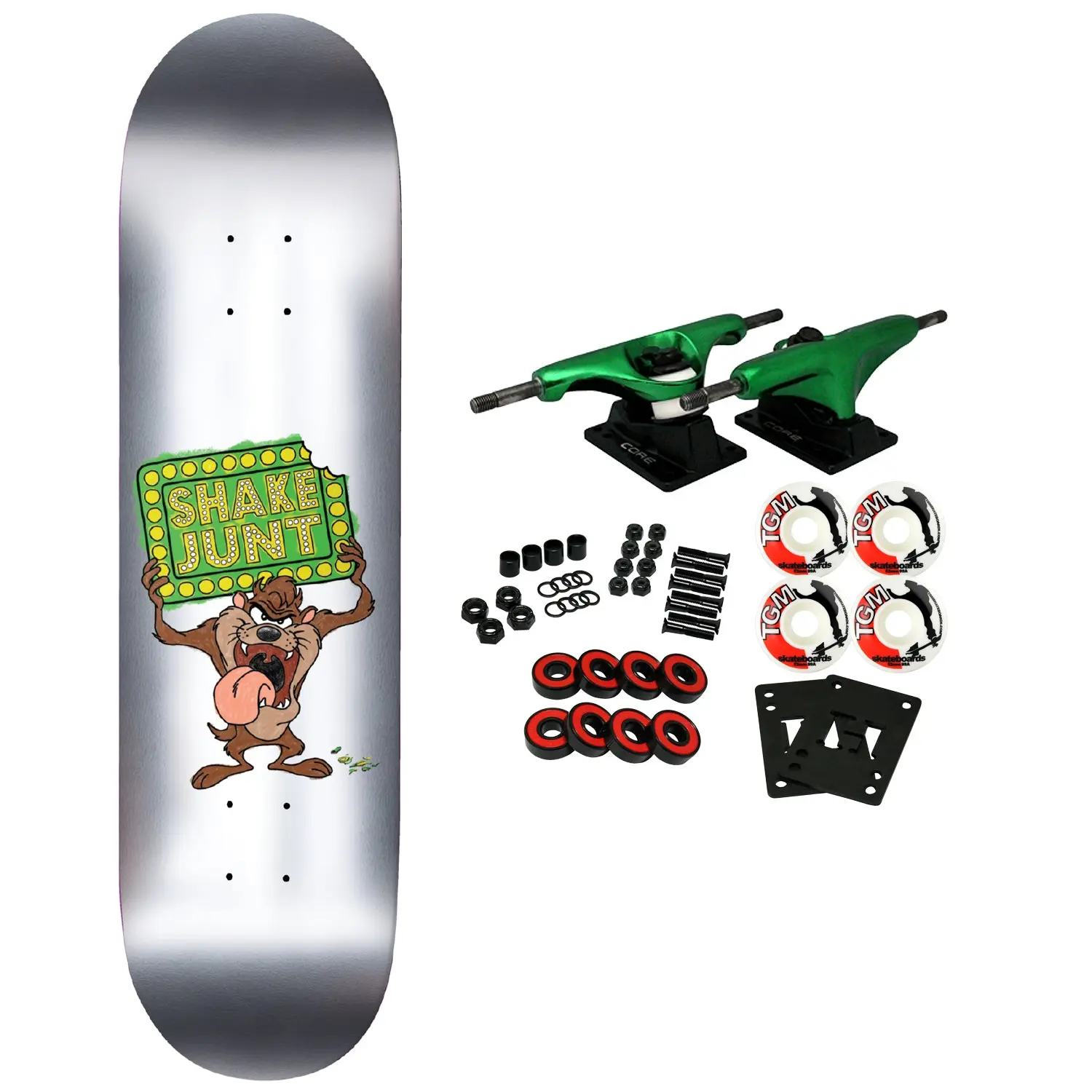 Shake Junt Skateboards are Constructed with Premium 7-Ply North American Maple. This board measures 8.5" x 32.425" with a 14.375" wheelbase. Comes with Core trucks, 52mm TGM logo wheels, Amp abec 5 bearings, Black Diamond Griptape, risers, and hardware. Core trucks are light weight and feature heavy duty aluminum with grade 8 steel kingpins and axles, as well as USA made bushings and pivot cups. 52mm 99A are the perfect wheels for both street and park skating. Like the name states, Amp bearings are stimulants for your wheels! Light synthetic oil, Delrin Crowns, and Rubber Serviceable Shields are a few of the things that makes these bearings one of the best Abec 5 rated bearings on the market. Arrives un-assembled which allows for customization and a feeling of accomplishment. Skaters love building their boards! Easy to assemble!