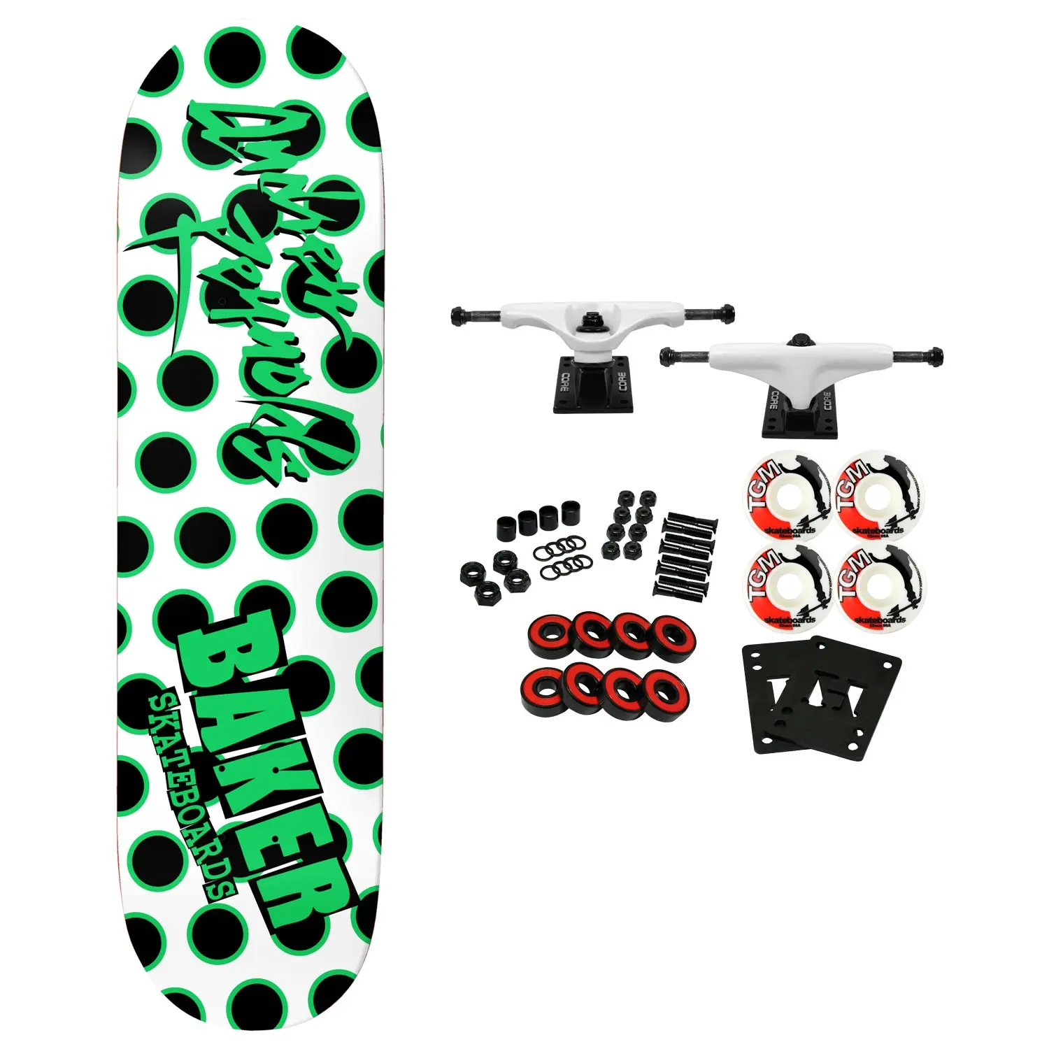 Constructed with Premium 7-Ply North American Maple. The Baker OG Shape features mellow concave for quick response. This board measures 8.5" x 32" with a 14.5" wheelbase. Comes with Core trucks, 52mm TGM logo wheels, Amp abec 5 bearings, Black Diamond Griptape, risers, and hardware. Core trucks are light weight and feature heavy duty aluminum with grade 8 steel kingpins and axles, as well as USA made bushings and pivot cups. 52mm 99A are the perfect wheels for both street and park skating. Like the name states, Amp bearings are stimulants for your wheels! Light synthetic oil, Delrin Crowns, and Rubber Serviceable Shields are a few of the things that makes these bearings one of the best Abec 5 rated bearings on the market. Arrives un-assembled which allows for customization and a feeling of accomplishment. Skaters love building their boards! Easy to assemble!