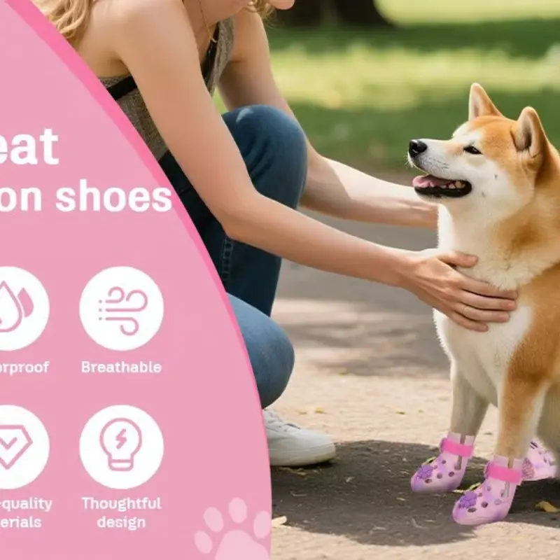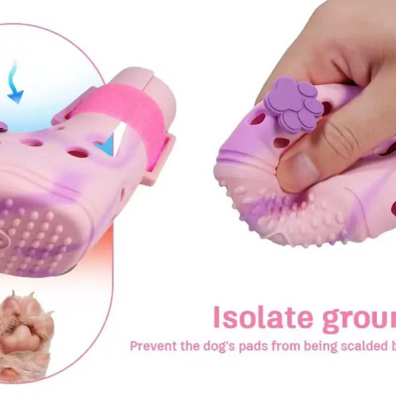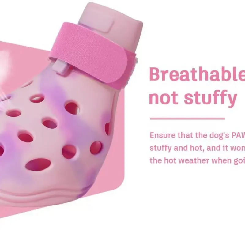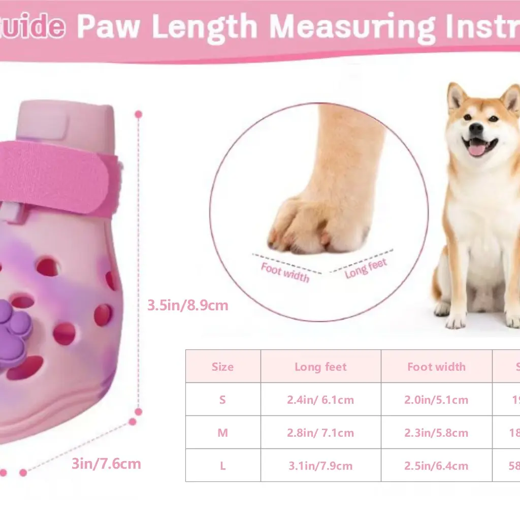 ·These dog shoes feature a sweet pink and purple color combination that makes your pet look adorable and fashionable. The charming clog-style design adds a playful touch while also providing practical paw coverage for everyday wear.