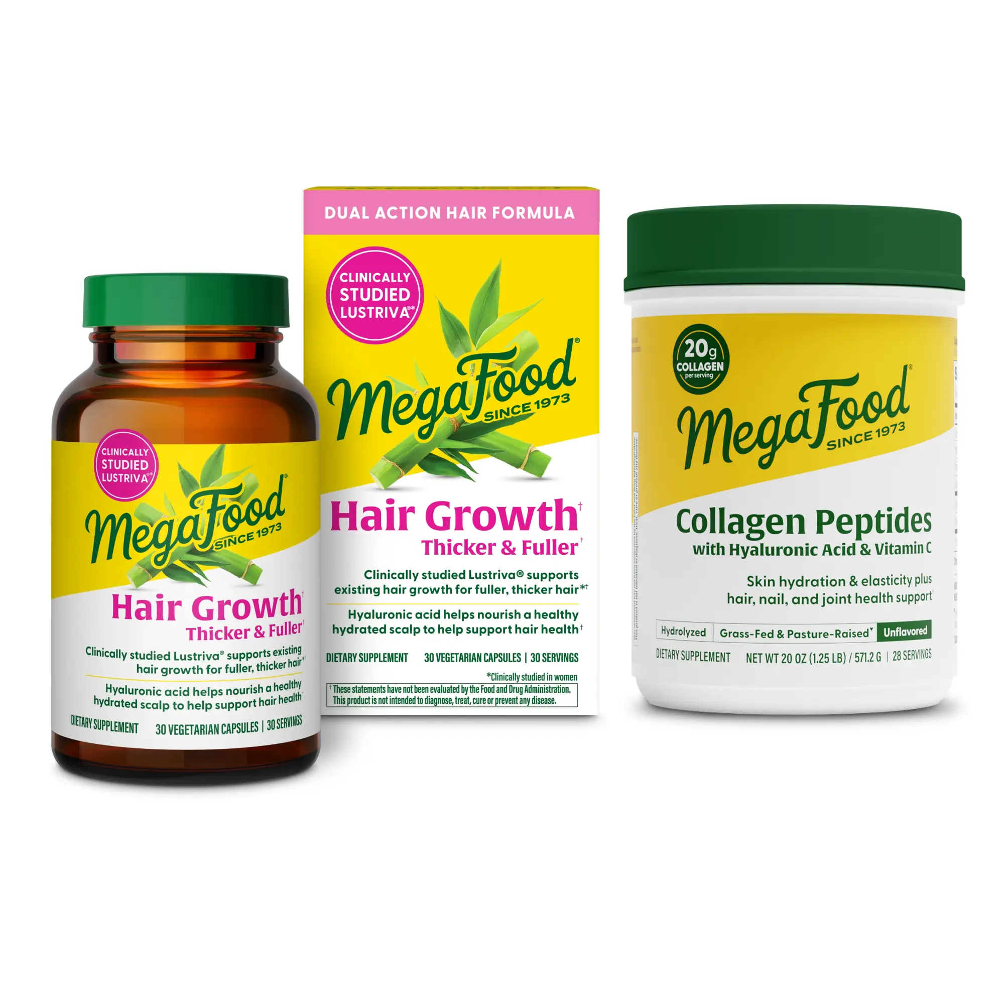 Support healthy skin + hair from the inside out with our Collagen Peptides Powder + Hair Growth Capsules - an all in one beauty bundle!