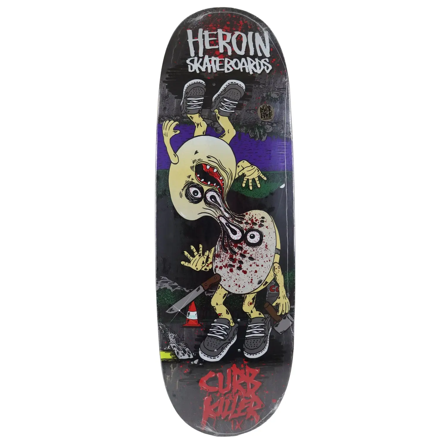 This board comes in Assorted Stained Bottom Veneers. Heroin Skateboards are Constructed with Premium 7-Ply North American Maple. This board measures 10" x 32.5" with a 14.38" wheelbase. 9.5" over the back truck.