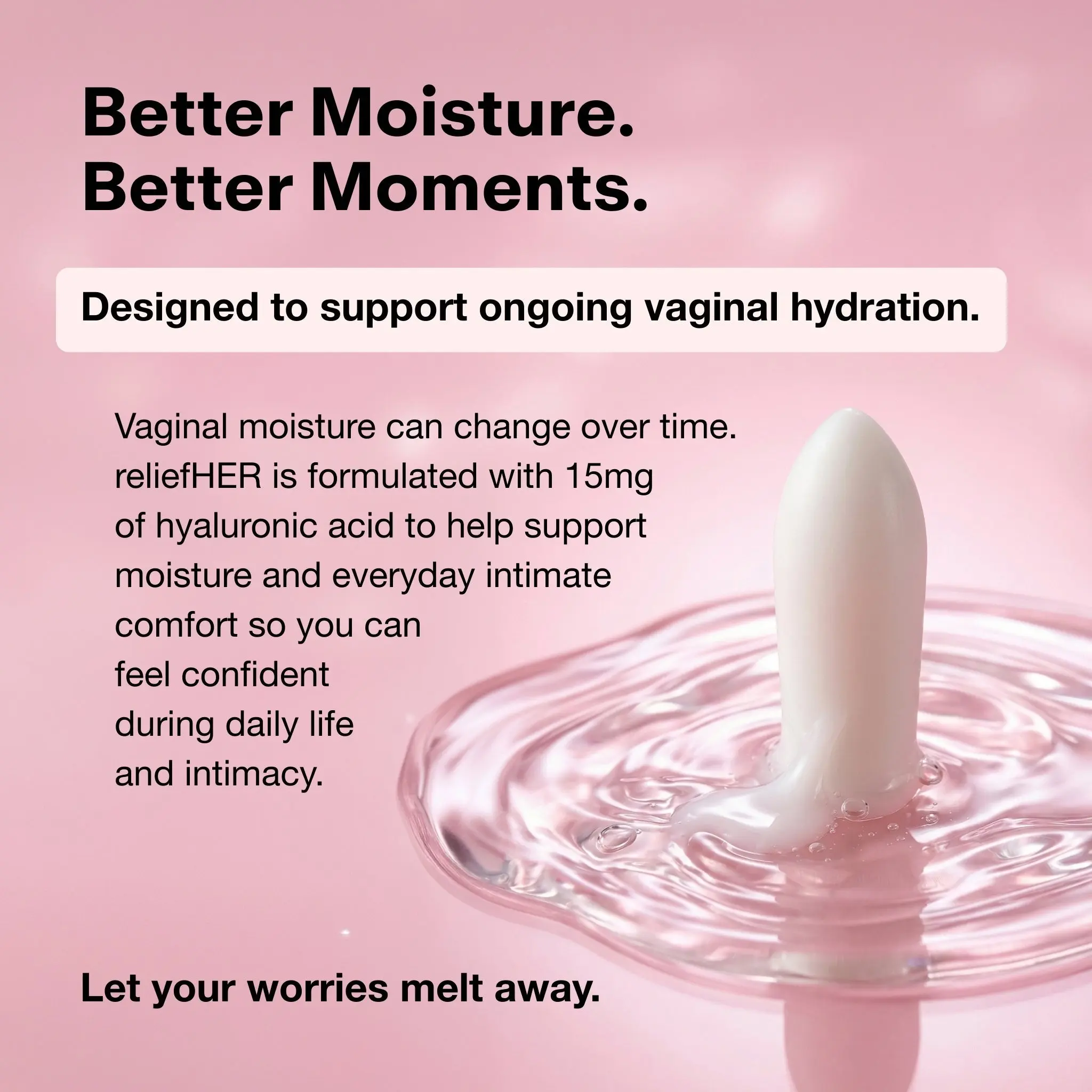 When your body craves more than a quick sip of moisture, reach for reliefHER. Each melt delivers 15 mg of hyaluronic acid (up to 3x more than many leading products) to help enhance moisture and support a soft, comfortable feel.