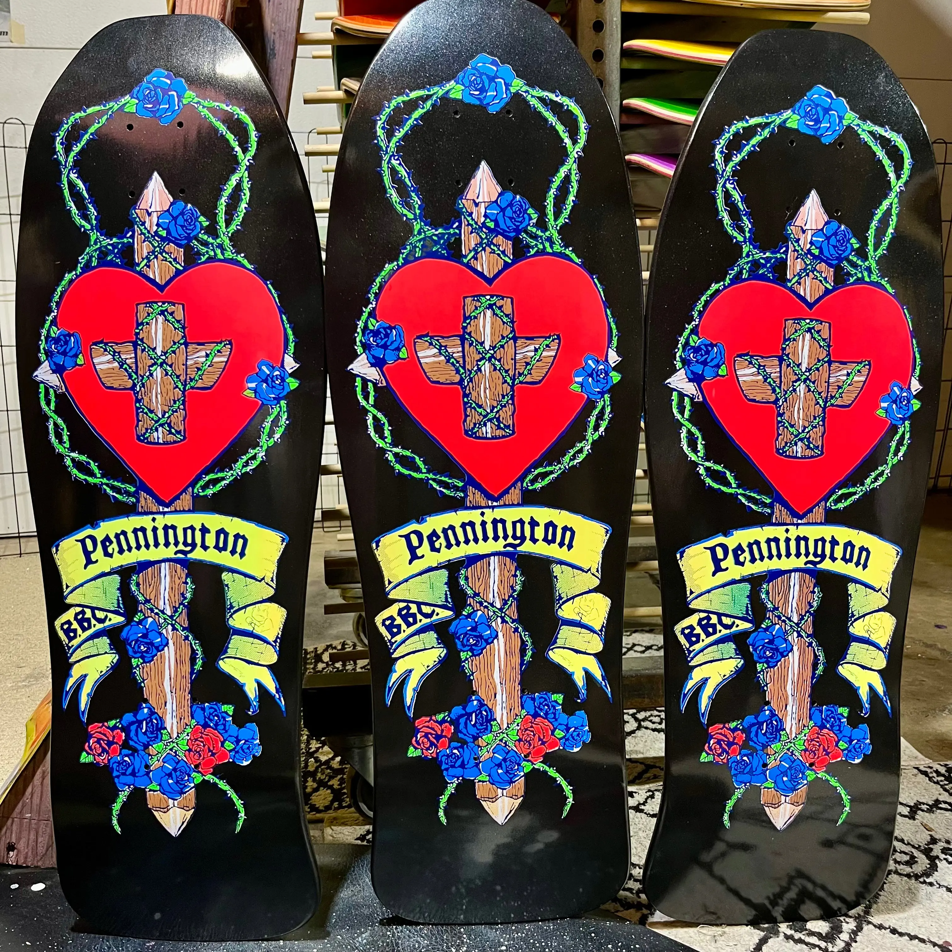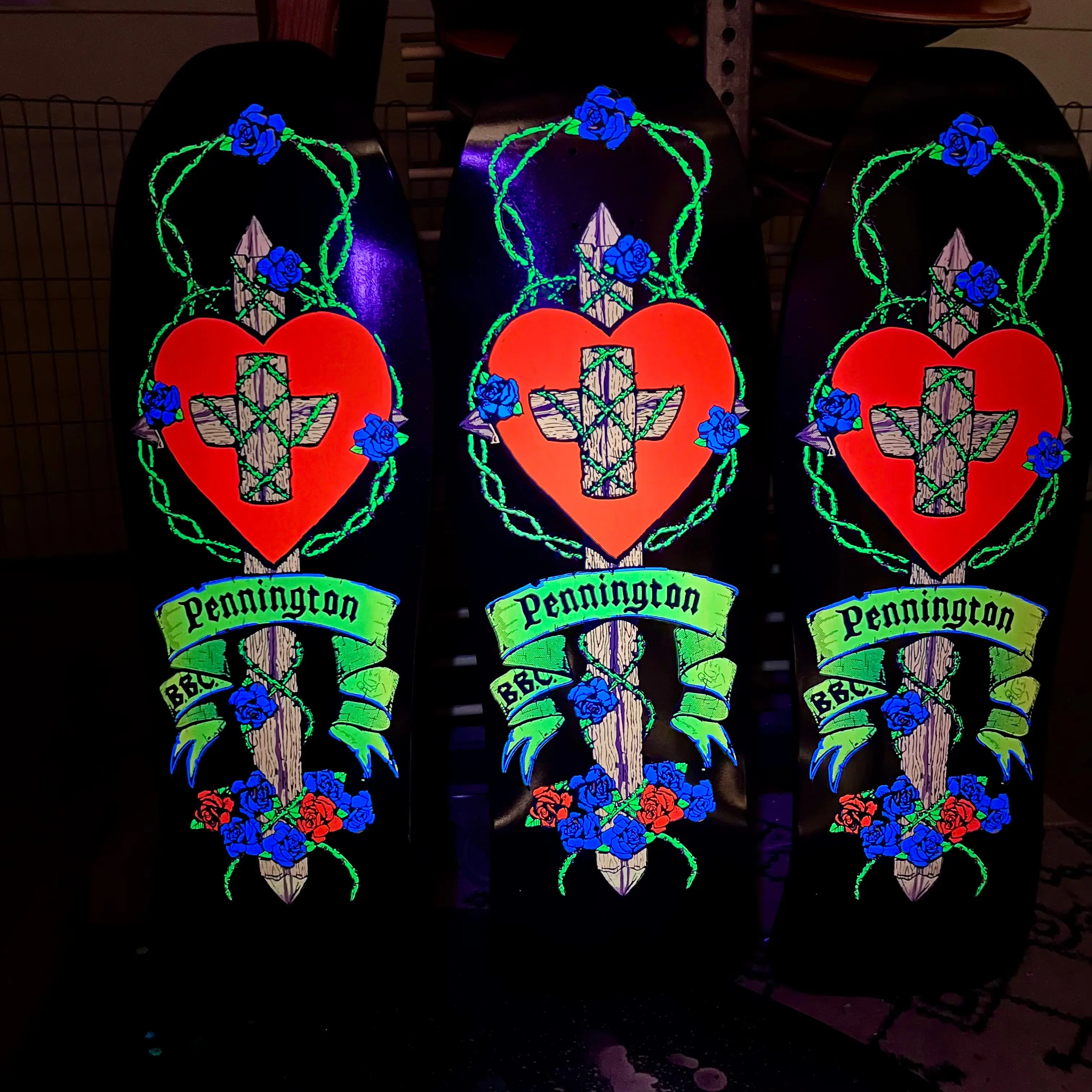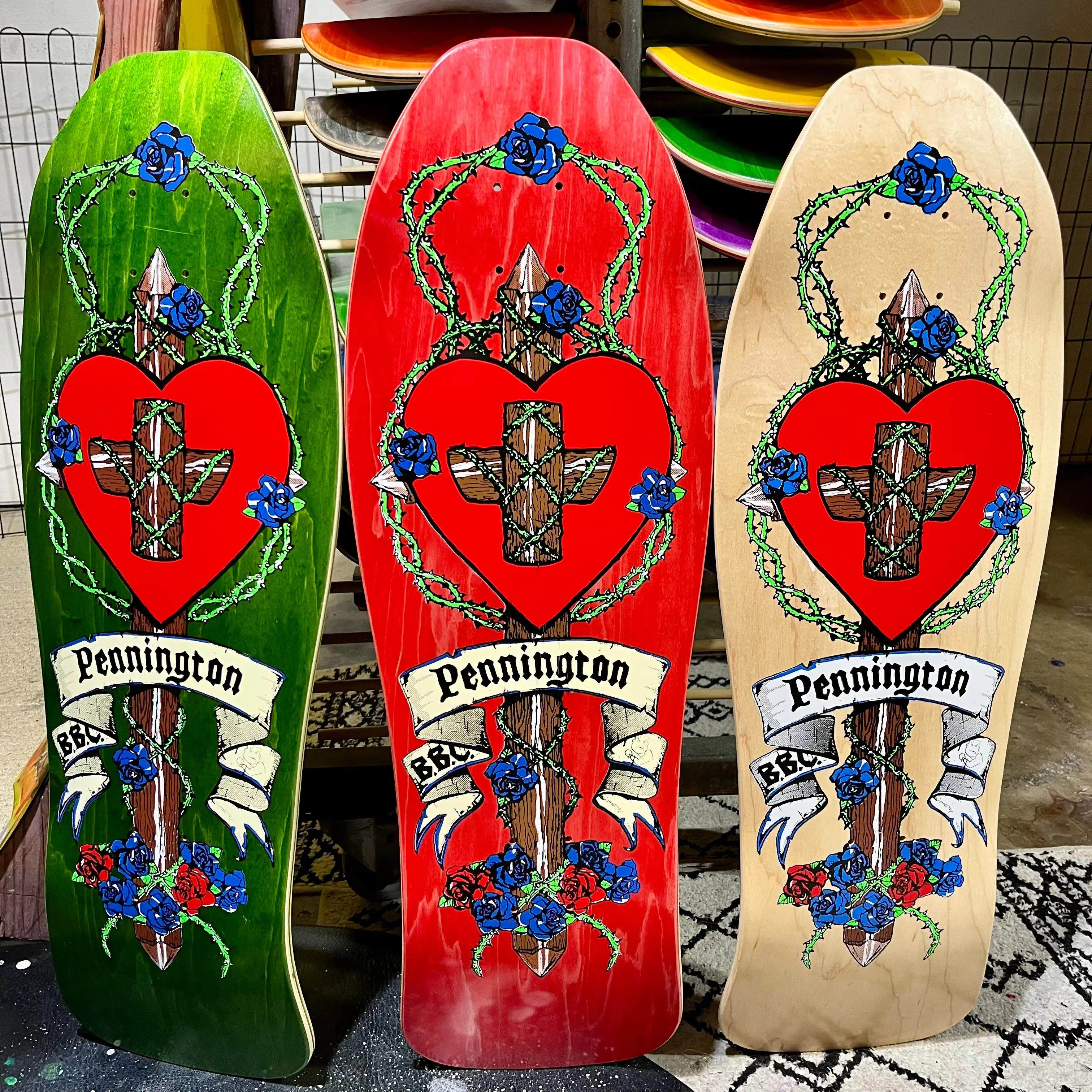 PLEASE NOTE: The photo shown is an ORIGINAL DECK and may not look exactly like the final graphic/shape. We HAND PAINT AND HAND SCREEN PRINT OUR DECKS. Colors, fades and unique errors or attributes in the graphics vary from one to the other, and the deck you receive may not look exactly like the picture provided. You are buying a DECK COLOR, not a GRAPHIC COLOR. Please ask if you have questions and ask for a pic of the deck you’ll receive if your unsure. We do not offer exchanges unless a product is defective.