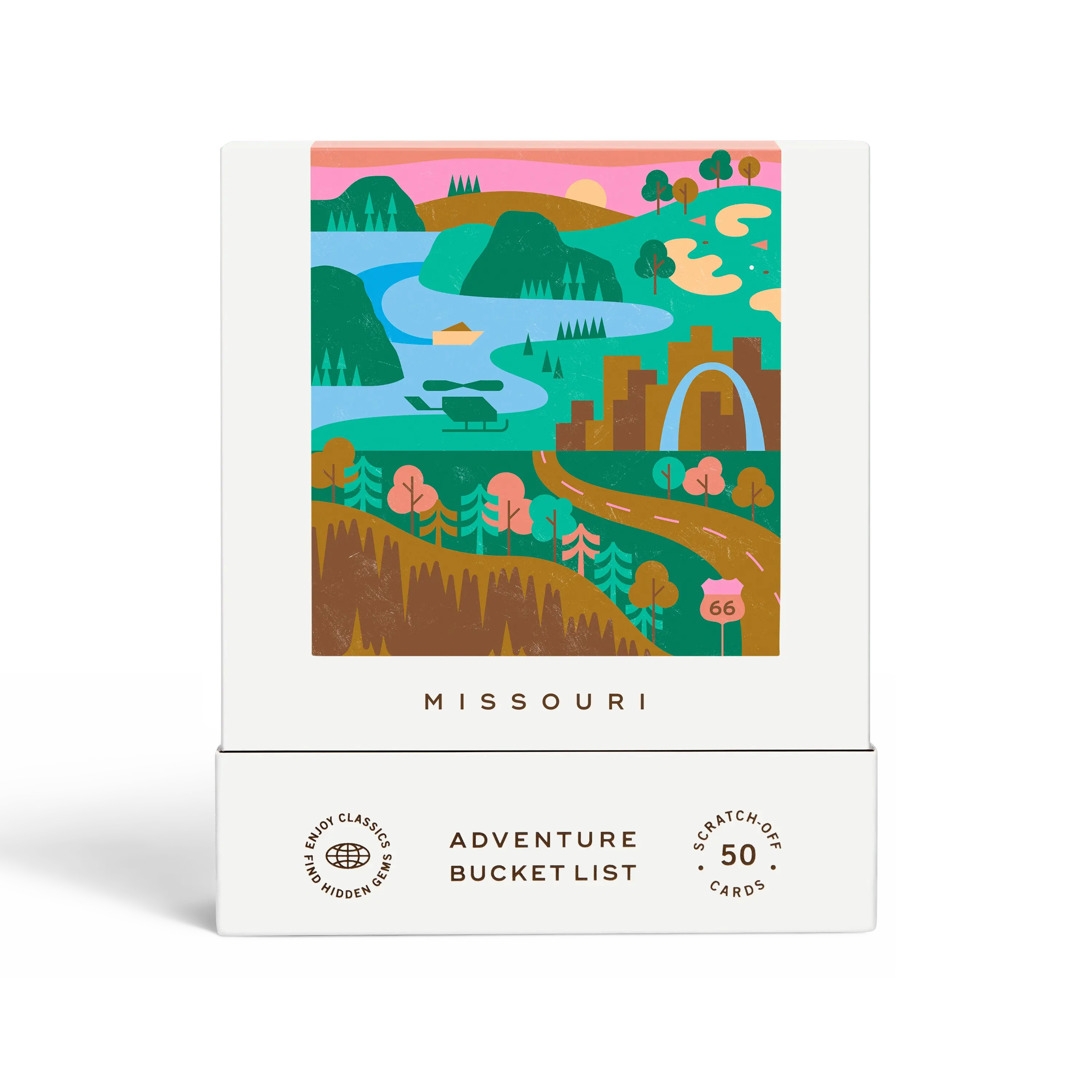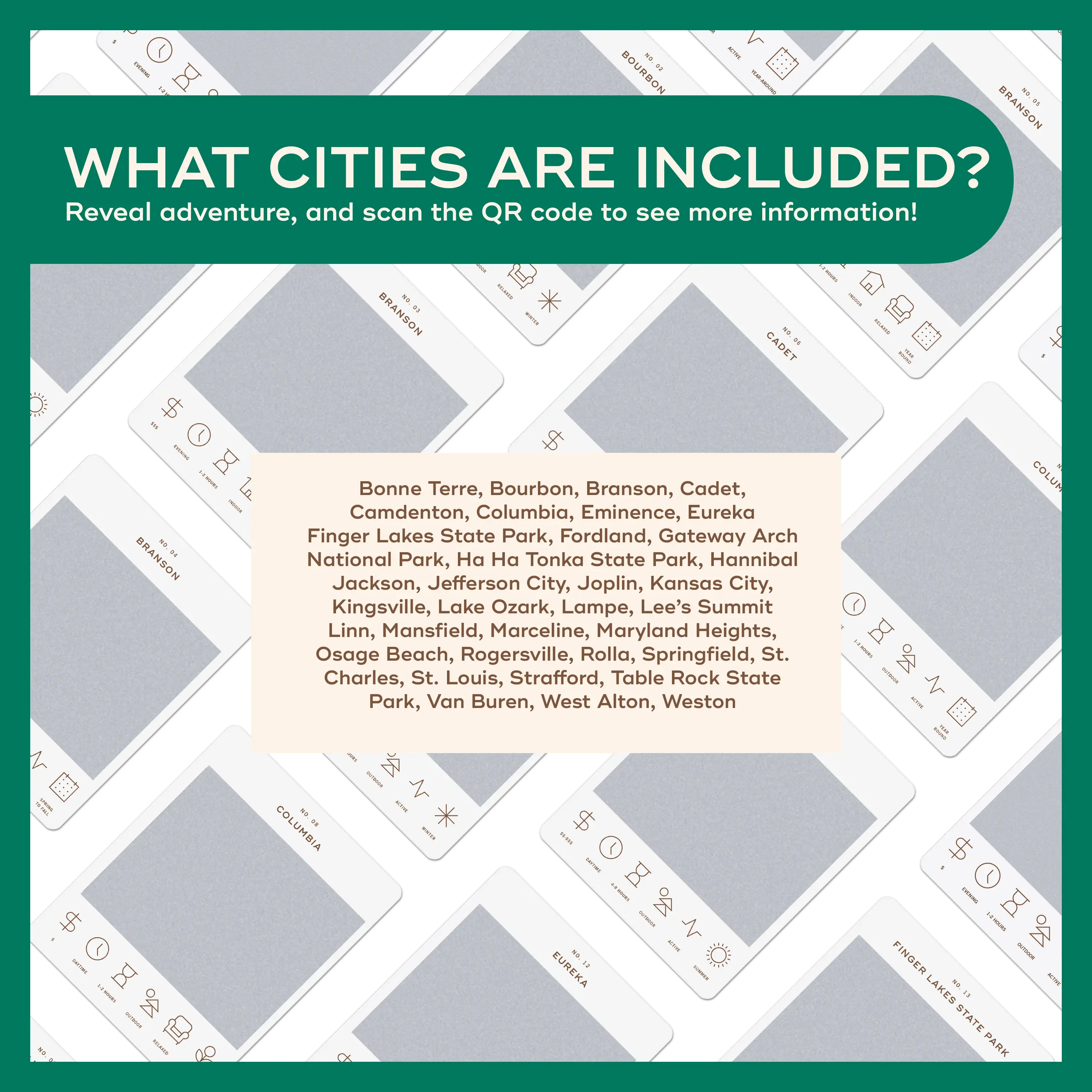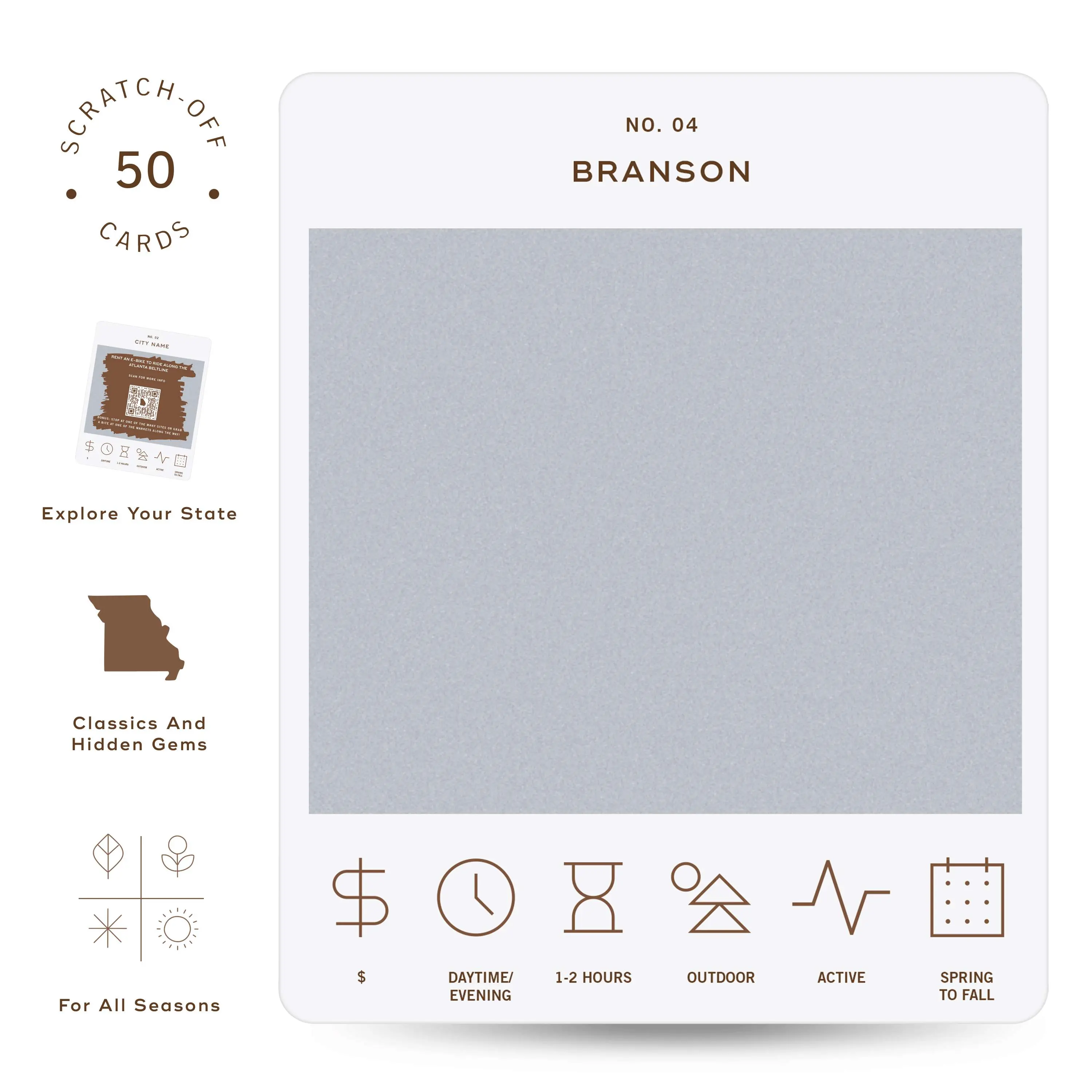 50 scratch off bucket list adventures around the state of Missouri. Pick a city that you want to explore, check out the icons at the bottom of the card to determine the season, cost, and time of day, and then scratch off the card to reveal your adventure!