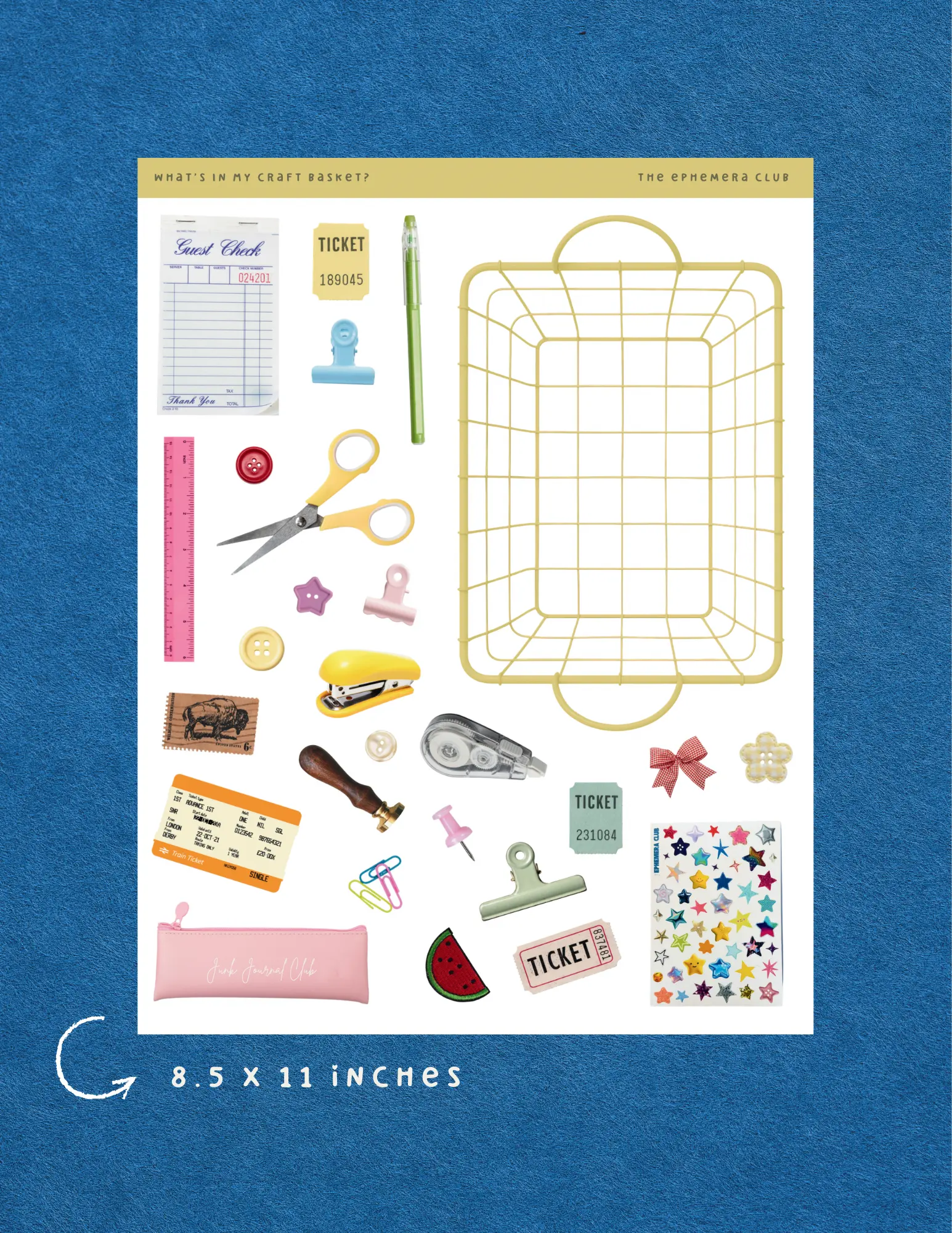 This 8.5 x 11 matte sticker sheet features a buildable basket along with mini craft-themed elements like scissors, tickets, clips, ruler, tape runner, stamps, push pins, and more — perfect for creating custom junk journal layouts, scrapbook pages, planner spreads, or collage scenes.