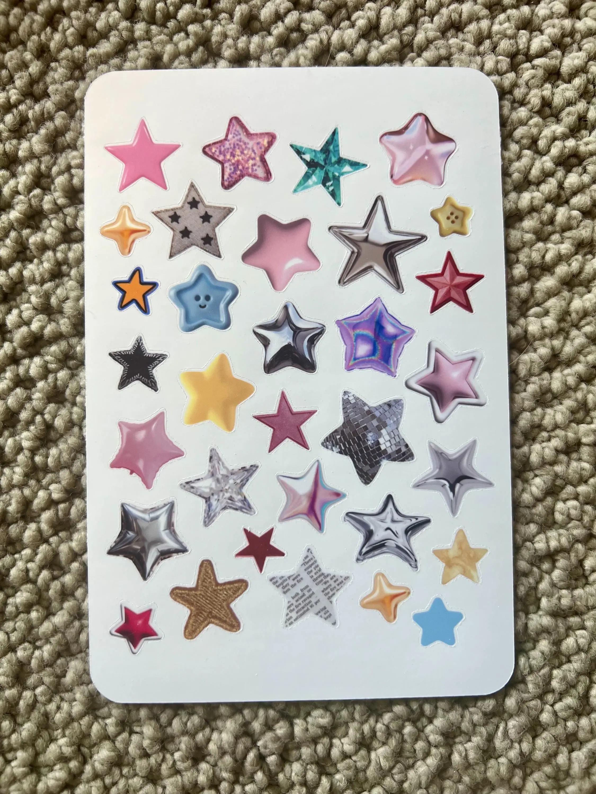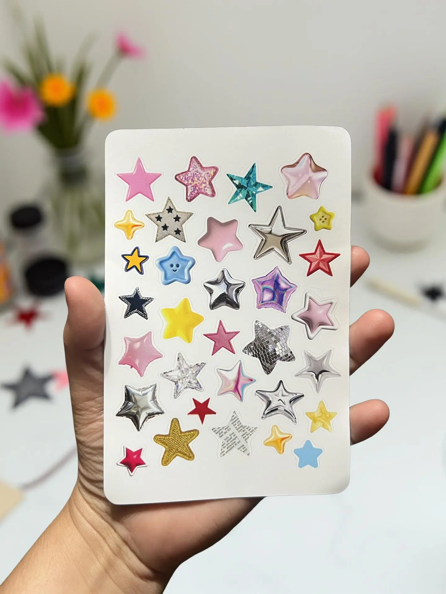 Shine bright with this colorful puffy star sticker sheet! Featuring 35+ unique star designs in vibrant colors, patterns, glitter, and metallic finishes, these mixed-media style stars are perfect for scrapbooking, journaling, planners, pen pal mail, or decorating anything that needs a bit of sparkle and fun.