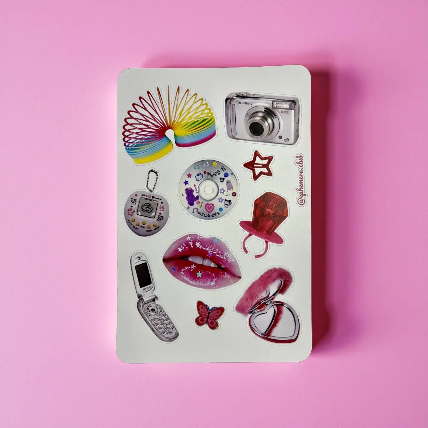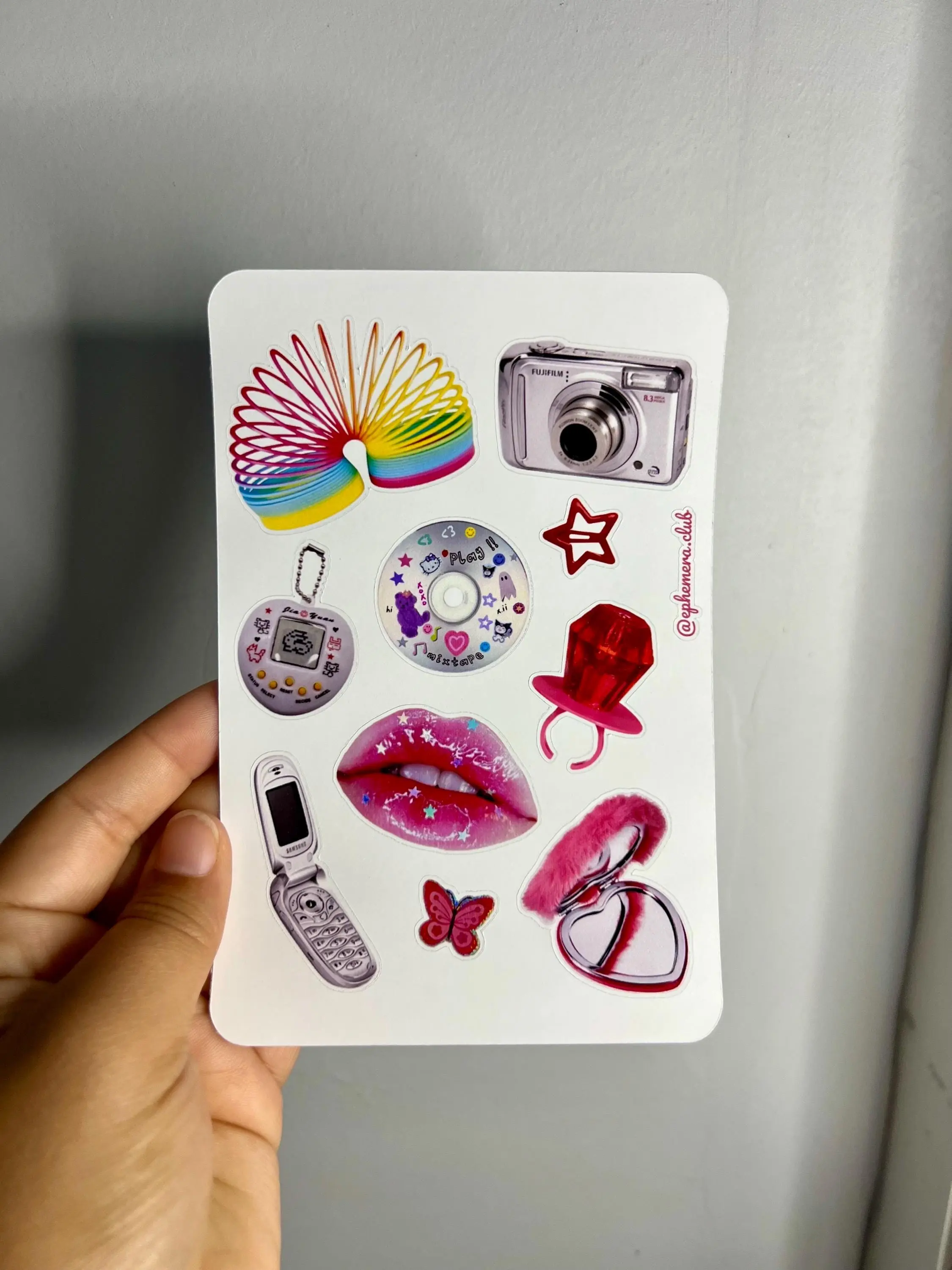 This Y2K-inspired sticker sheet is packed with iconic 2000s vibes — flip phones, slinkies, glitter lips, and more. Perfect for junk journaling, scrapbooking, penpal mail, or just decorating your journal!!!