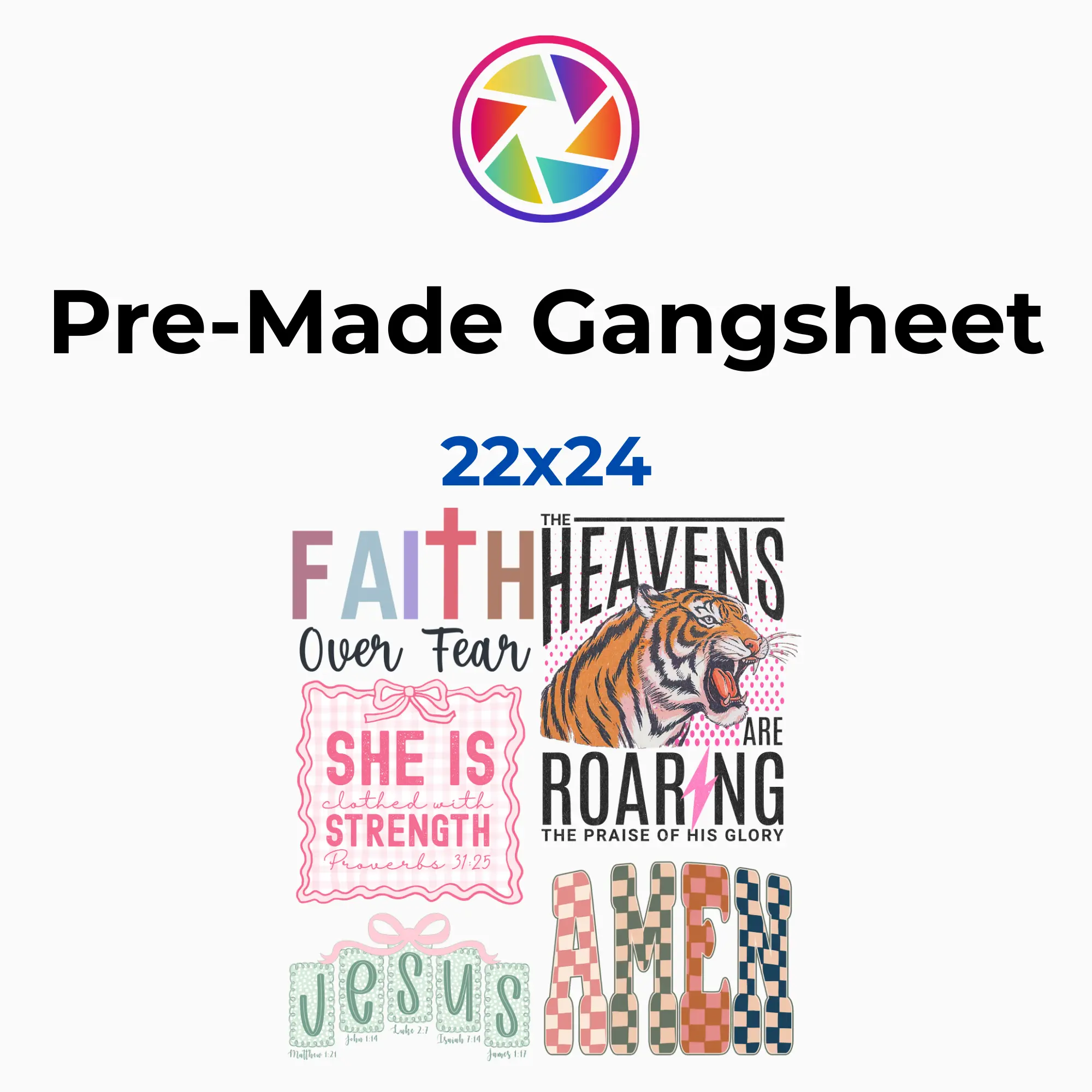 This sheet features multiple powerful designs including phrases like “Faith Over Fear,” “The Heavens Are Roaring,” “She Is Strength,” and “Amen” — all styled with trendy fonts, strong graphics, and eye-catching details. Everything is laid out and ready to press so you can maximize your prints and profits with ease.