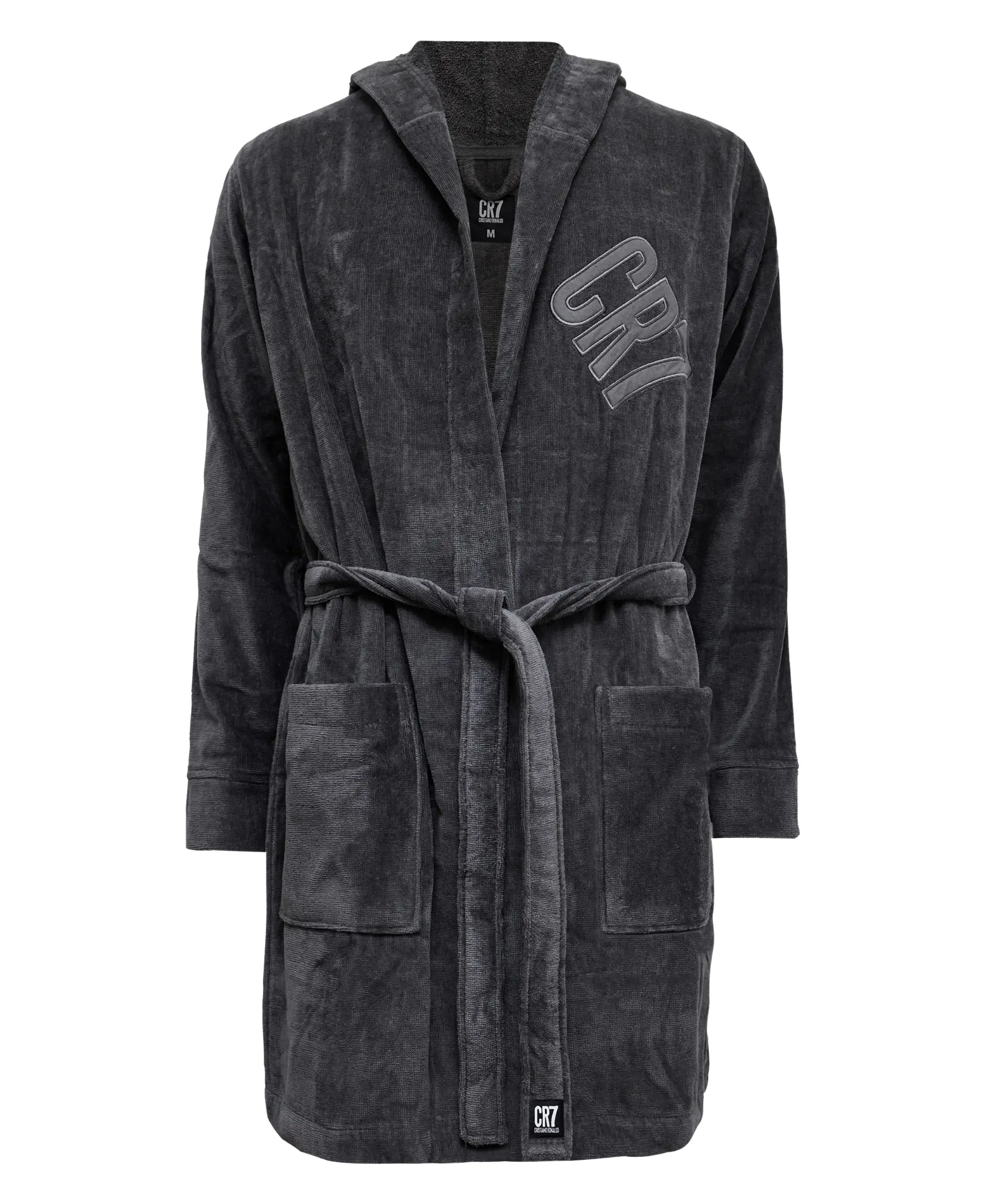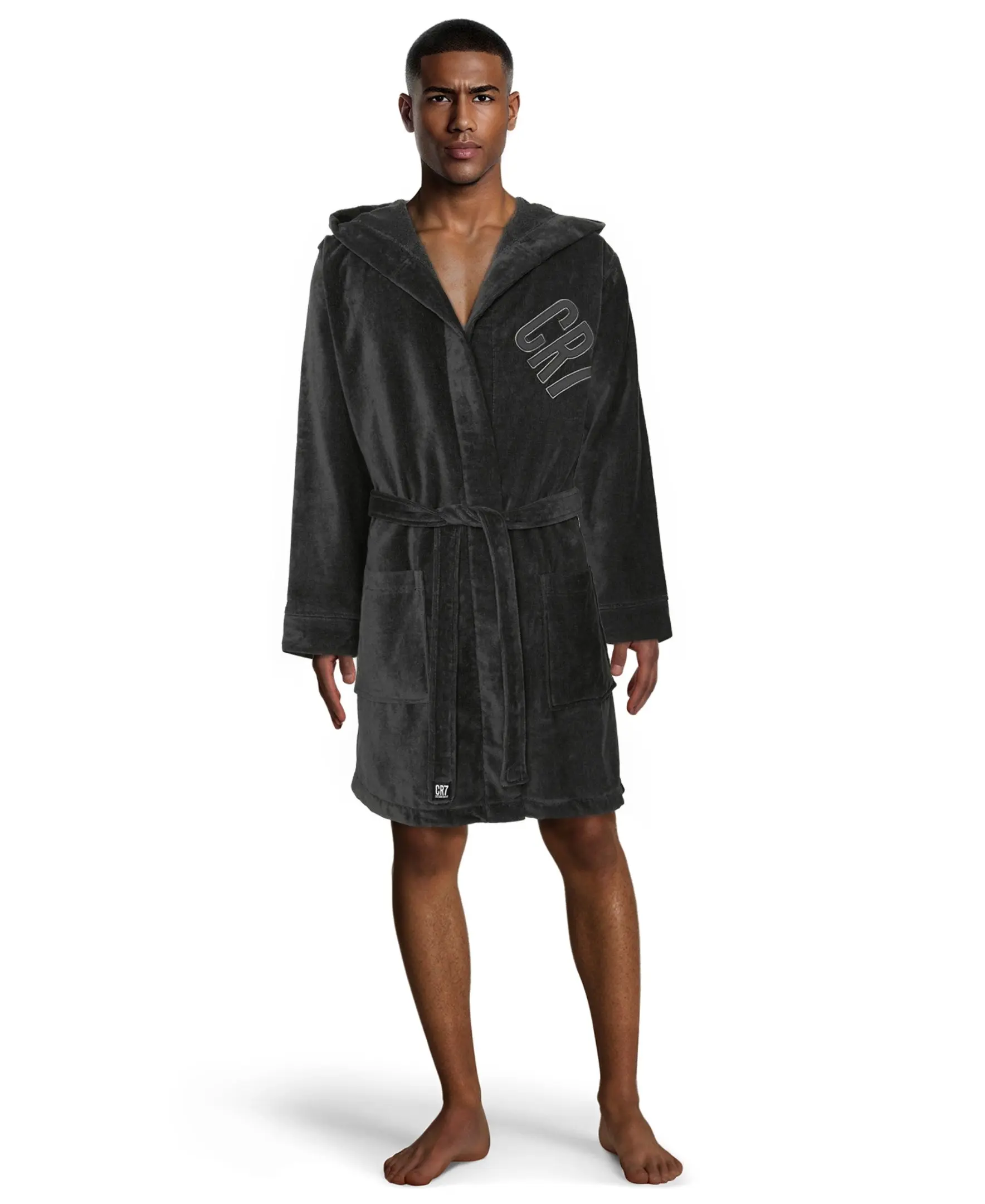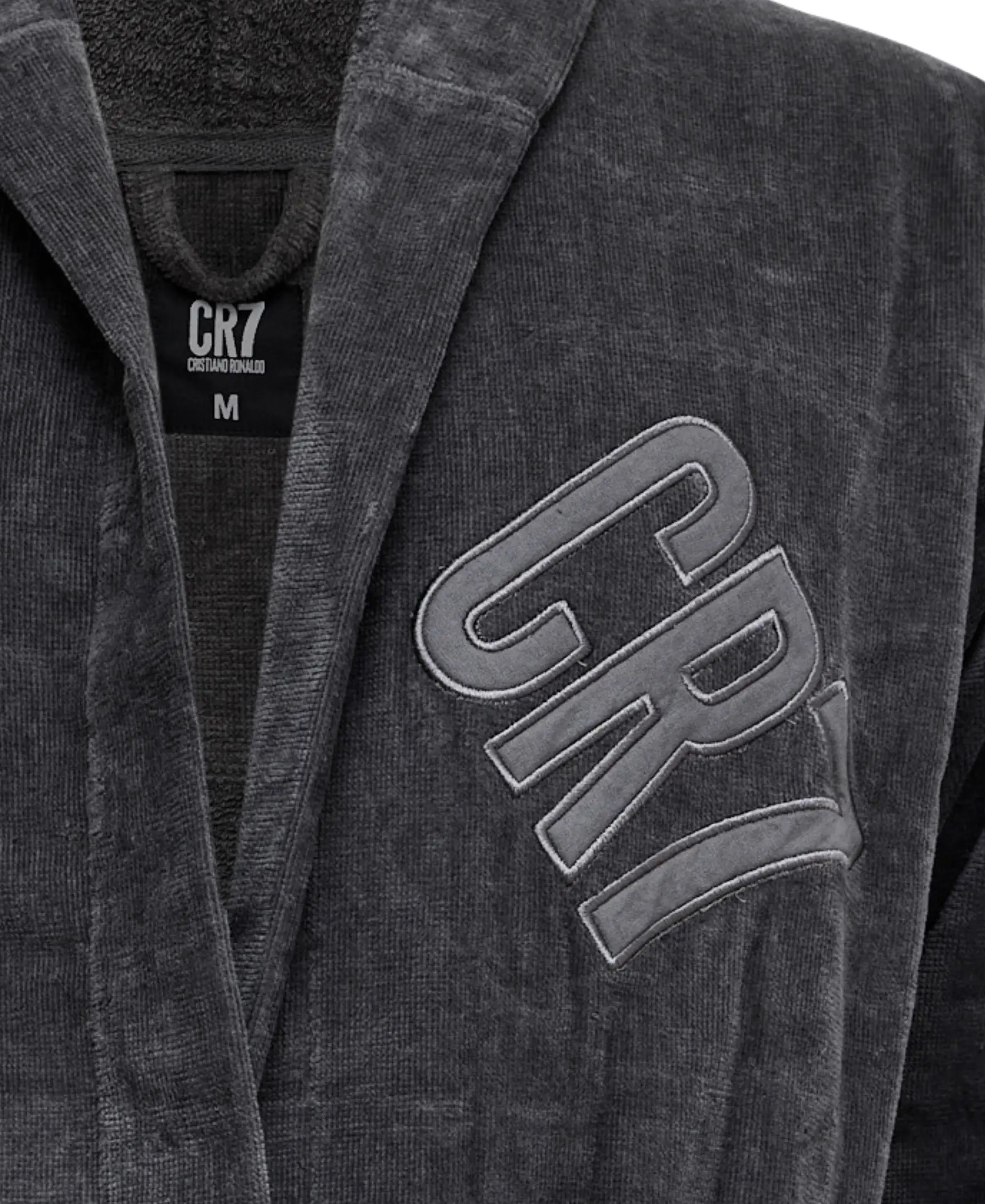 CR7 Men's plush 100% terry cotton bathrobes. This long sleeve, 2-pocket medium weight robe typically sits mid-thigh. Sleeve width is designed with a slight contour for a modern, athletic cut. Robe features 'CR7' logo on left chest and is machine washable.