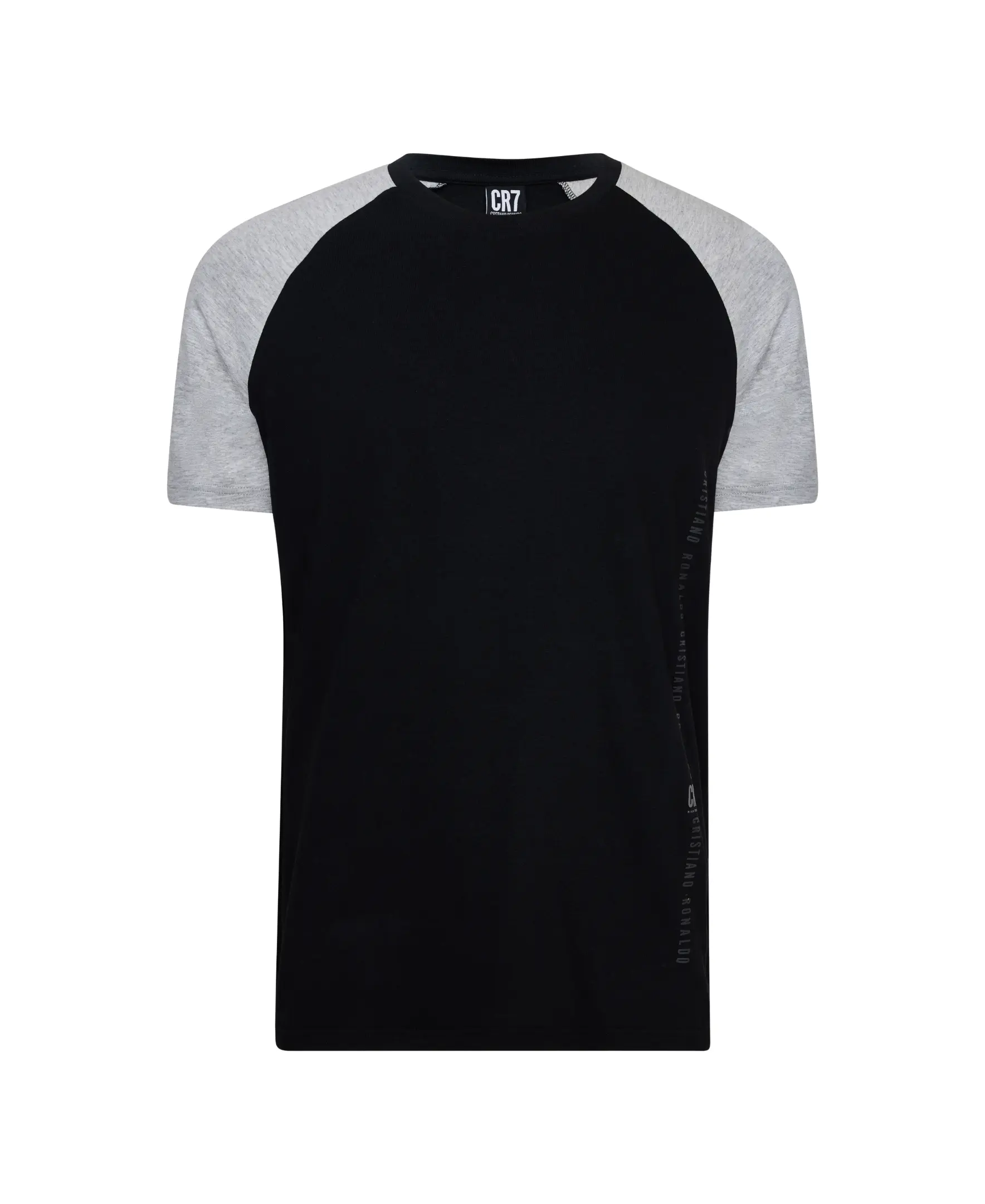 Colors: black, light grey and white logo. Garment has repeat Cristiano Ronaldo black on black imprint running left side of t-shirt and shorts.