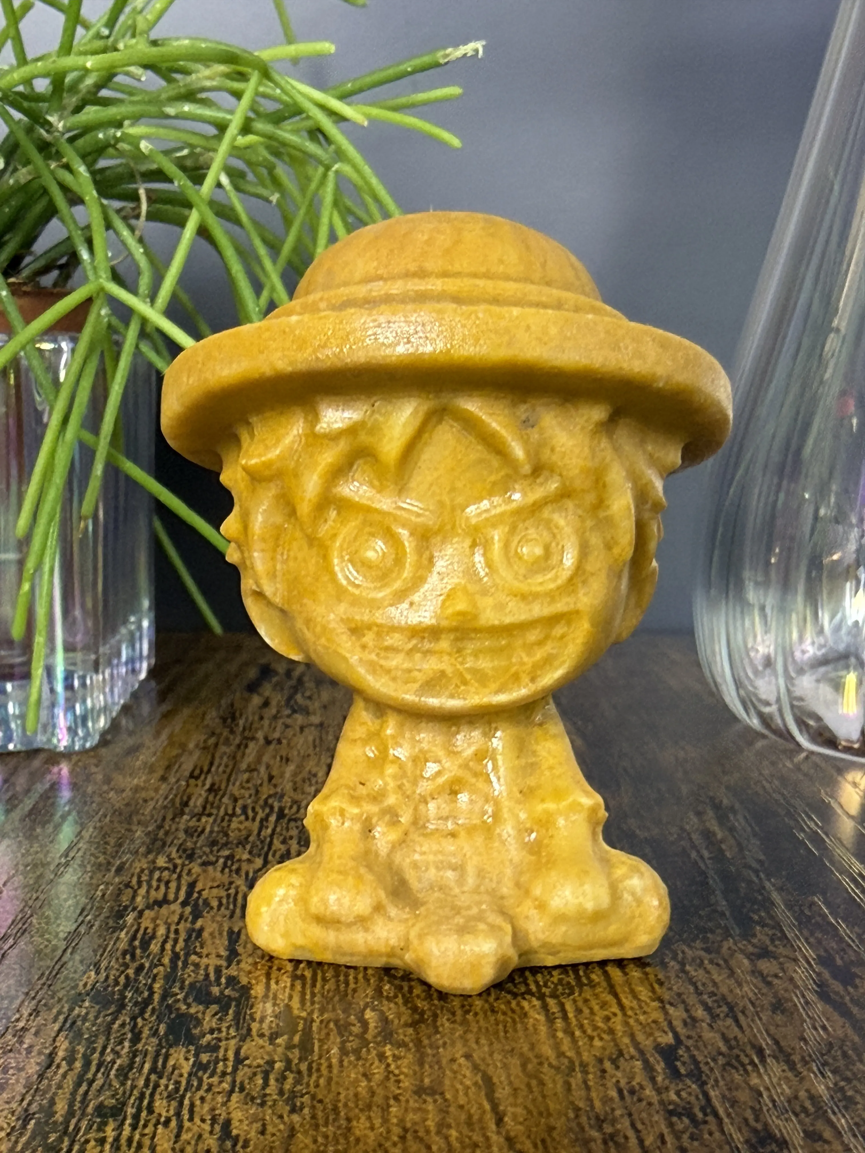 The carving captures a playful, stylized version of the iconic straw-hat character, complete with an oversized hat and expressive facial features. Its rounded proportions and cute design make it a standout piece for anime lovers and collectors alike.