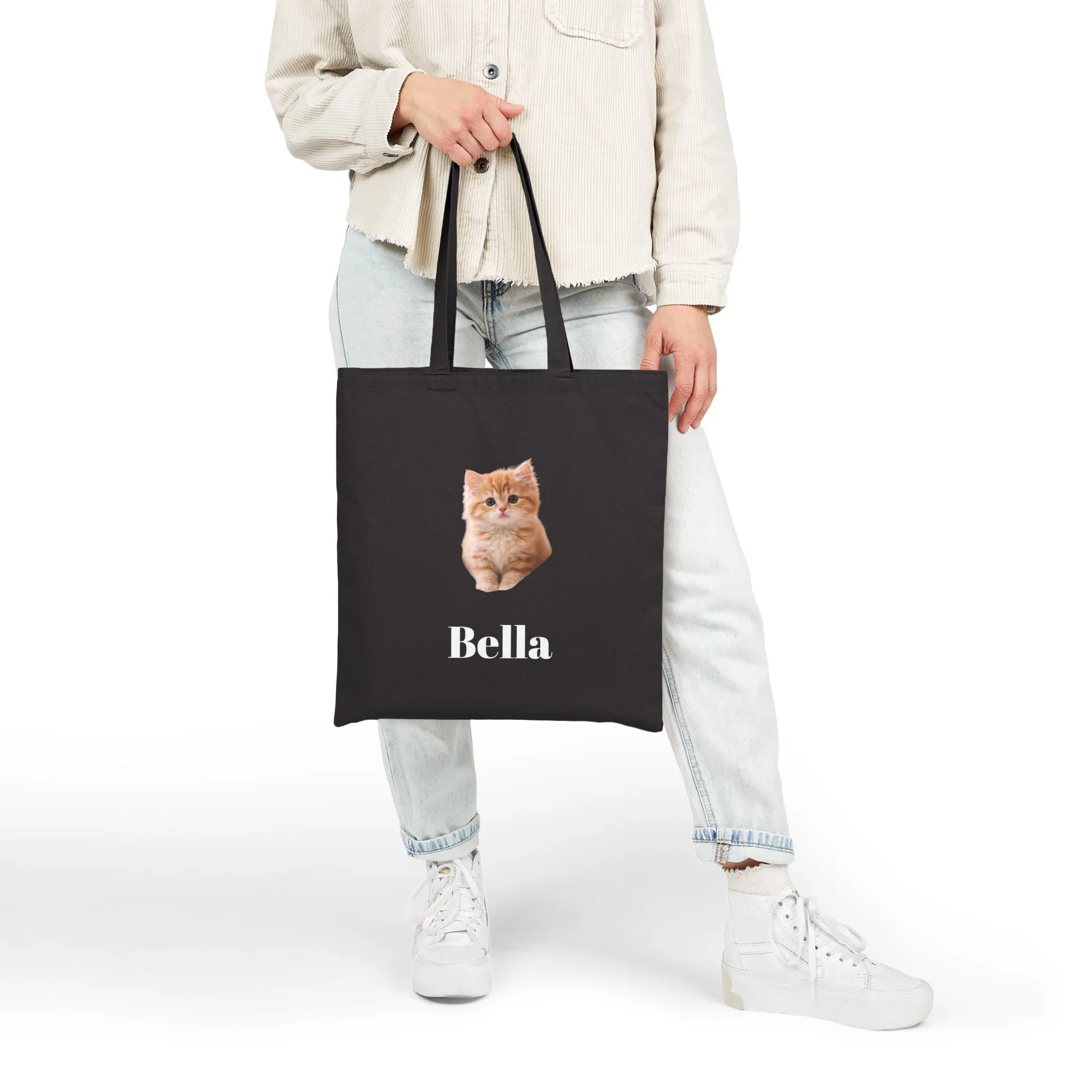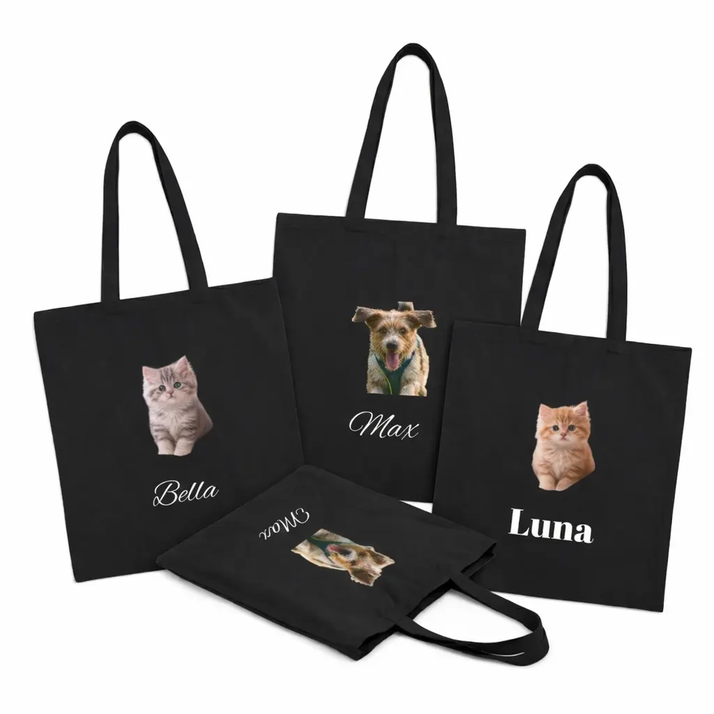 Our collection features stylish, durable canvas tote bags that are as unique as your furry family members. Each bag can be customized with a high-resolution portrait of your beloved pet and their name, printed with care to showcase every charming detail. From the soulful eyes of your kitty to the floppy-eared joy of your pooch, these totes are a beautiful tribute to the bond you share.